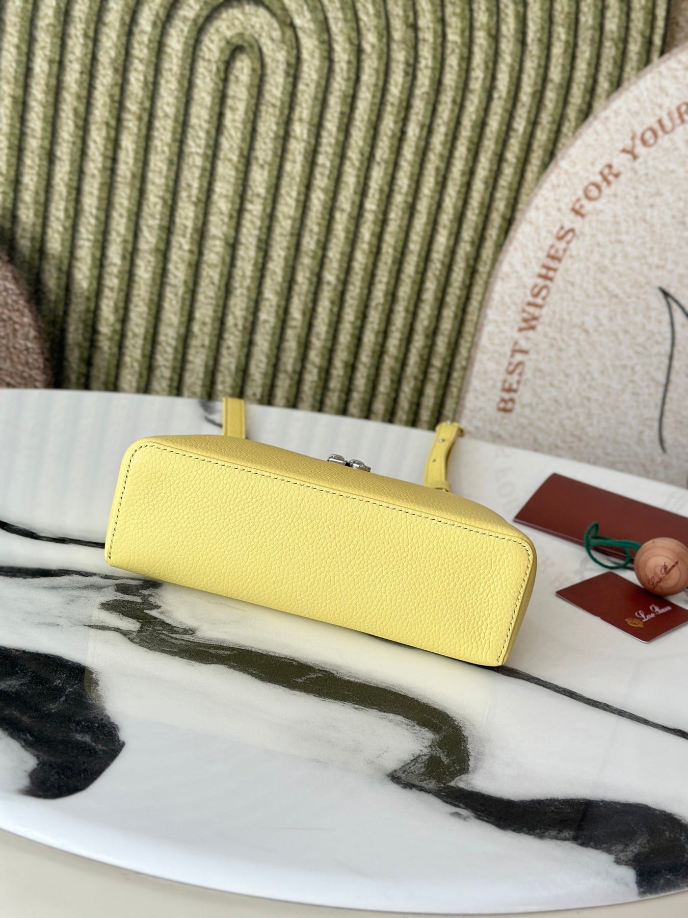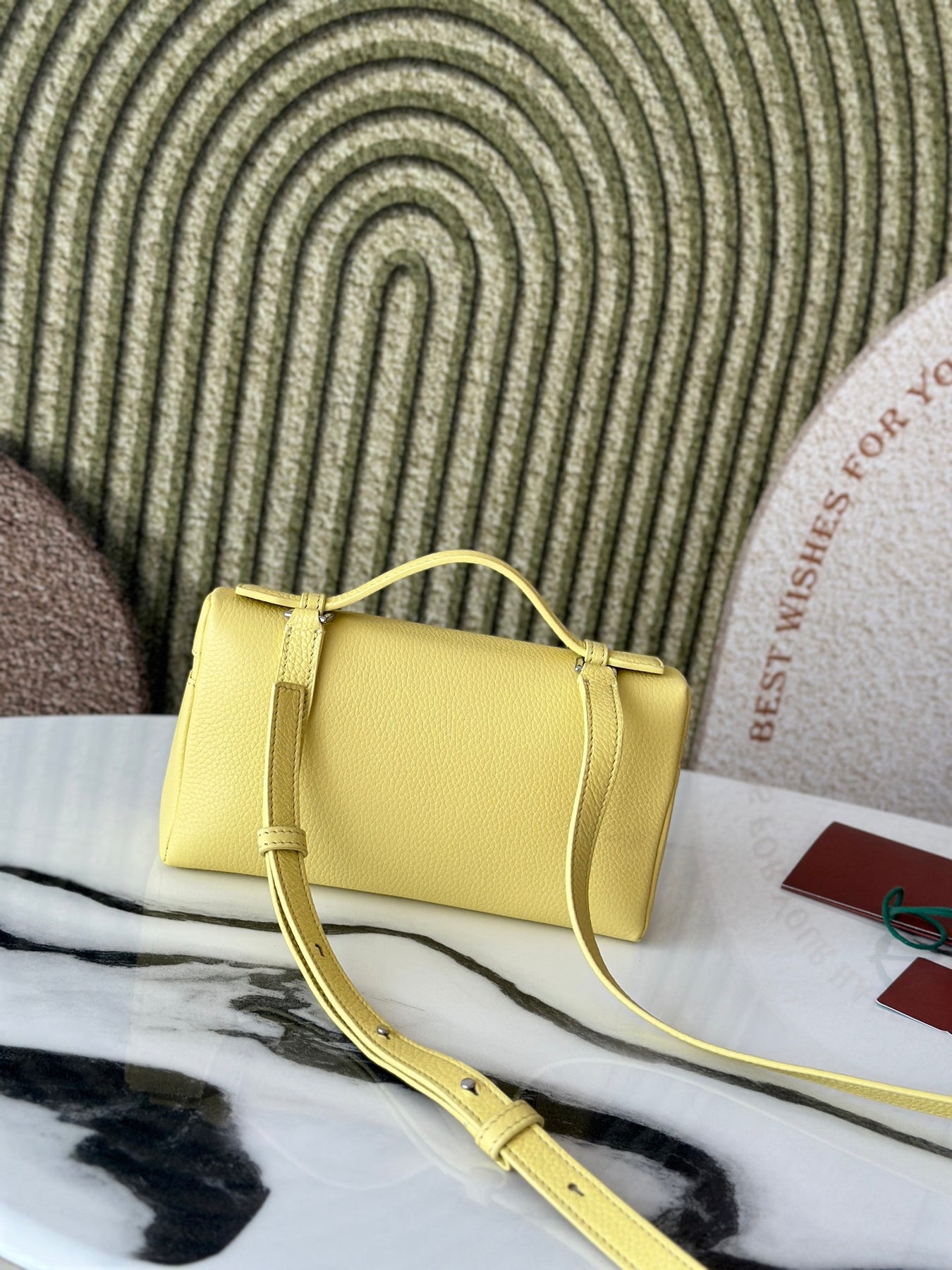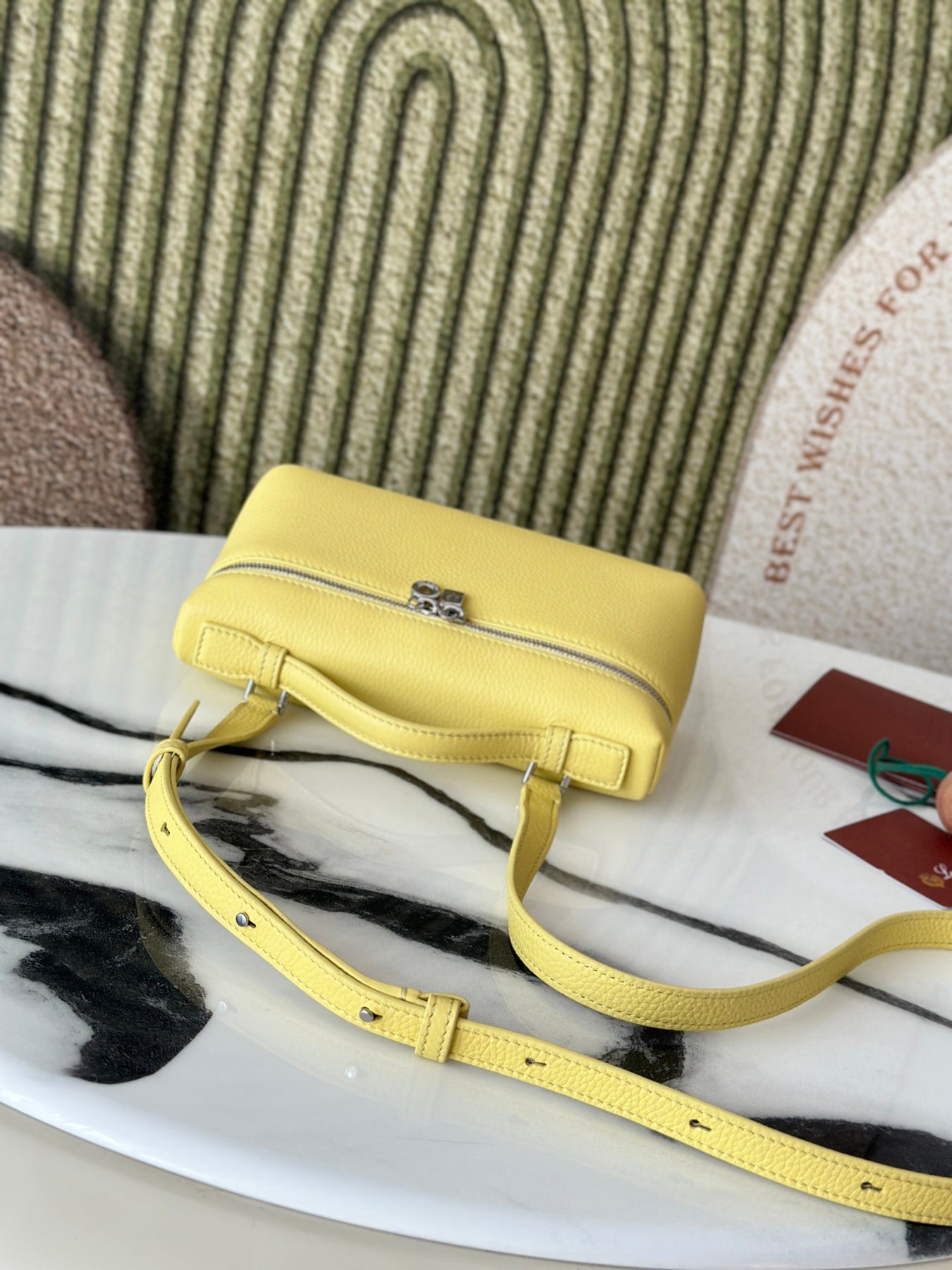 Introducing the L19 Chick Yellow Handbag, a stylish and versatile accessory designed for both functionality and fashion. This upgraded model features a chic silver buckle and is crafted from premium Loro Piana materials. With an extra pocket for added convenience, this handbag seamlessly transitions from a shoulder strap to a crossbody bag.