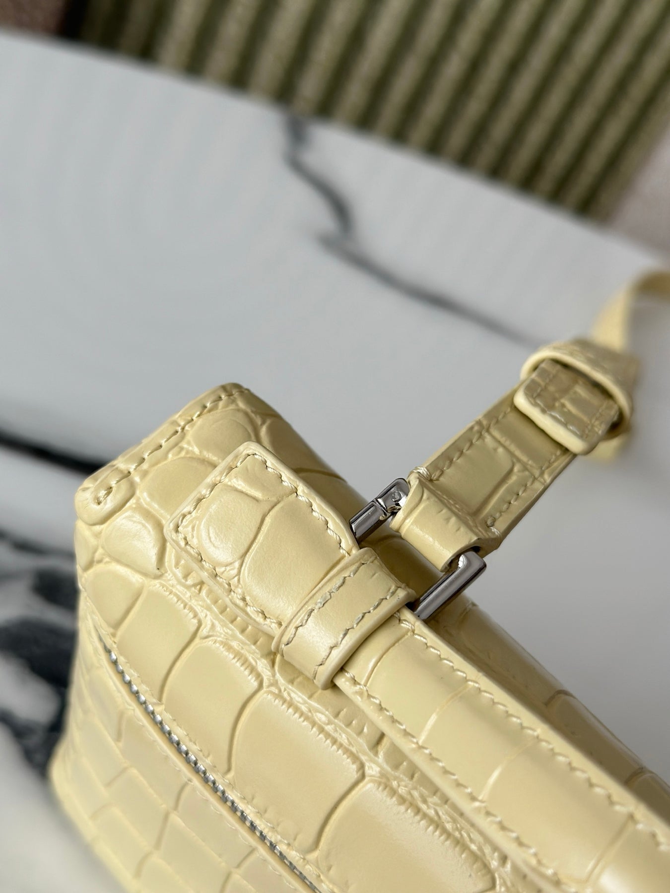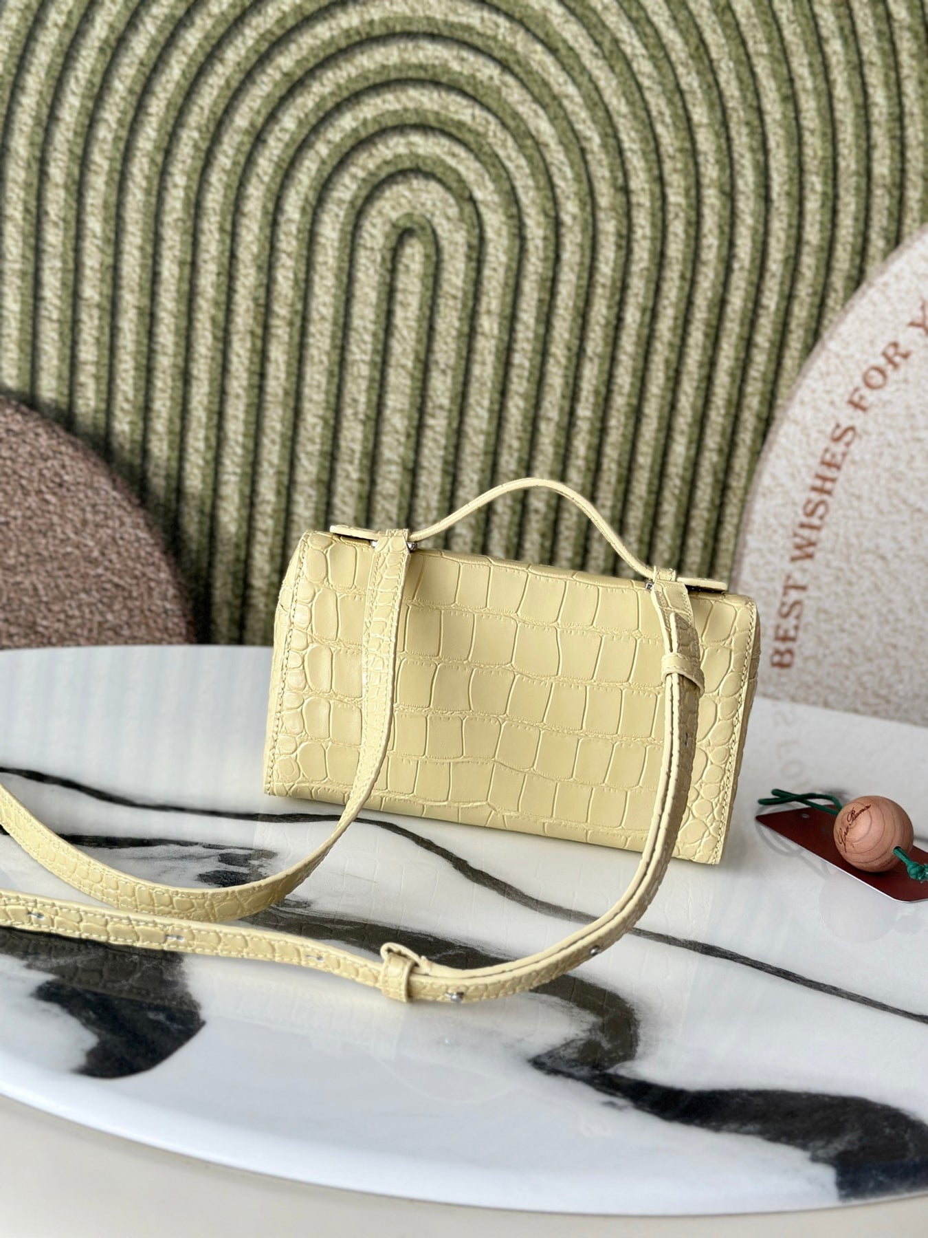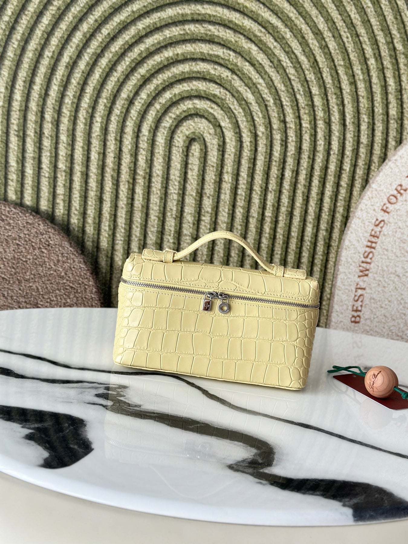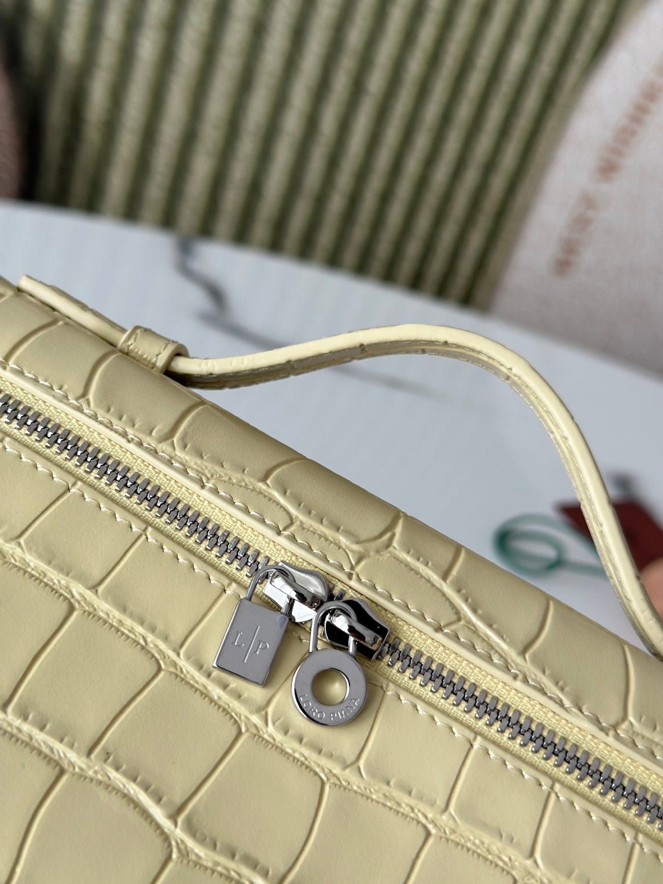 Introducing the Loró Piana Extra Pocket L19 Series Handbag, crafted from first-layer cowhide and featuring a luxurious crocodile pattern in a vibrant chick yellow. This second-generation buckle design embodies elegance without the need for complex styling. Its smooth, simple silhouette is reminiscent of a chic cosmetic case, making it a striking addition to any outfit.