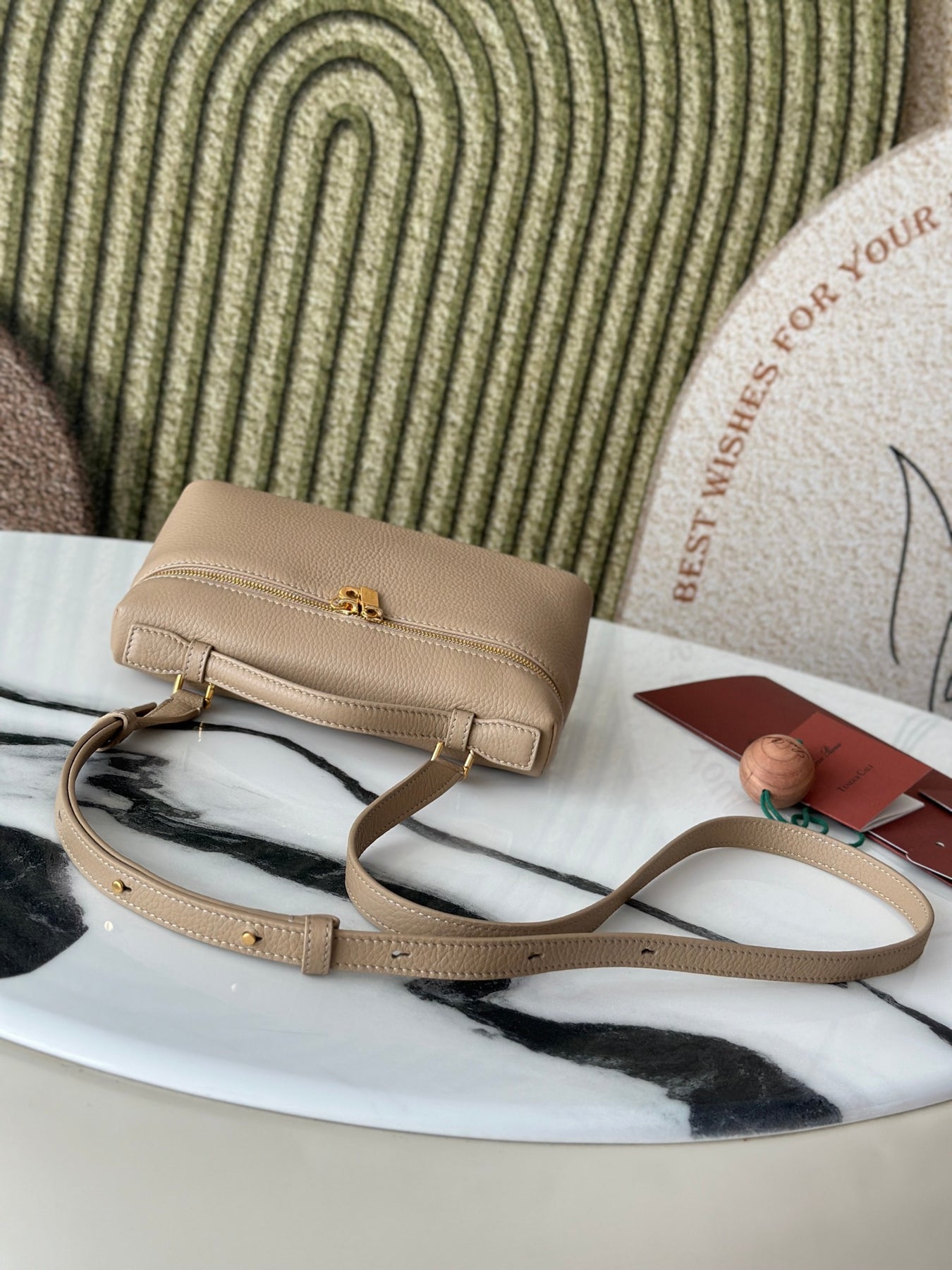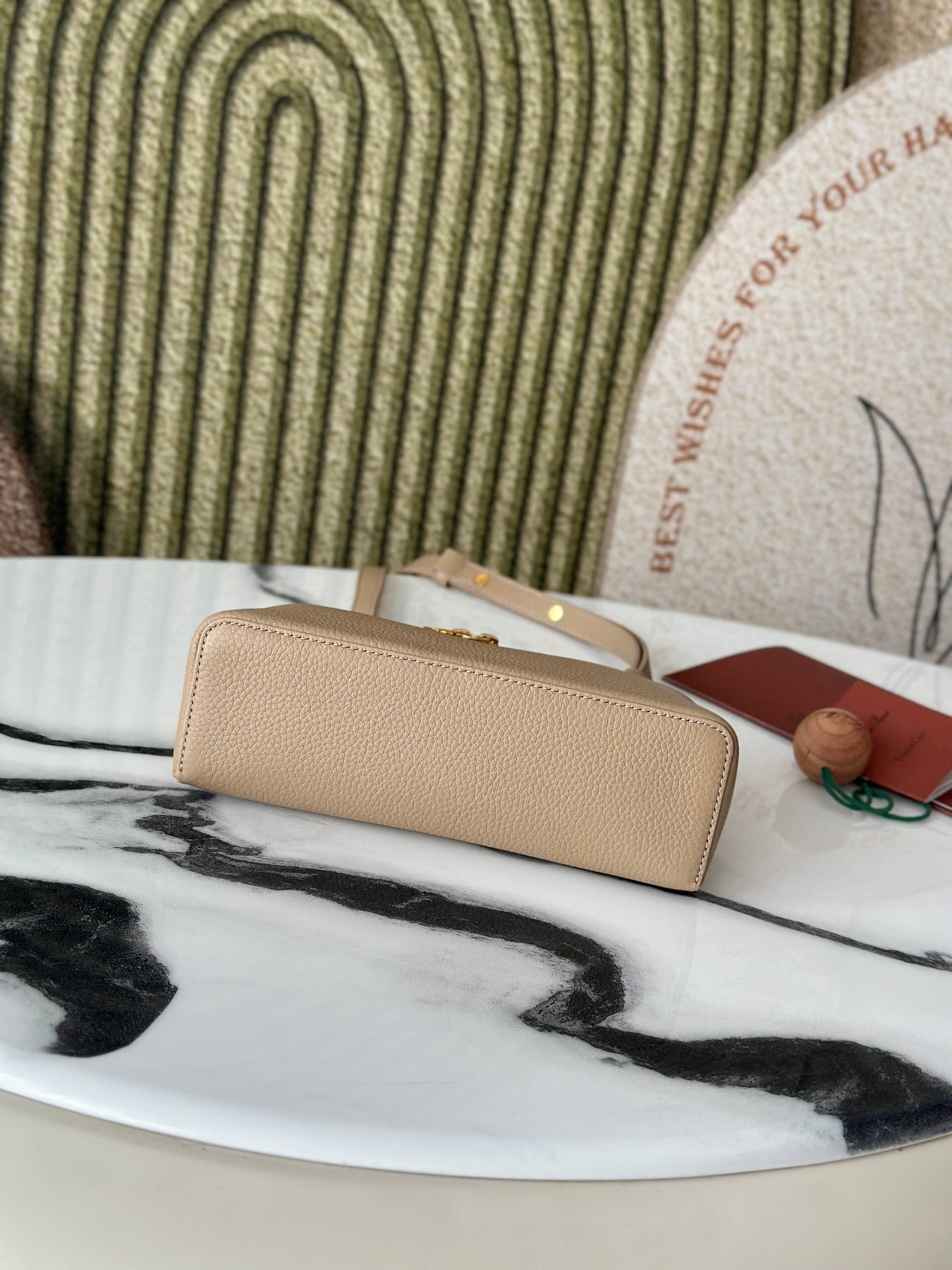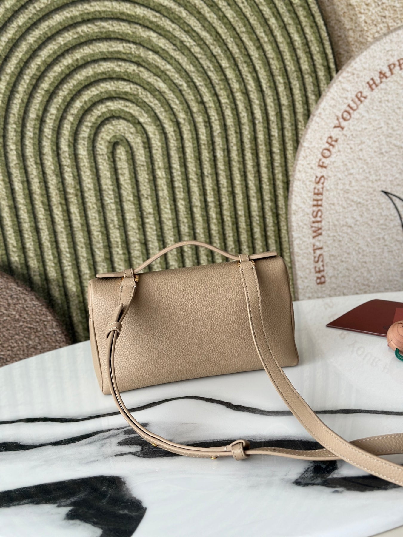 Introducing the L19 Handbag in a sophisticated milk tea color, enhanced with a sleek gold buckle for an elevated aesthetic. This versatile handbag can be worn as a crossbody or shoulder bag and features a unique design with an extra pocket from Loro Piana, adding practicality to its elegance.