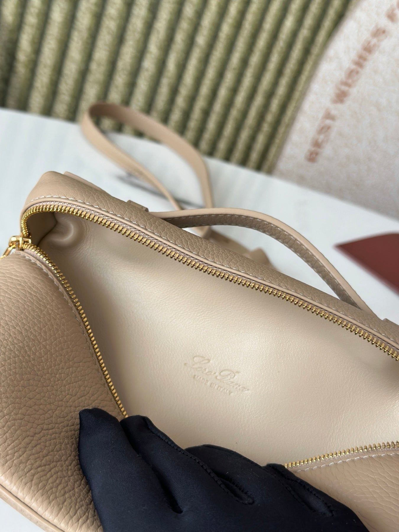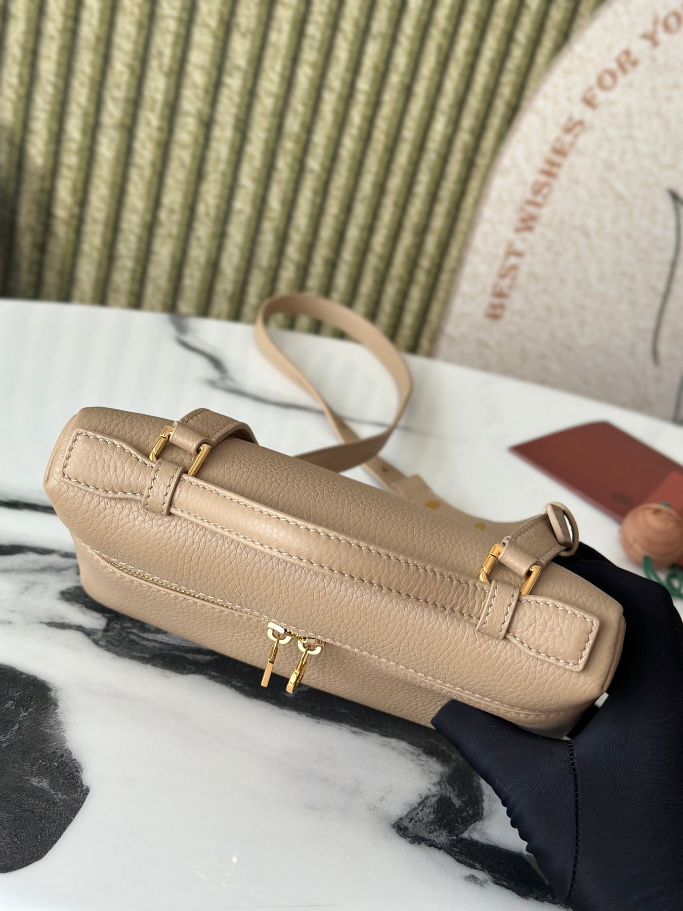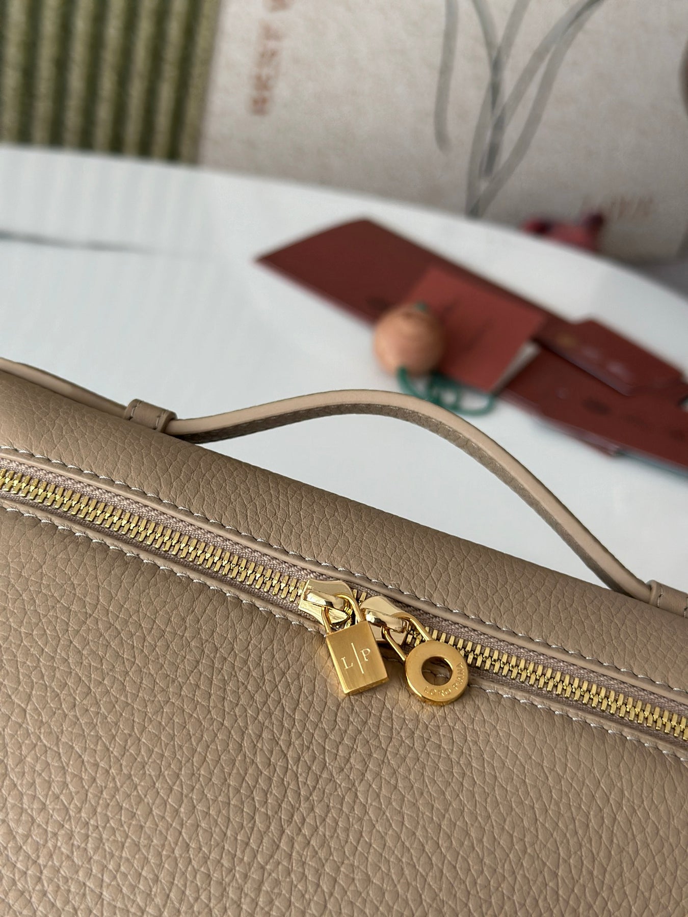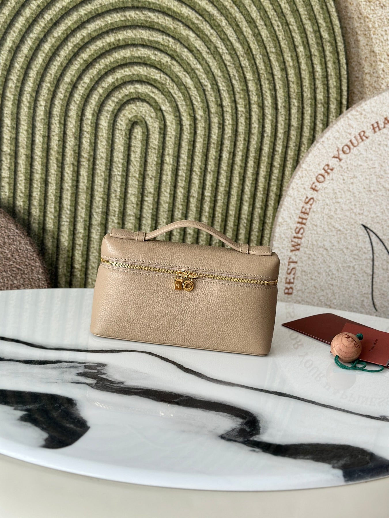 Introducing the L19 Handbag in a sophisticated milk tea color, enhanced with a sleek gold buckle for an elevated aesthetic. This versatile handbag can be worn as a crossbody or shoulder bag and features a unique design with an extra pocket from Loro Piana, adding practicality to its elegance.