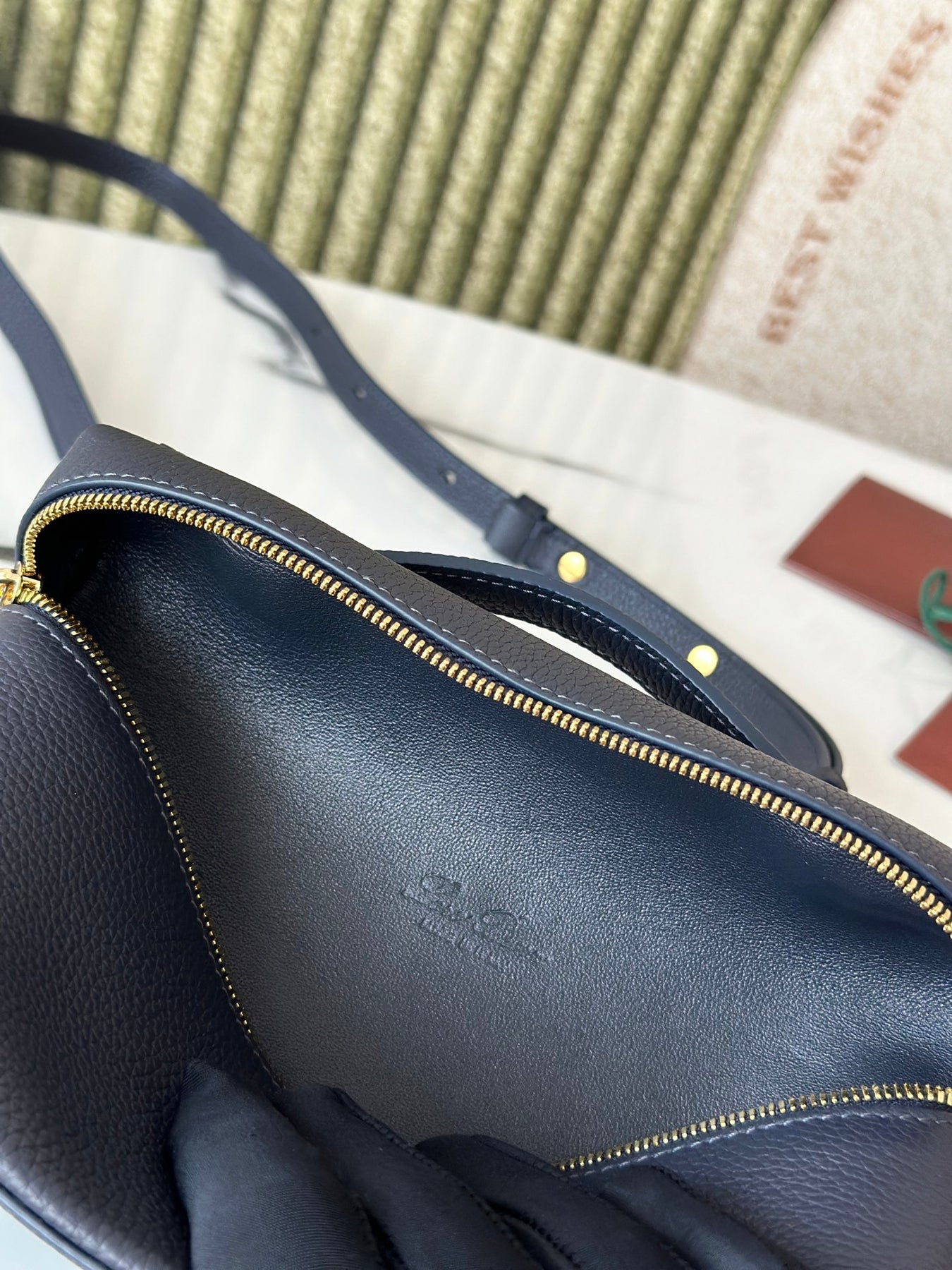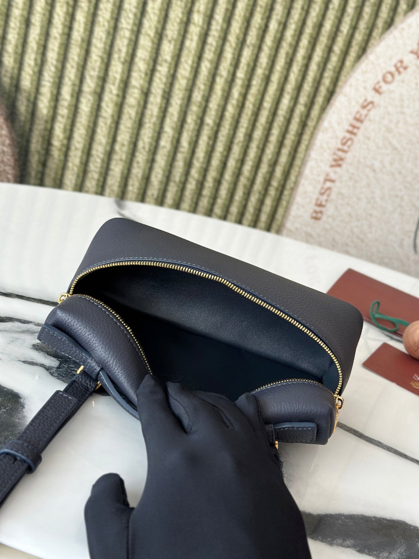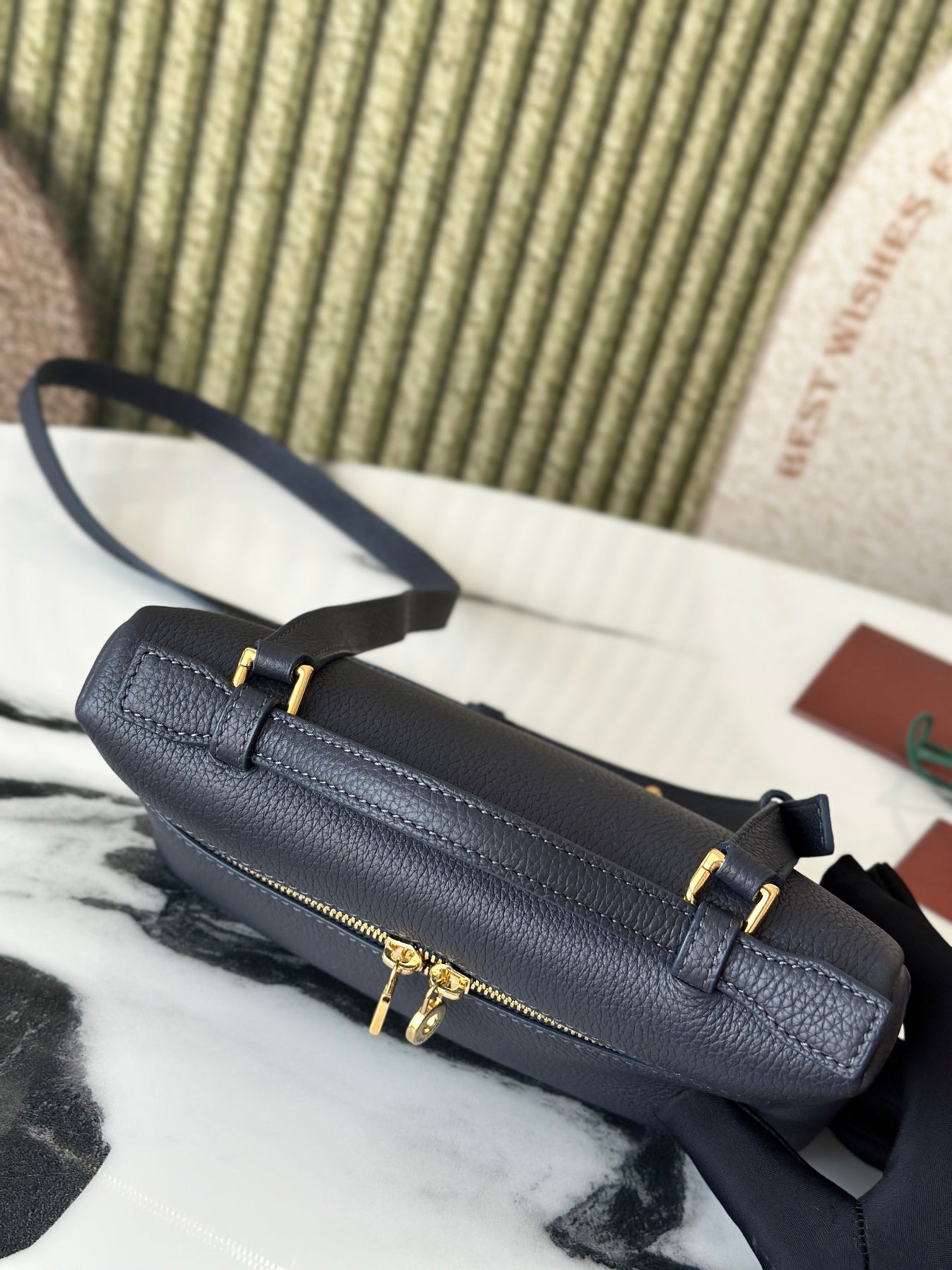 L19 Navy Blue Handbag with Gold Buckle and Extra Pocket