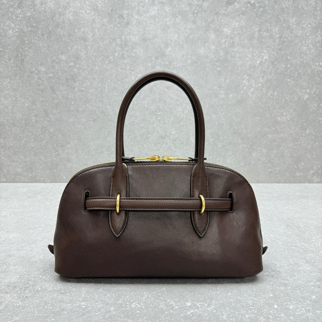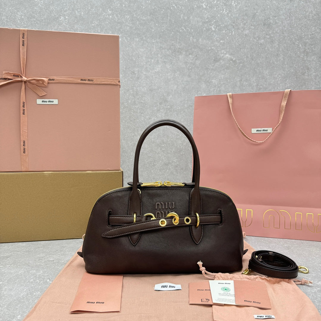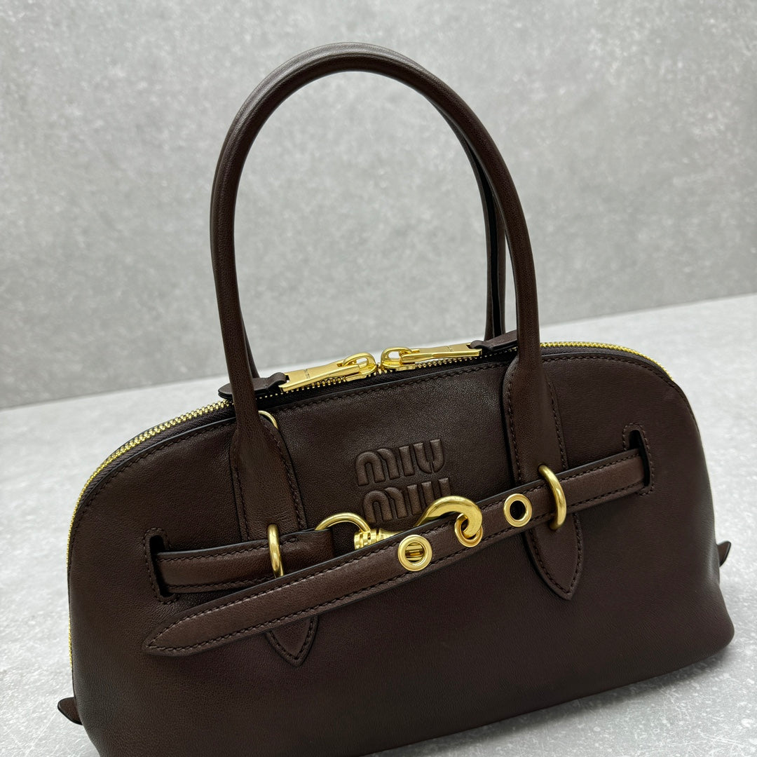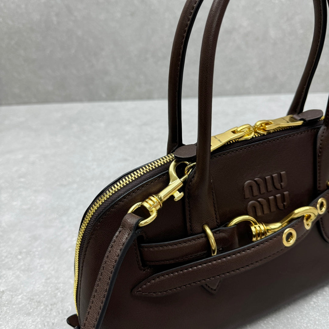 Introducing the MIUMI*Aventure Large Two-Way Zipper Bag in a classic briar color. This stylish bag features a retro design that merges nostalgia with modern elegance. Crafted from soft sheepskin, it offers a relaxed and comfortable feel, complemented by a fashionable arc shape.