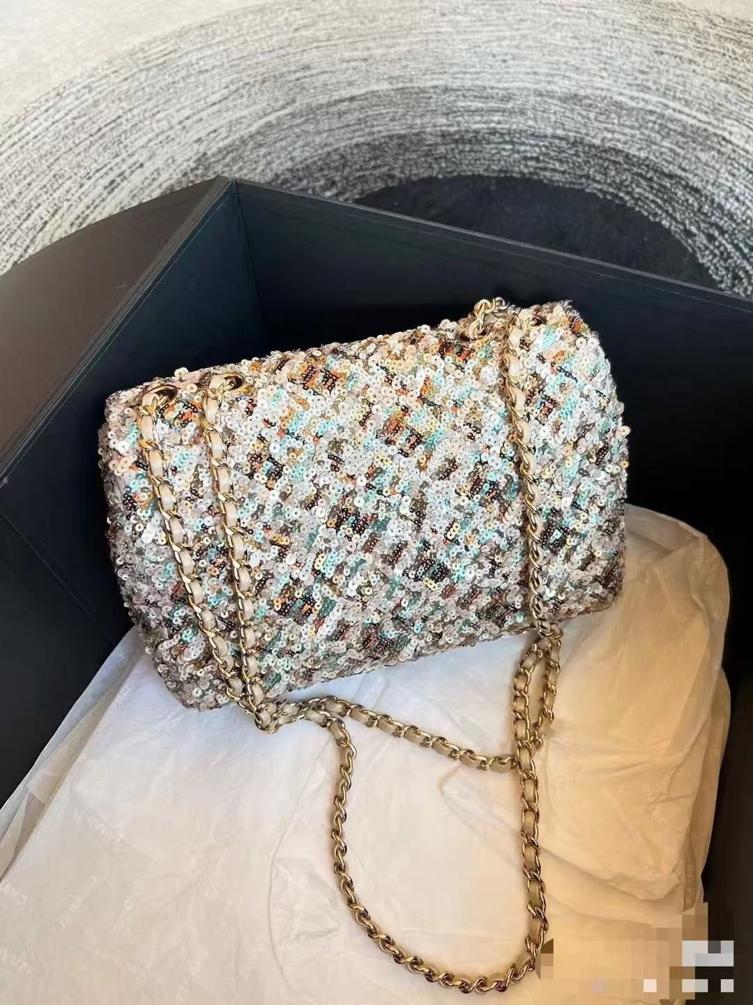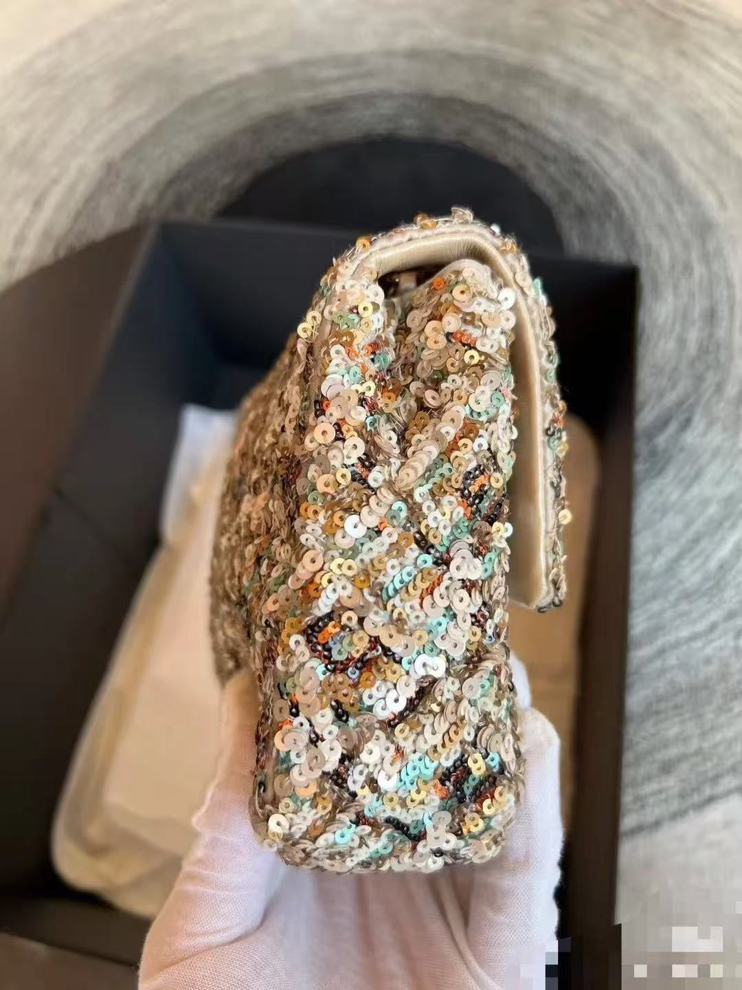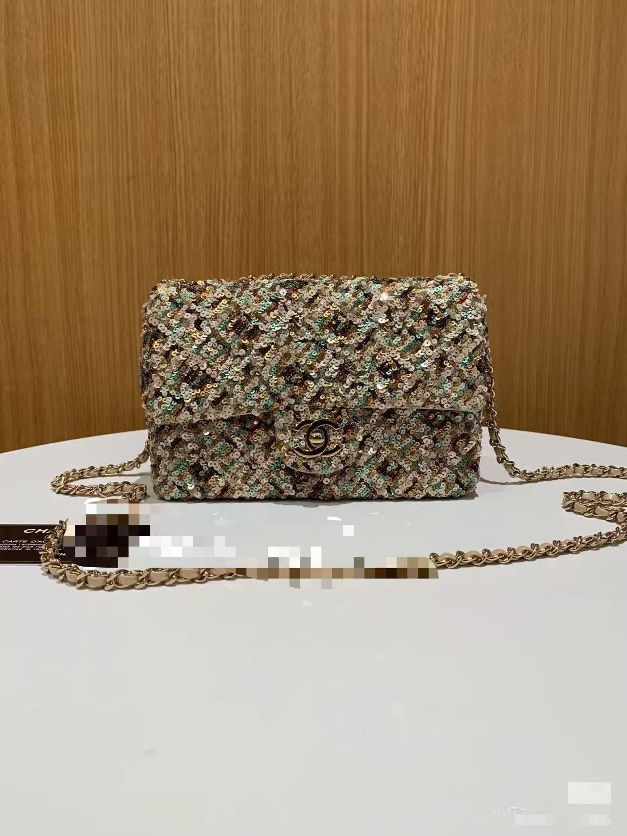 Elevate your style with the Limited Edition Chanel Sequined Mini Handbag. Measuring 14*21*8 cm, this exquisite accessory features a classic rhombus pattern adorned with vibrant sequins in purple, pink, black, and silver hues, creating a stunning effect that sparkles beautifully under the light.