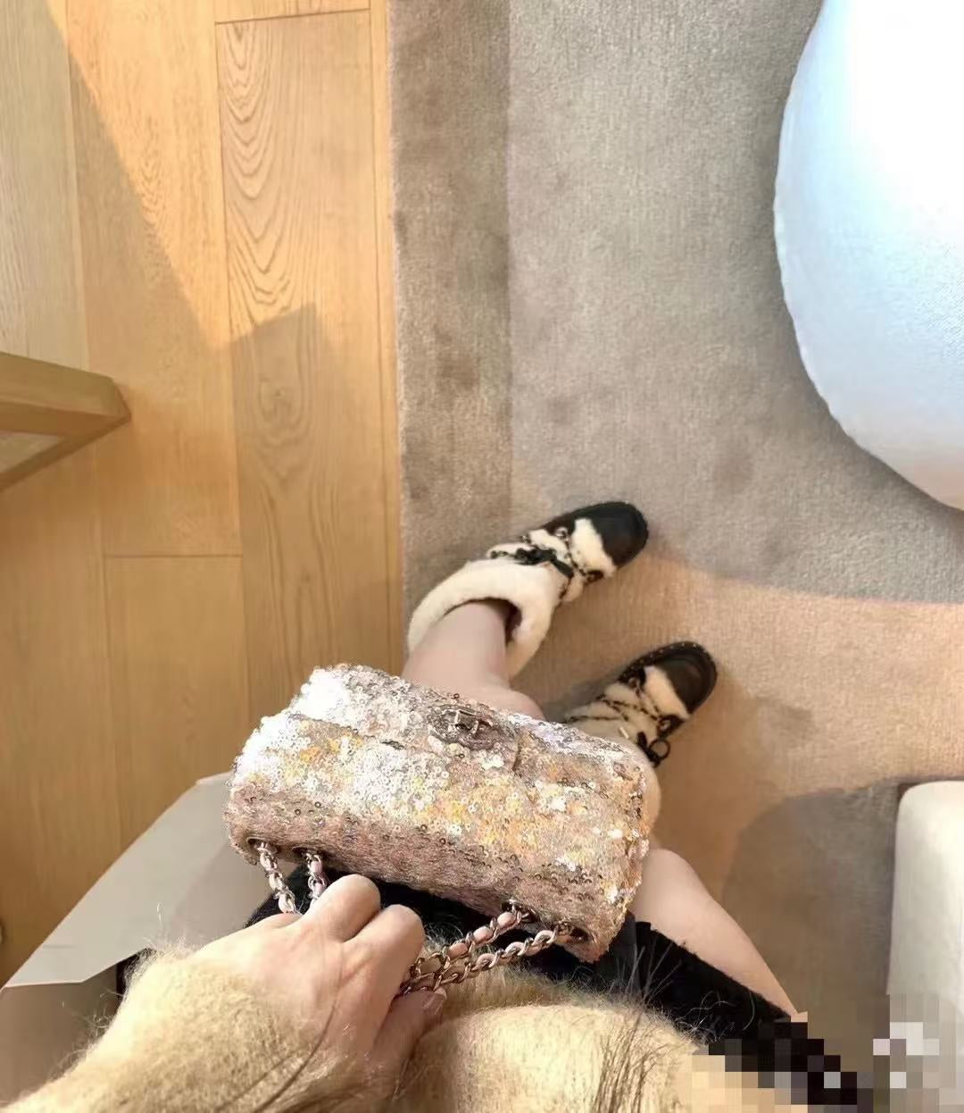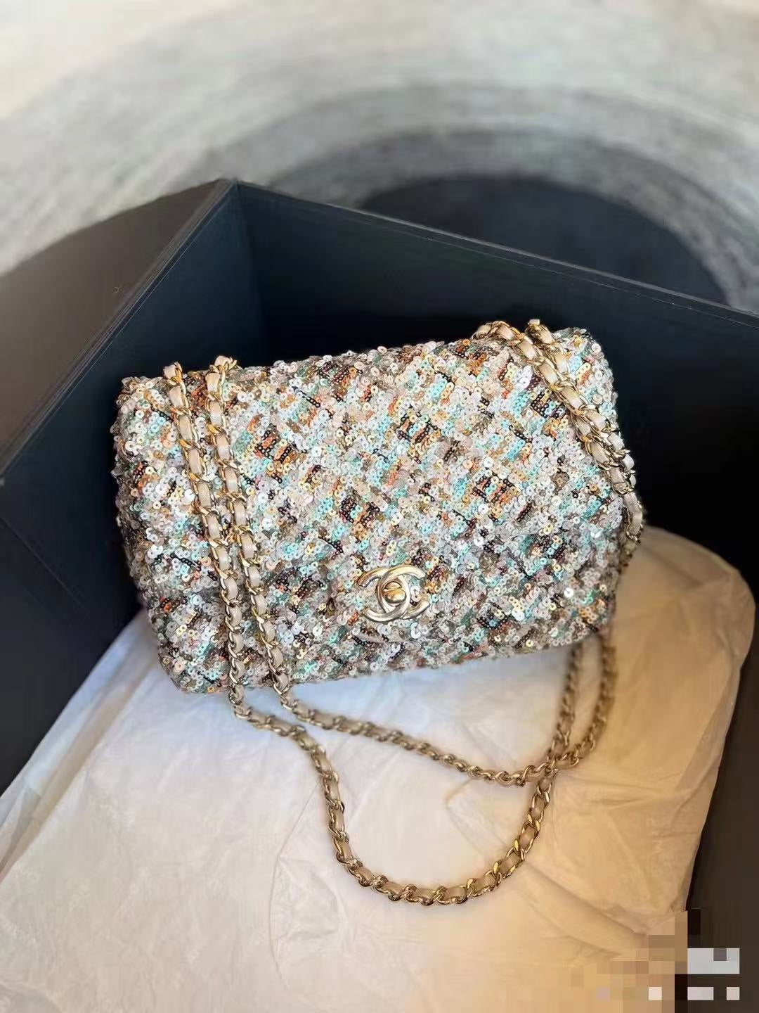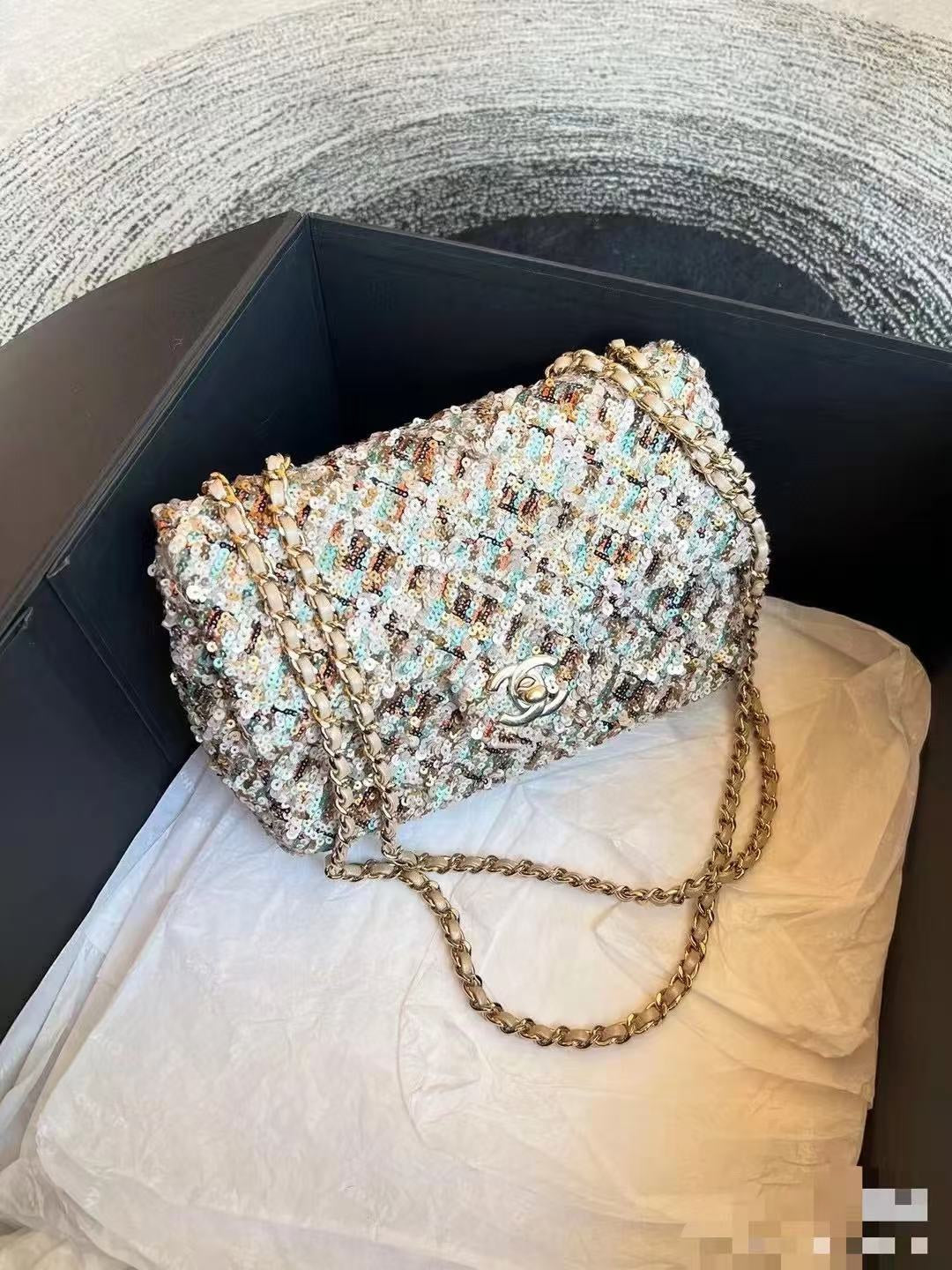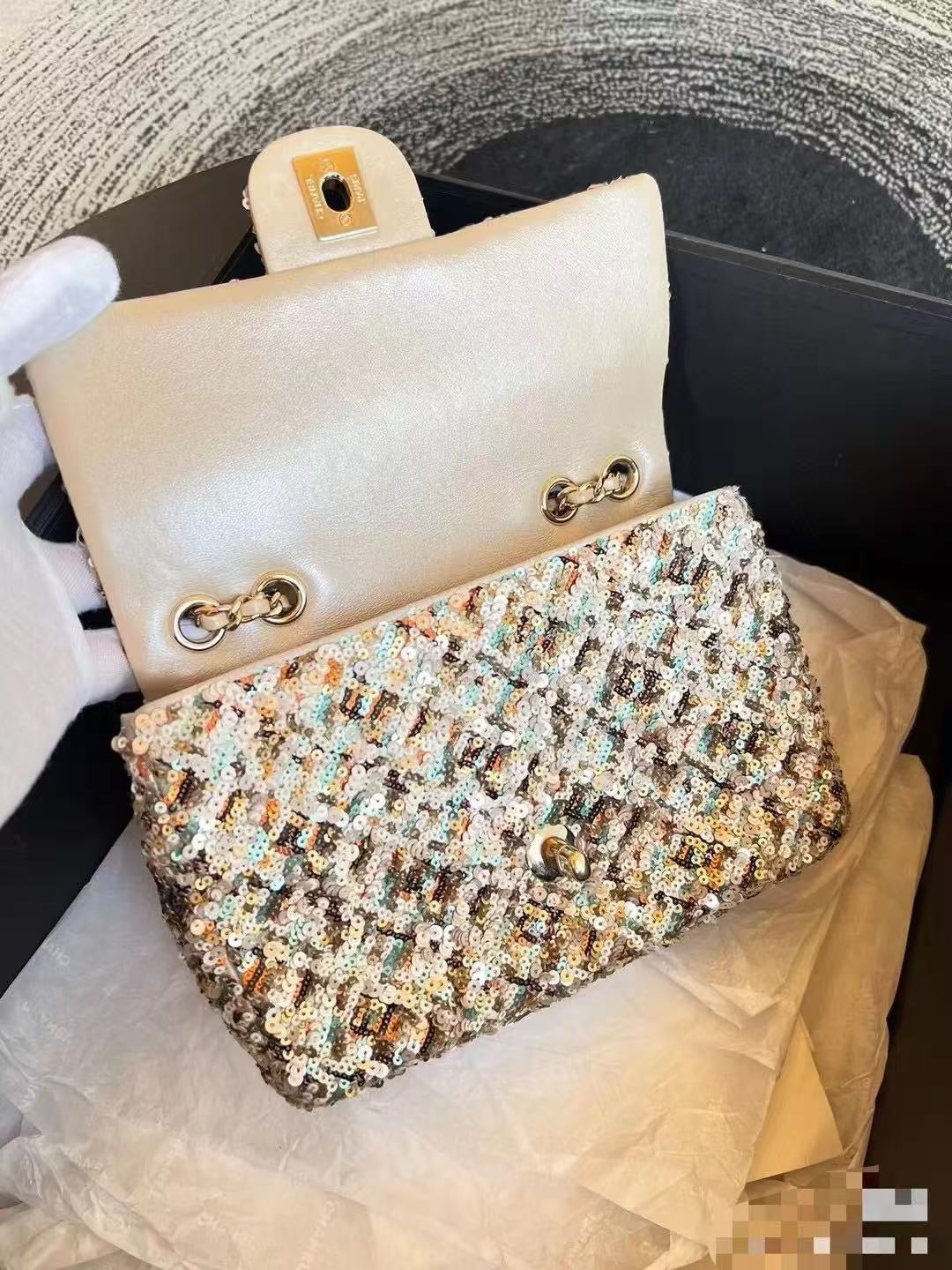 Elevate your style with the Limited Edition Chanel Sequined Mini Handbag. Measuring 14*21*8 cm, this exquisite accessory features a classic rhombus pattern adorned with vibrant sequins in purple, pink, black, and silver hues, creating a stunning effect that sparkles beautifully under the light.