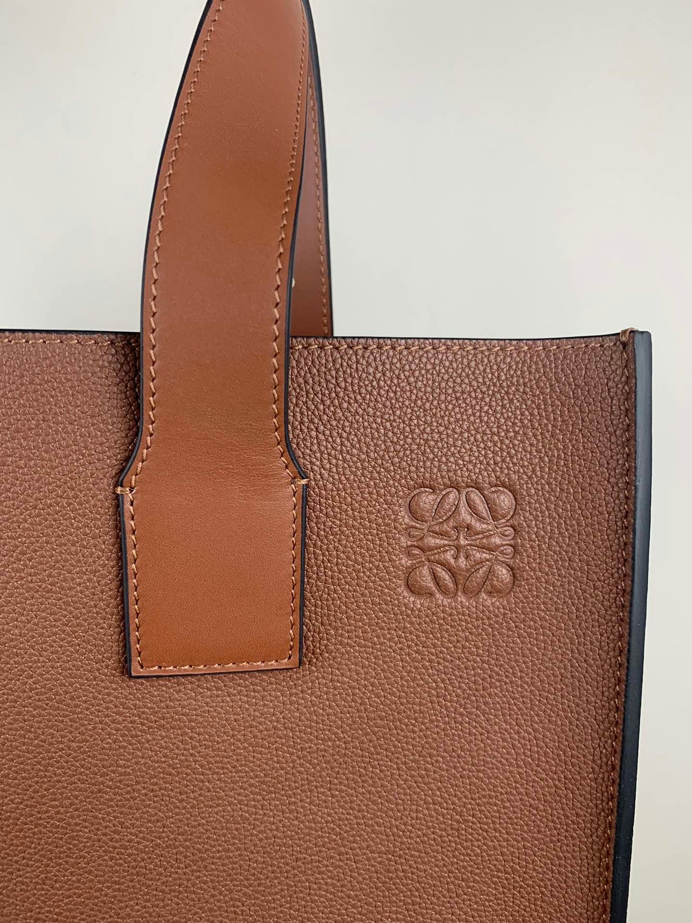 Elevate your style with the Loewe Buckle Tote Bag, a genuine leather accessory designed for the modern man. This brown tote bag features a generous volume combined with a sleek, slim silhouette. The flat, asymmetrical dual top handles are accented with a signature curved opening buckle, allowing for style versatility with an adjustable chain link.