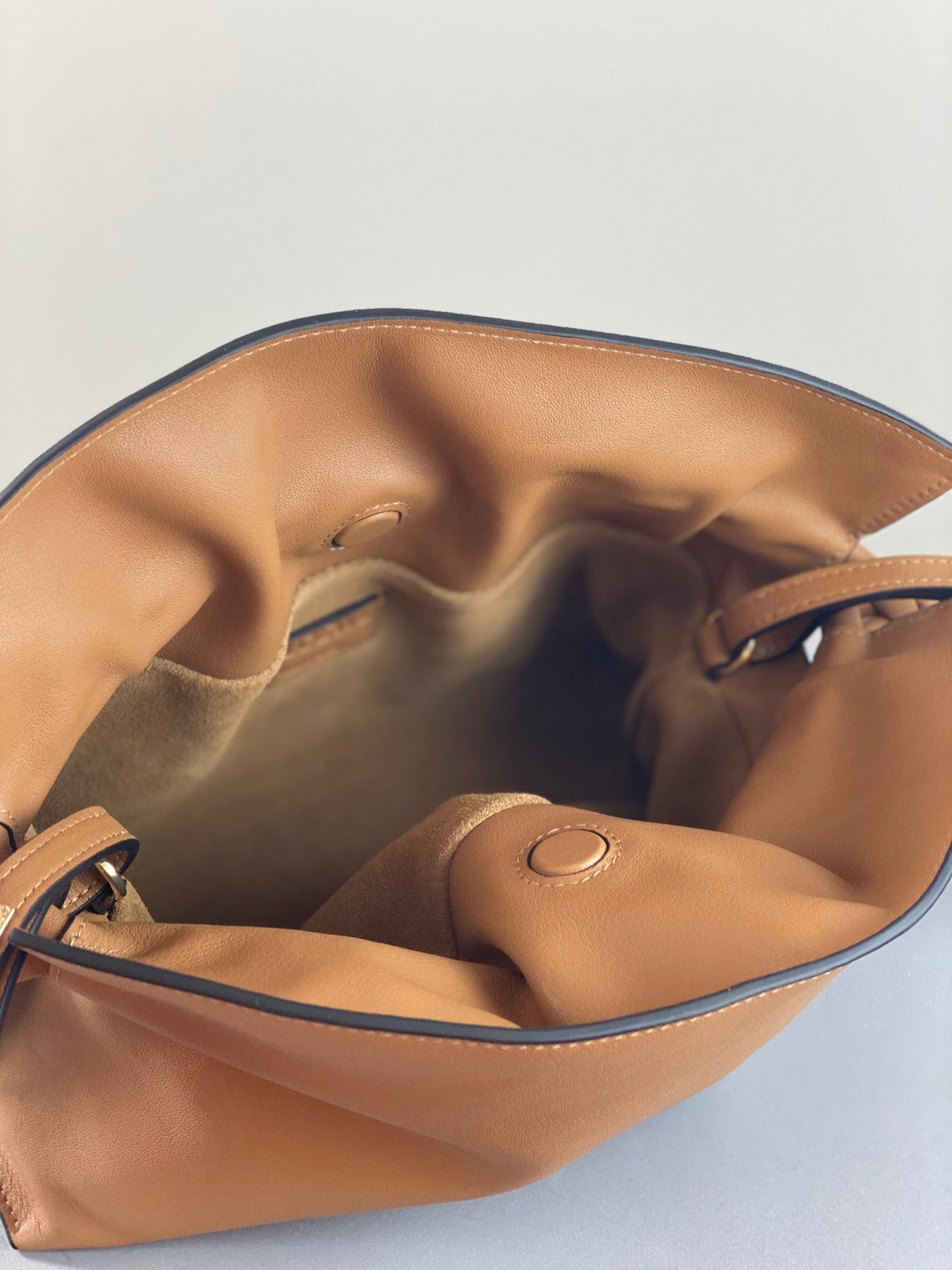 Discover the exquisite Loewe Mini Flamenco Knot Bag, a blend of sophistication and versatility. Crafted from genuine, soft-grade light brown calfskin, this iconic bag features a unique drawcord closure adorned with the signature coiled knot. With its adjustable and removable shoulder strap, you can effortlessly switch between shoulder, cross-body, or handheld styles.