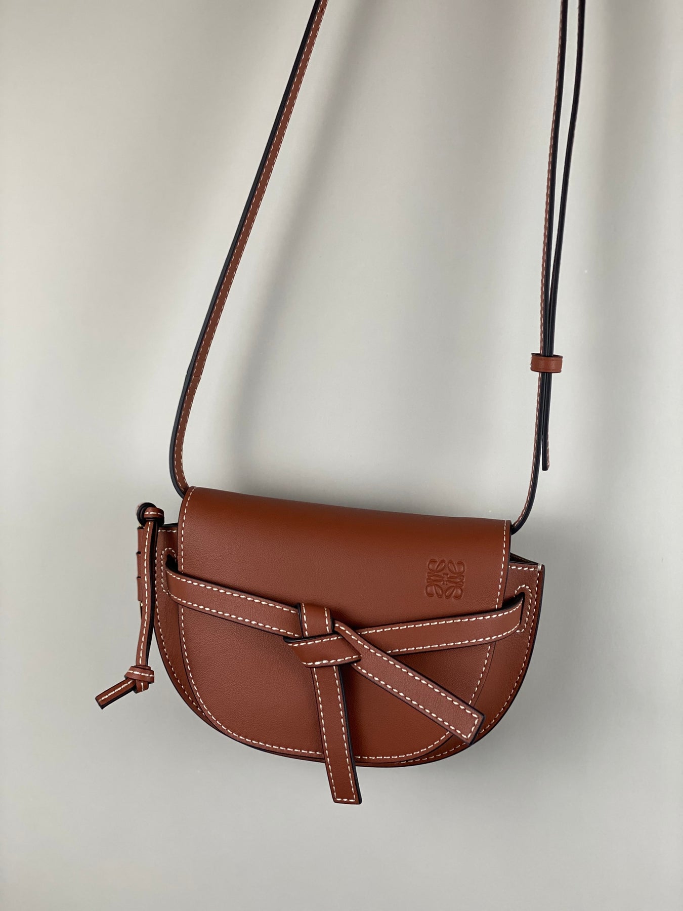 The front flap can be neatly tucked under the knotted ties for a secure closure, providing both style and security. Inside, you'll find two slip pockets for easy organization, plus the luxurious gold suede lining adds a touch of sophistication. Customize your bag with personalized charms for a truly unique statement.