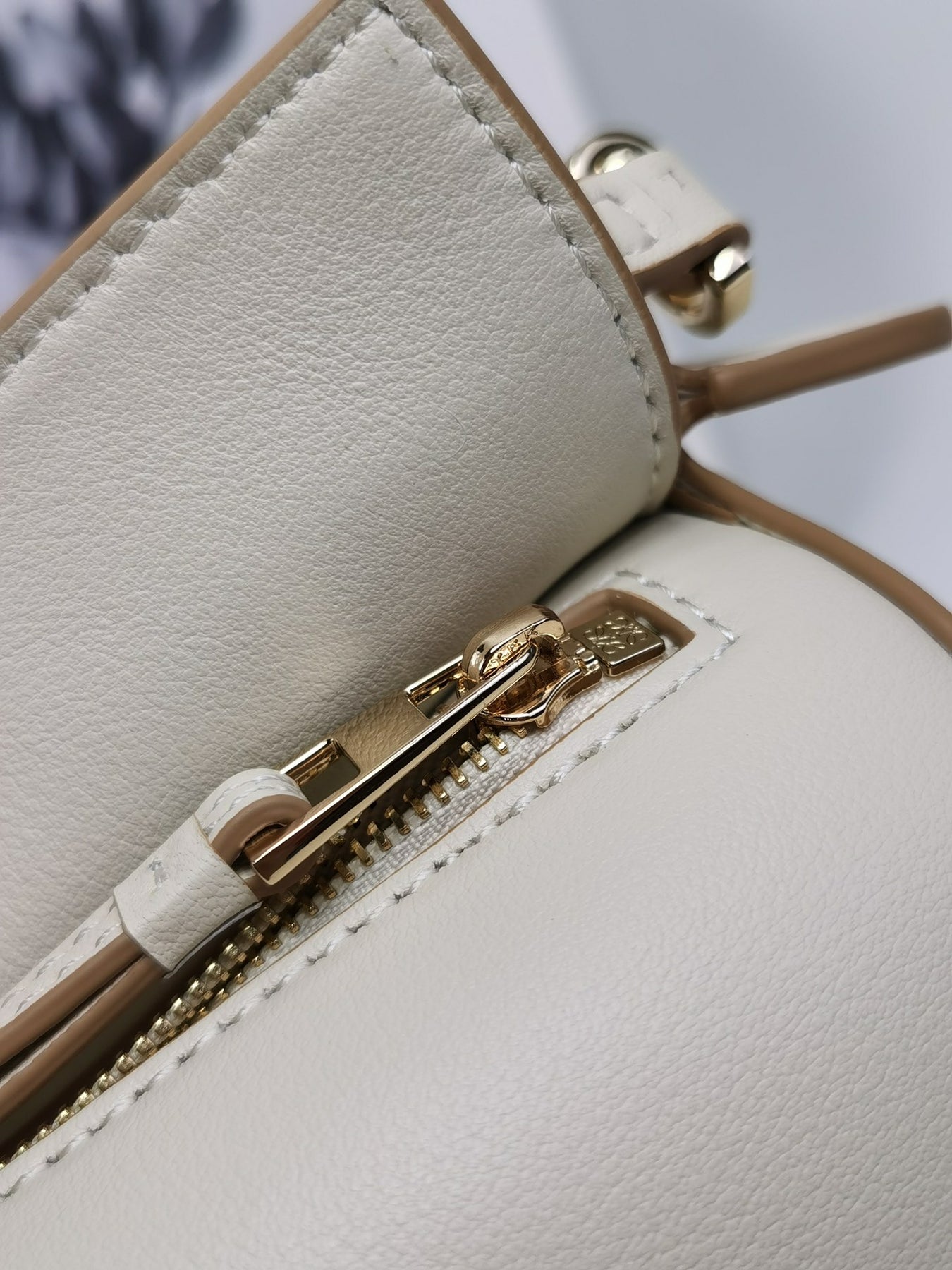 Crafted from premium classic cow leather in a sophisticated gray beige and gold color palette, this mini bag is not only stylish but also practical. It comfortably fits a small vertical wallet, most cell phones up to 6.1 inches, and a sunglasses case.