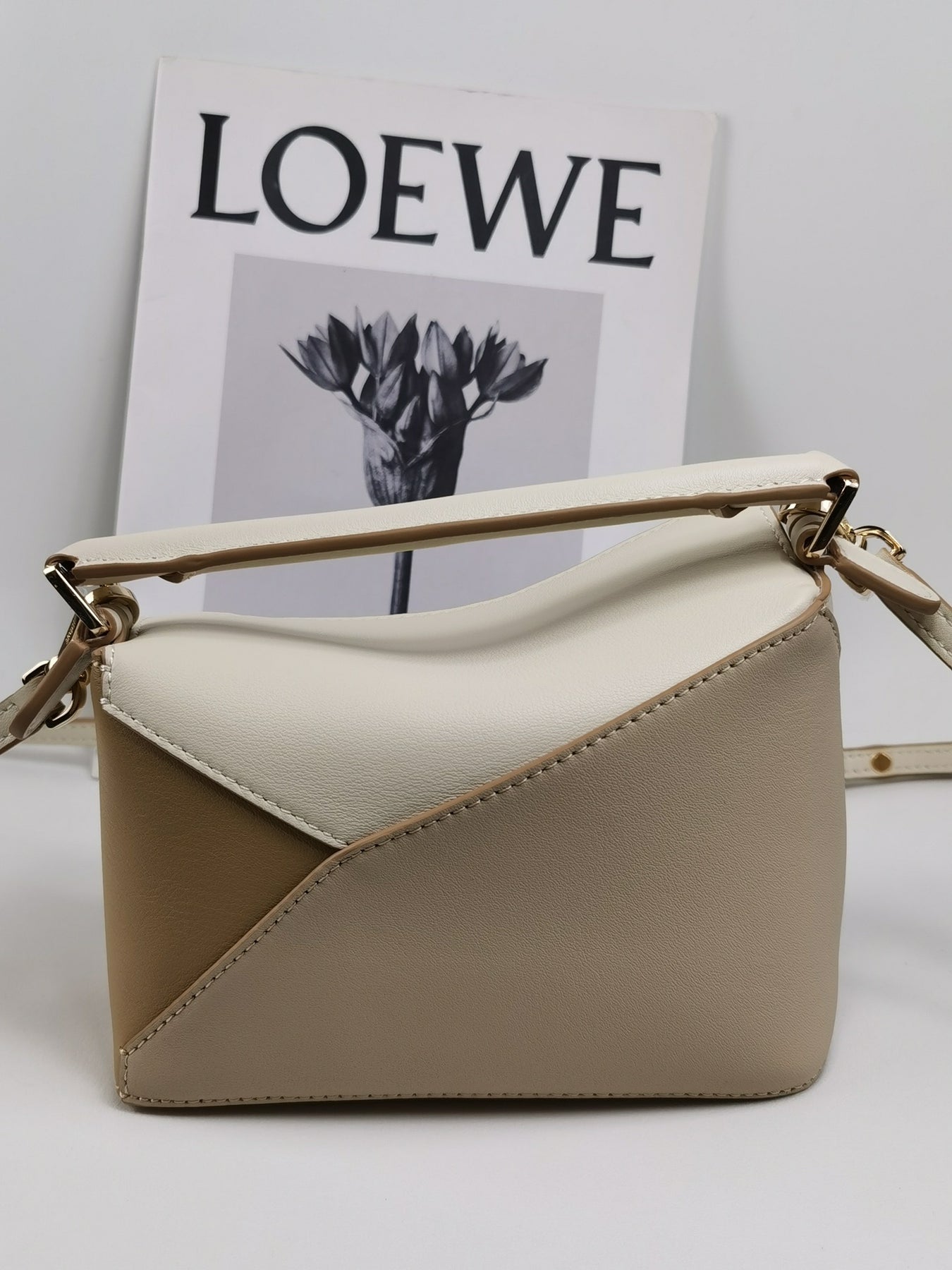 Discover the elegance of the LOEWE Mini Puzzle Bag, designed by creative director Jonathan Anderson. This striking piece showcases a unique cuboid shape and expertly crafted geometric lines, making it a standout accessory.