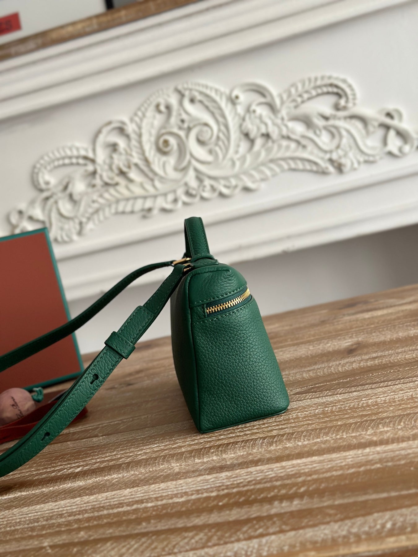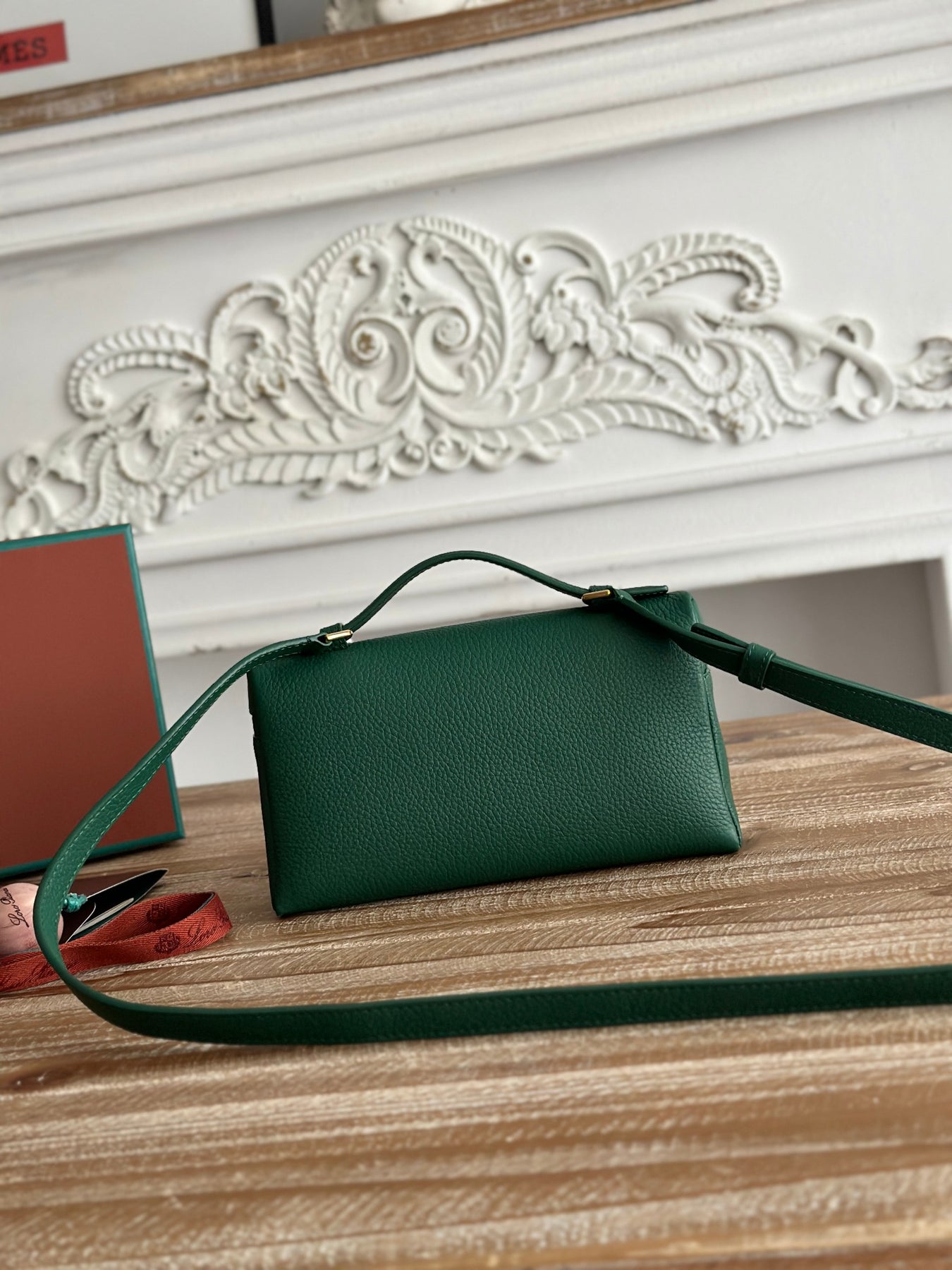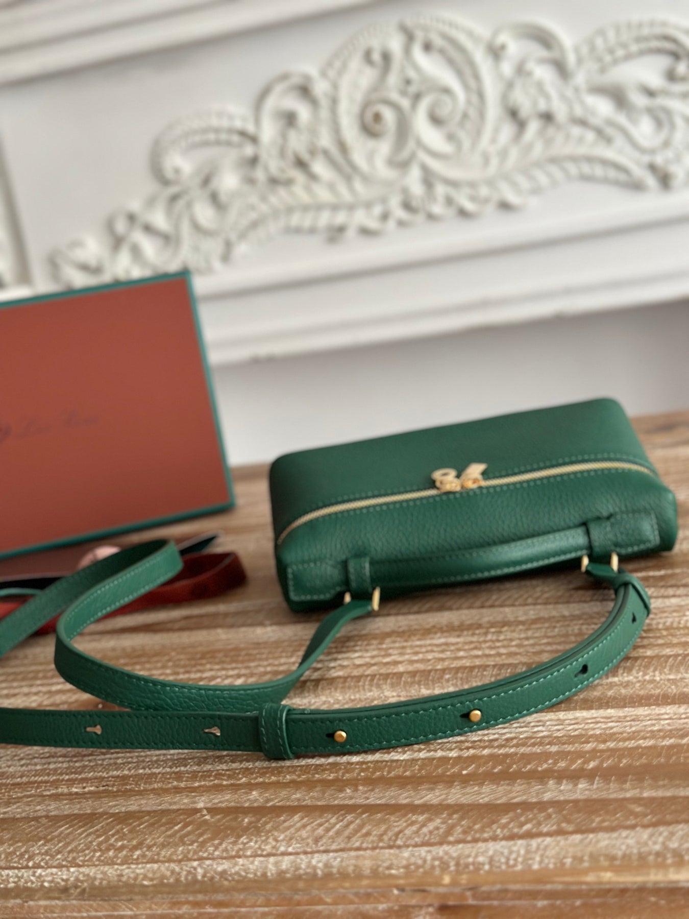 Discover the elegance of the Loro Piana L19 Malachite Green Handbag. This versatile bag features a sleek silver buckle and is designed for both style and functionality. Perfect for use as a shoulder strap or crossbody bag, it offers an extra pocket for convenient organization. With compact dimensions of 19cm (length) x 7cm (width) x 12cm (height), it easily transitions from day to night. Elevate your accessory collection with this chic and practical handbag.