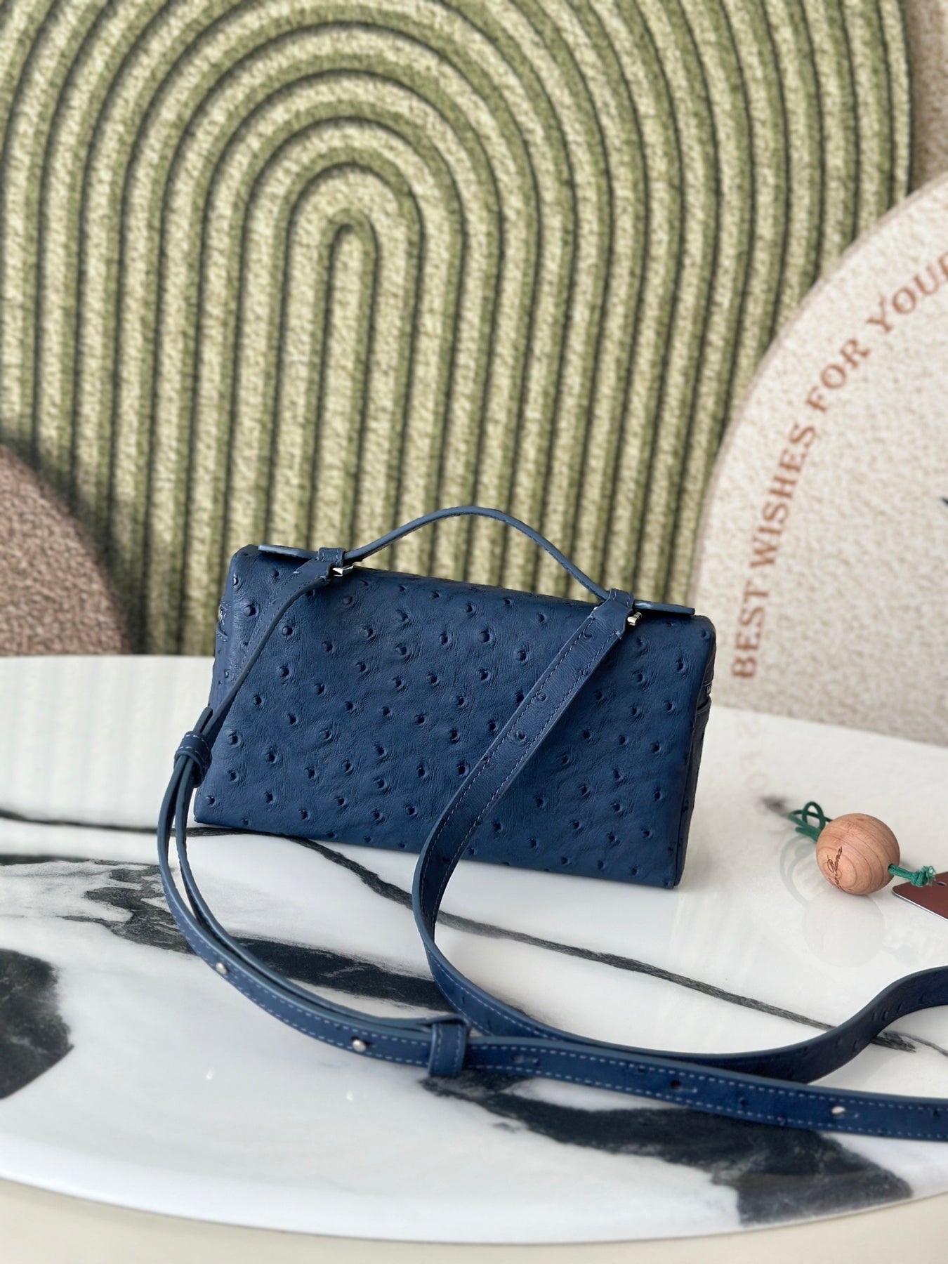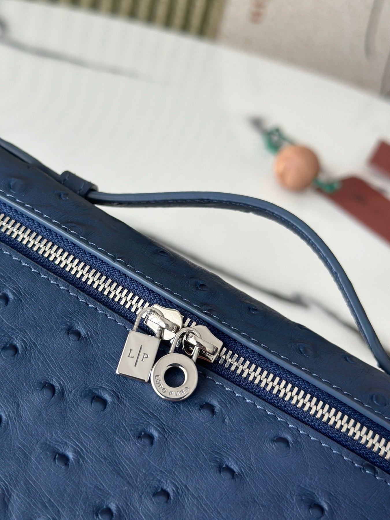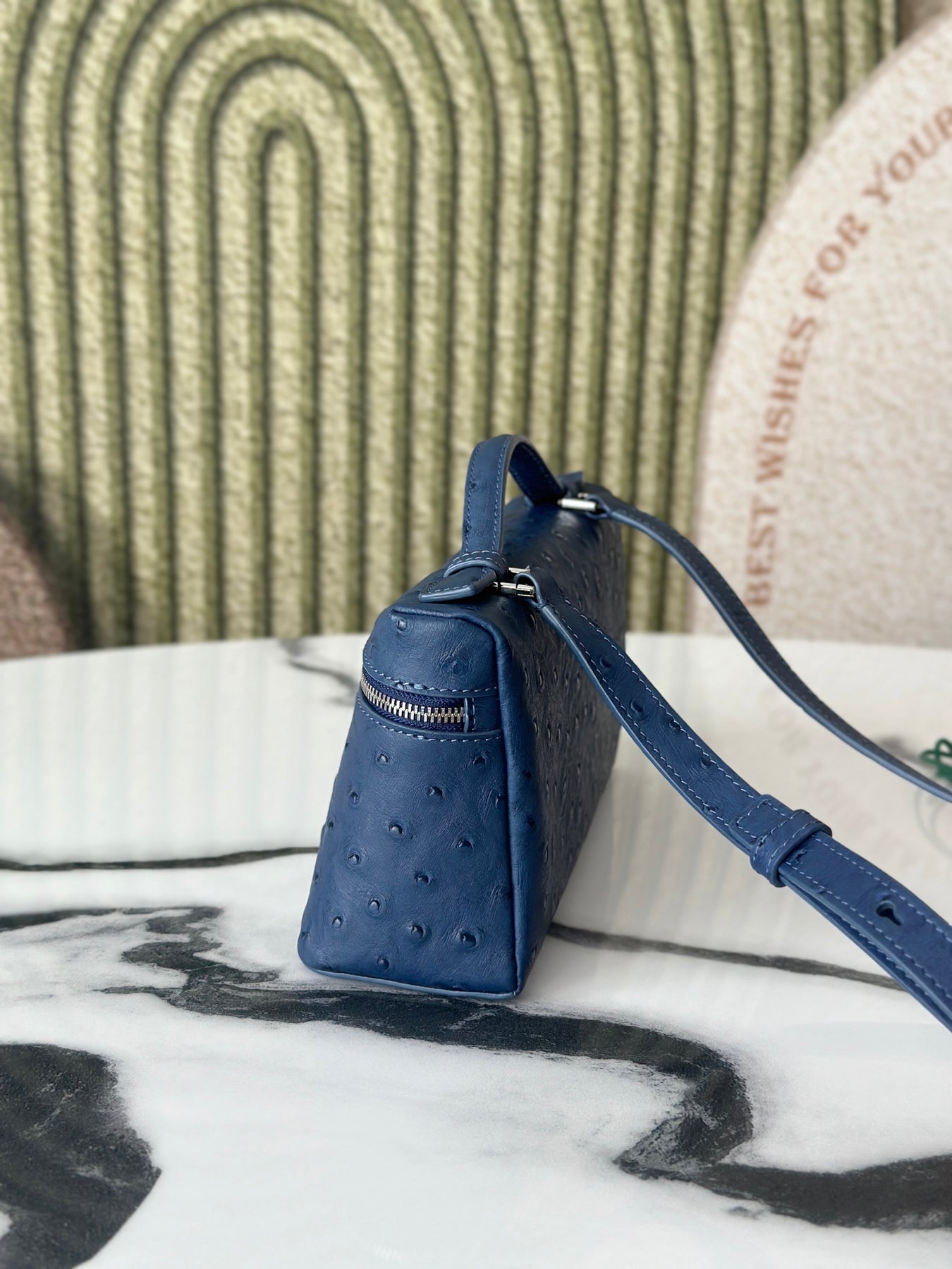 Introducing the Loro Piana L19 Extra Pocket Handbag, a versatile crossbody bag that effortlessly combines refinement and casual elegance. Crafted with a stunning sapphire blue ostrich pattern, this handbag stands out while maintaining a minimalist design, perfect for any occasion.