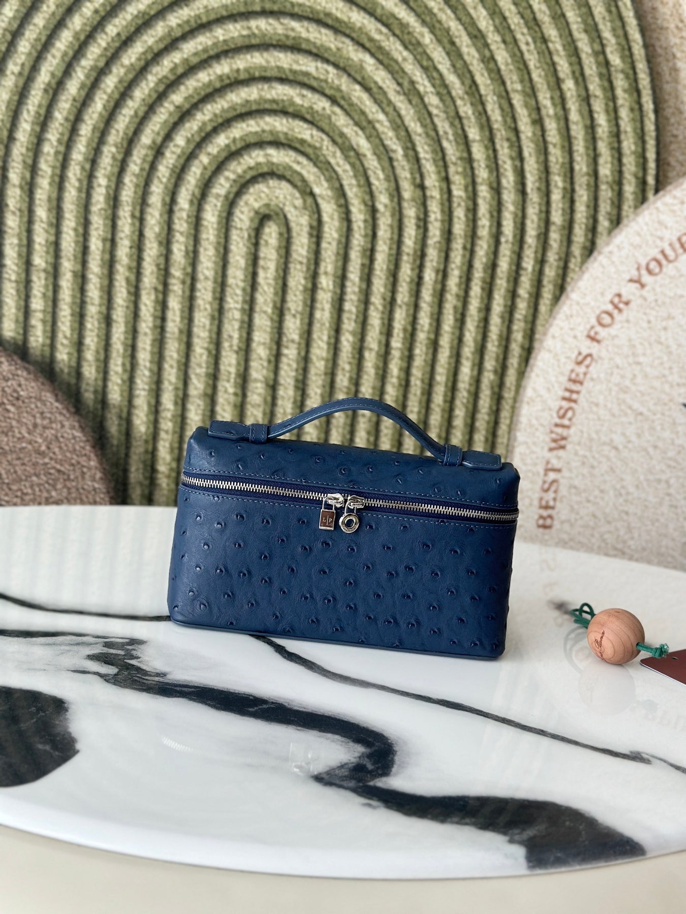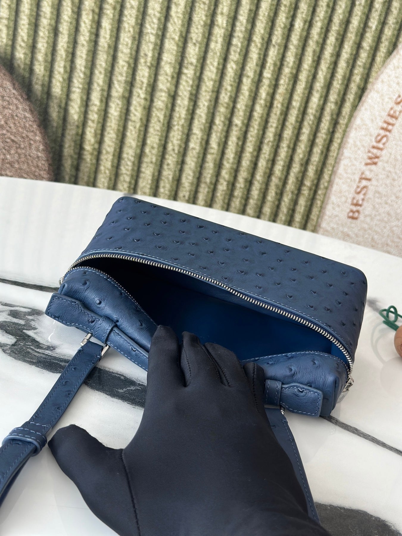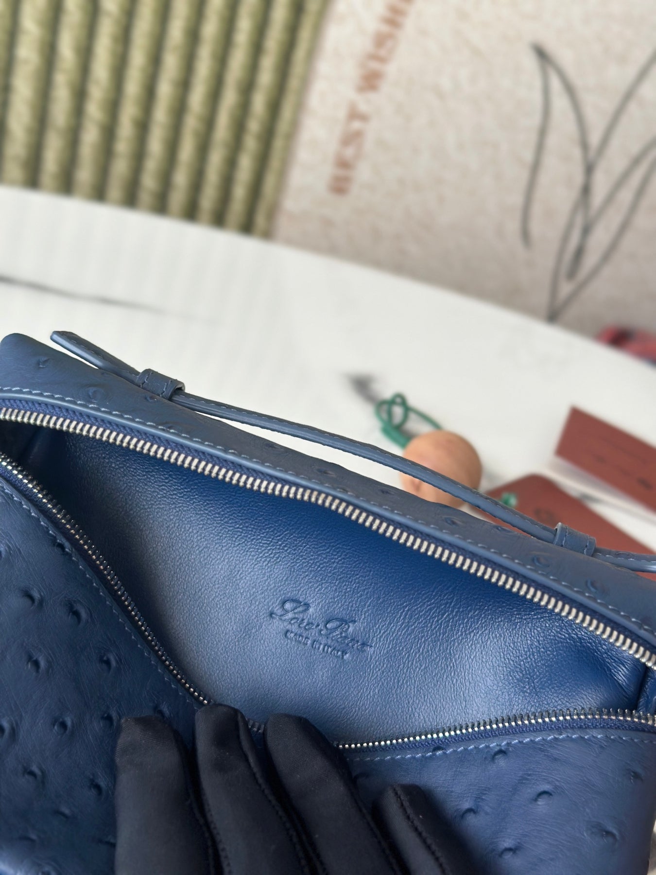 Introducing the Loro Piana L19 Extra Pocket Handbag, a versatile crossbody bag that effortlessly combines refinement and casual elegance. Crafted with a stunning sapphire blue ostrich pattern, this handbag stands out while maintaining a minimalist design, perfect for any occasion.