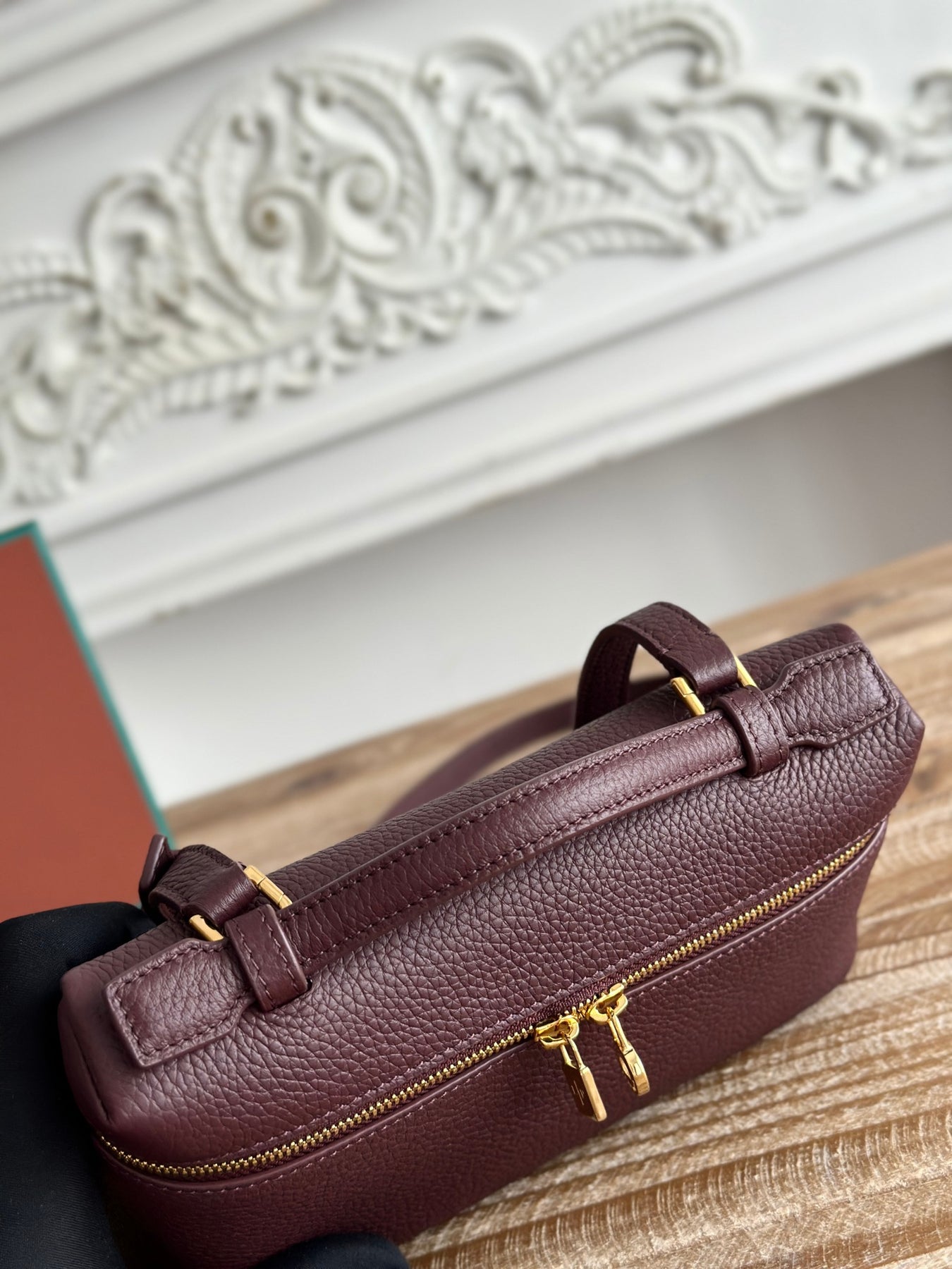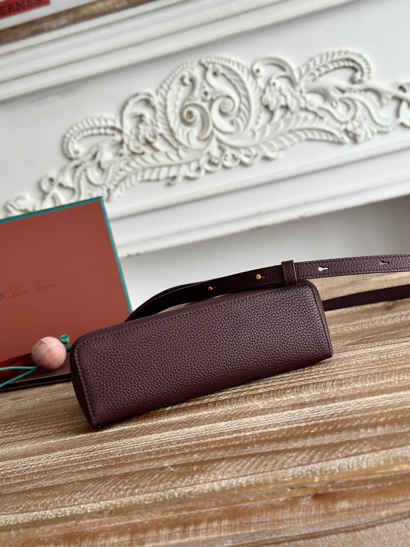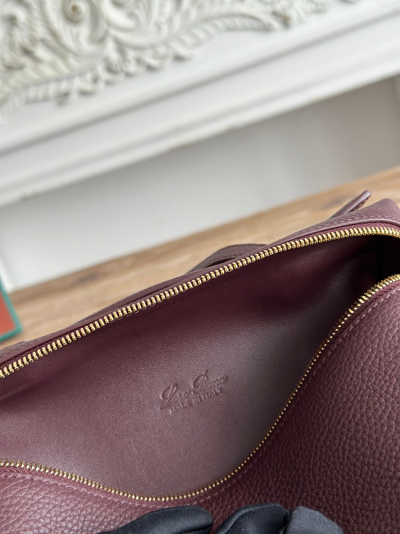Introducing the Loro Piana L19 Series Handbag in a sophisticated red bean color with a gold buckle, featuring an extra pocket for added functionality. This handbag embodies a lifestyle of effortless elegance and comfort, with a minimalist design that requires no elaborate embellishments.