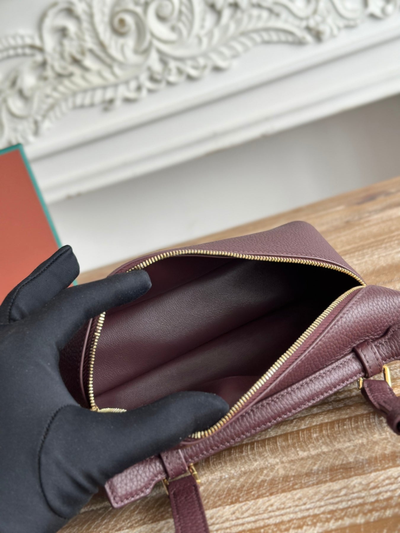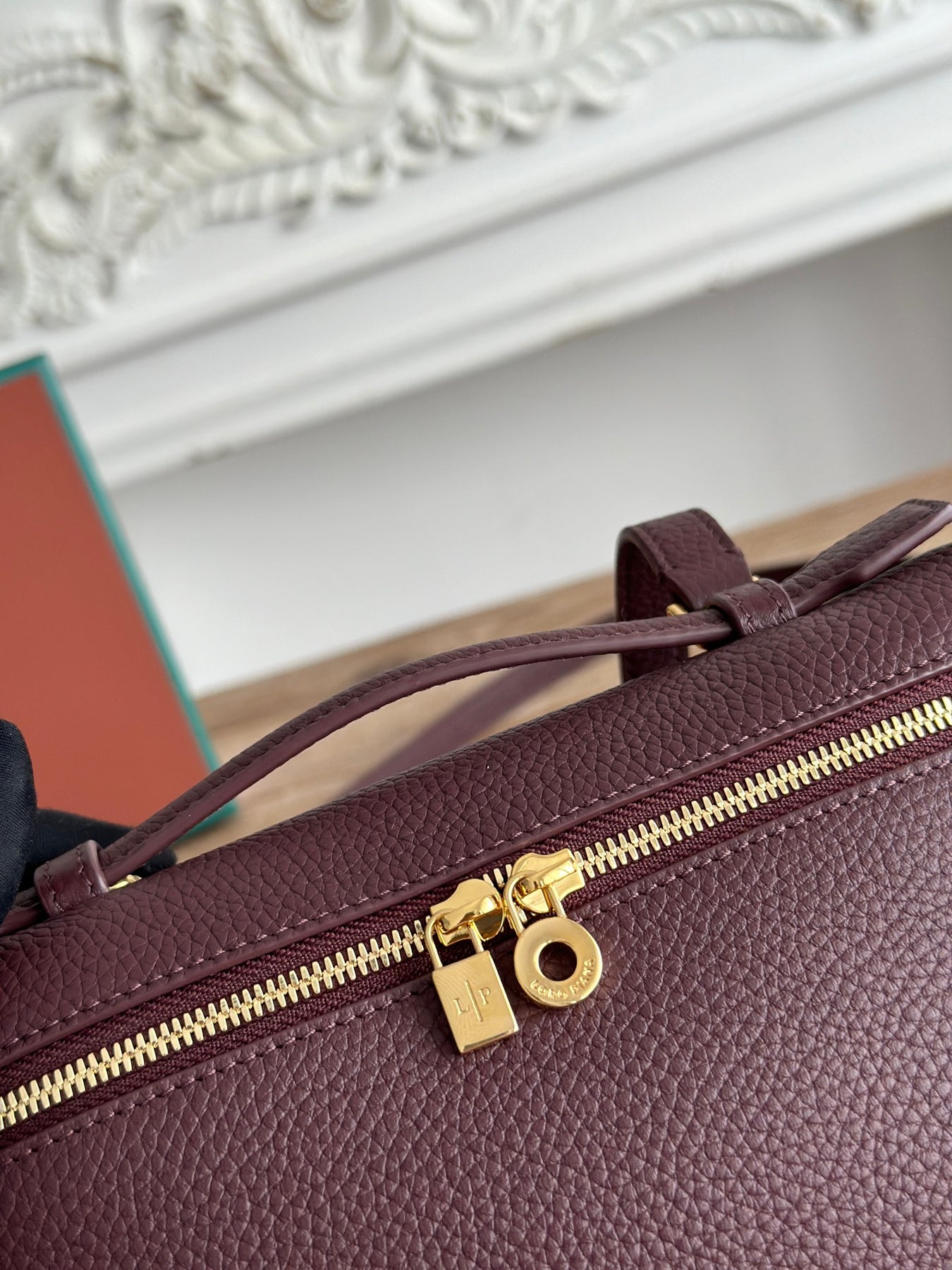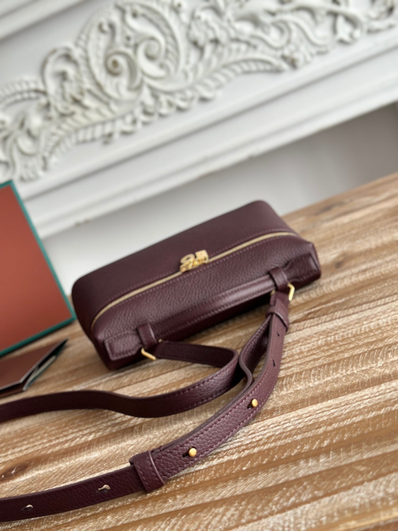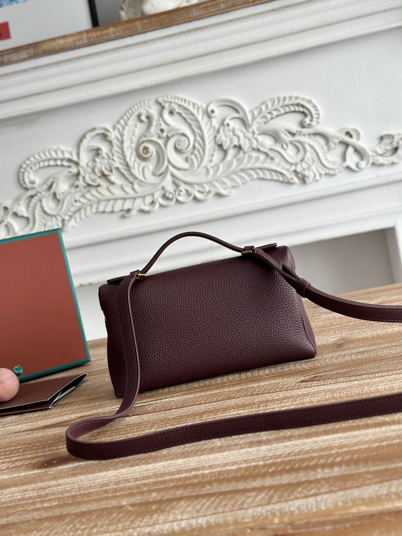 Introducing the Loro Piana L19 Series Handbag in a sophisticated red bean color with a gold buckle, featuring an extra pocket for added functionality. This handbag embodies a lifestyle of effortless elegance and comfort, with a minimalist design that requires no elaborate embellishments.