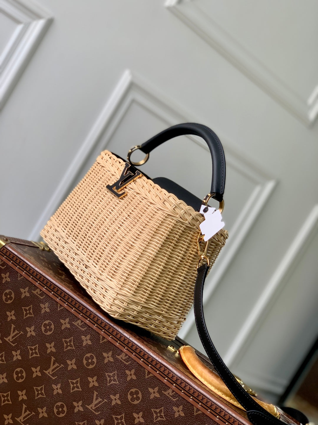 Elevate your accessory collection with the Louis Vuitton Capucines BB Handbag. Inspired by the iconic Picnic hard case from 1892, this handbag beautifully merges elegance and functionality. Its meticulously crafted rattan body takes days to weave, adding a touch of artisanal charm. With ample space to hold your daily essentials, this handbag offers versatile styling options—the flap can be positioned both inside and outside. Signature LV letters and a printed lining showcase the brand's legacy.