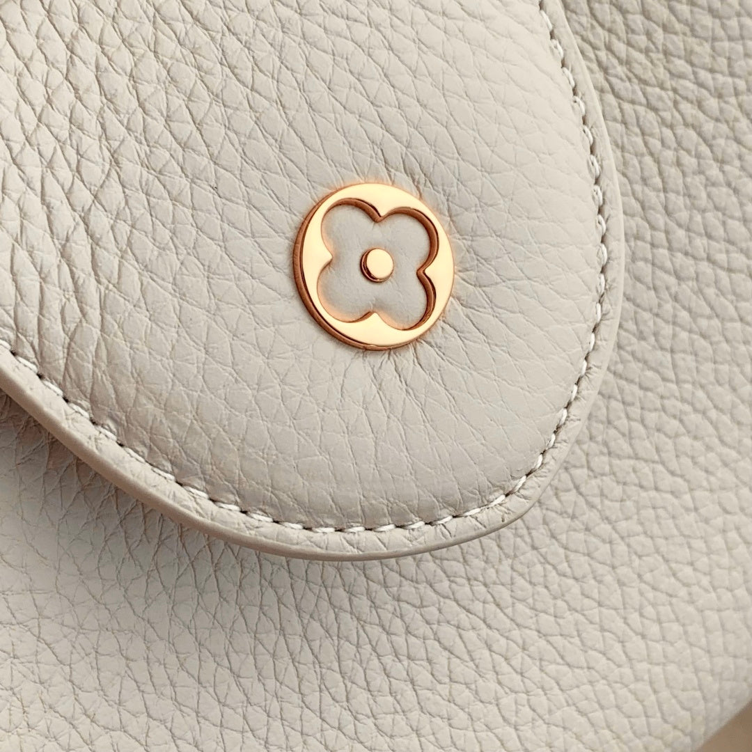 Introducing the Louis Vuitton Capucines Chain On You Medium Bag, expertly crafted from luxurious soft Taurillon leather. This elegant gray handbag offers ample space for your daily essentials, including a wallet, keys, and lipstick. The exquisite jewelry-style double-plated chain features Monogram floral accents that beautifully enhance the signature LV letters. With a versatile flap design that can be tucked in or out, this bag effortlessly combines style and functionality.