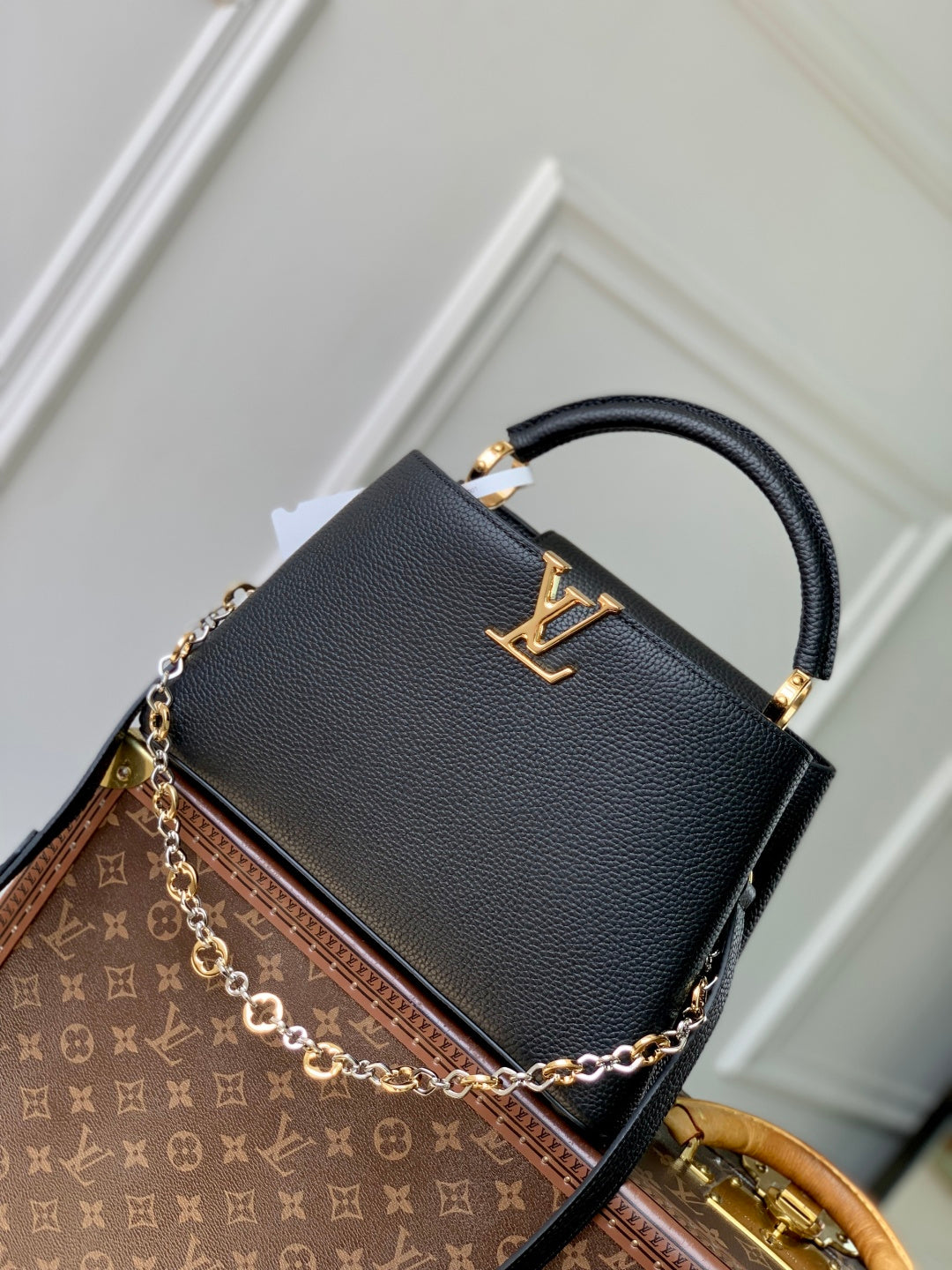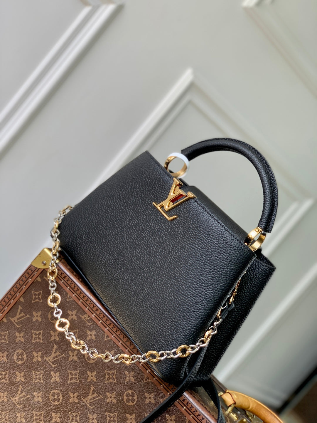 Elevate your style with the Louis Vuitton Capucines Medium Handbag, crafted from luxurious Taurillon leather. This exquisite bag showcases a unique double-plated chain and elegant Monogram floral motifs, embodying the essence of the Chain On You collection. Designed for versatility, the flip cover can be stylishly positioned on either the inside or outside. The spacious interior features multiple pockets, perfect for organizing your daily essentials. Subtle rounded LV letters add a touch of sophistication to this iconic piece. Dimensions: 20 × 11 × 31.5 cm (height x width x length).