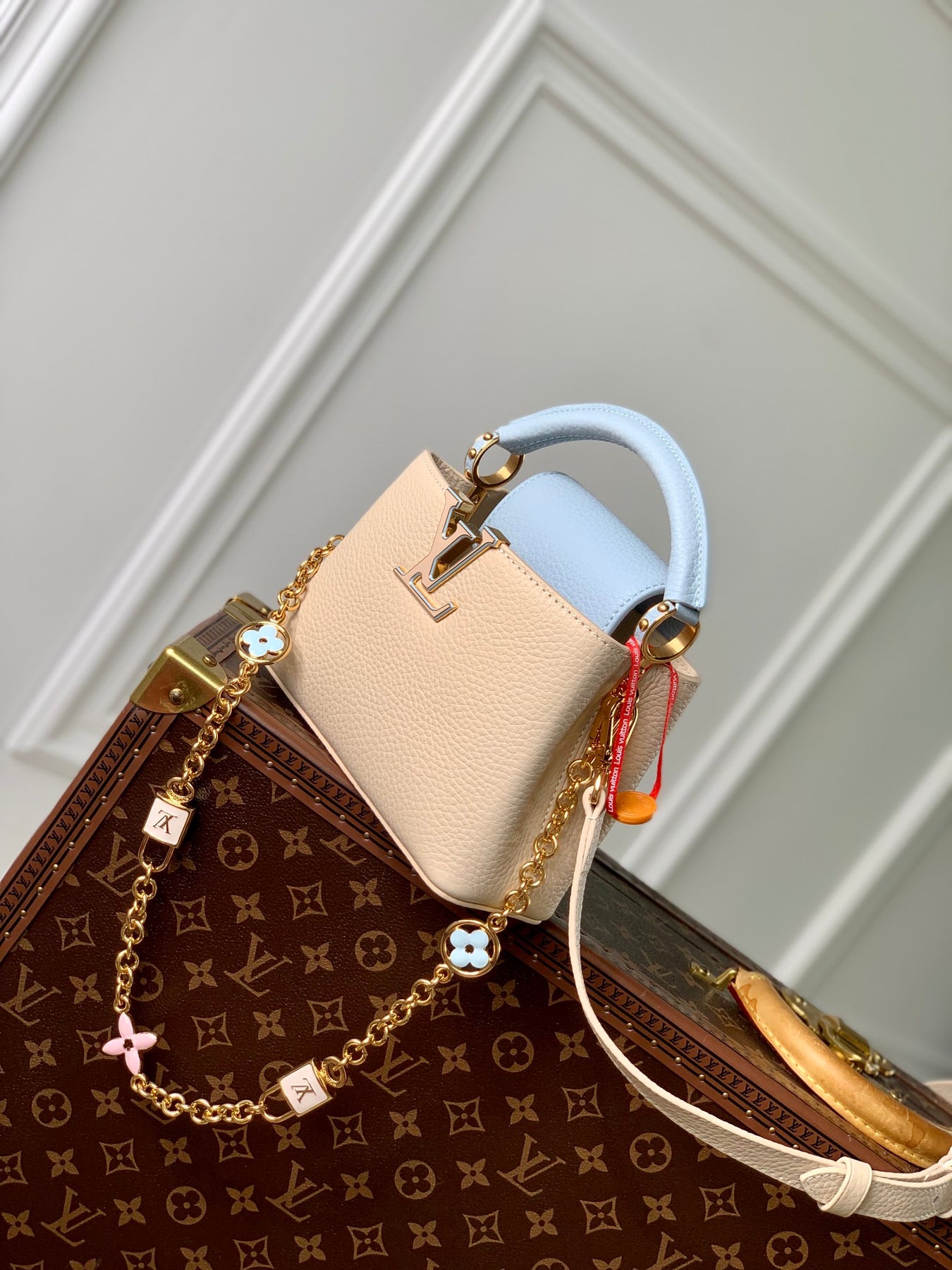 Elevate your style with the Louis Vuitton Capucines Mini Bag, a stunning blend of luxury and craftsmanship. Crafted from premium leather, this exquisite mini bag showcases a beautiful Lovelock woven chain adorned with hand-painted enamel Monogram accents and an LV-engraved padlock, adding a touch of sophistication. The contrasting leather elegantly frames the iconic LV logo, making this piece a true statement accessory.
