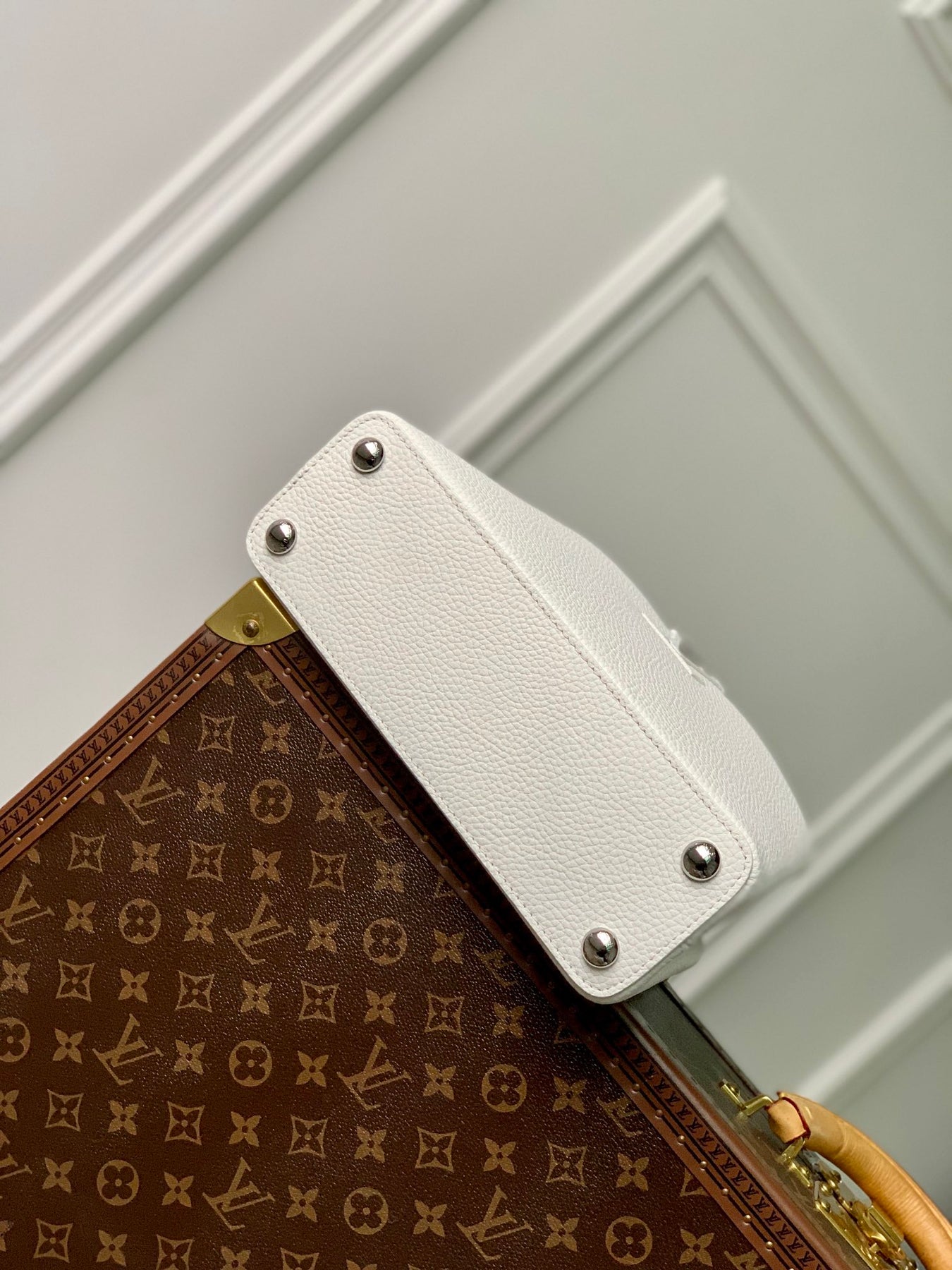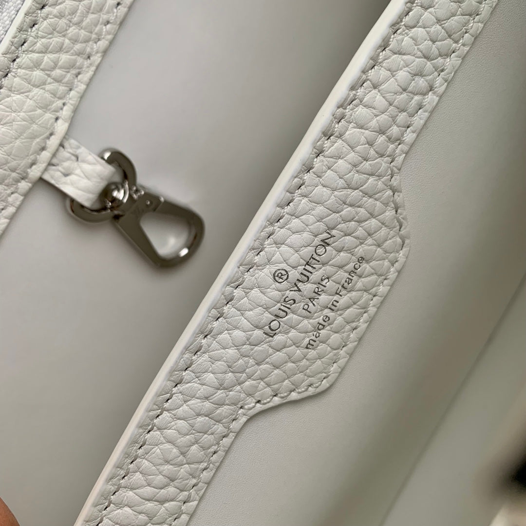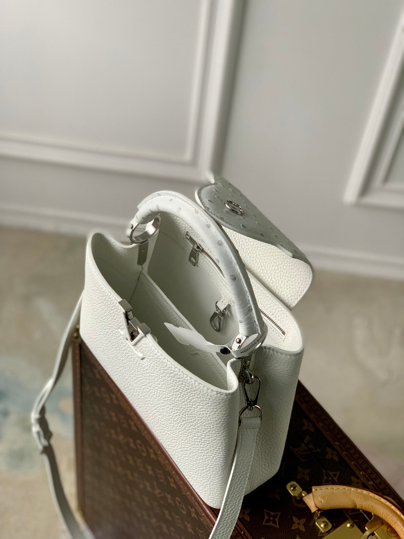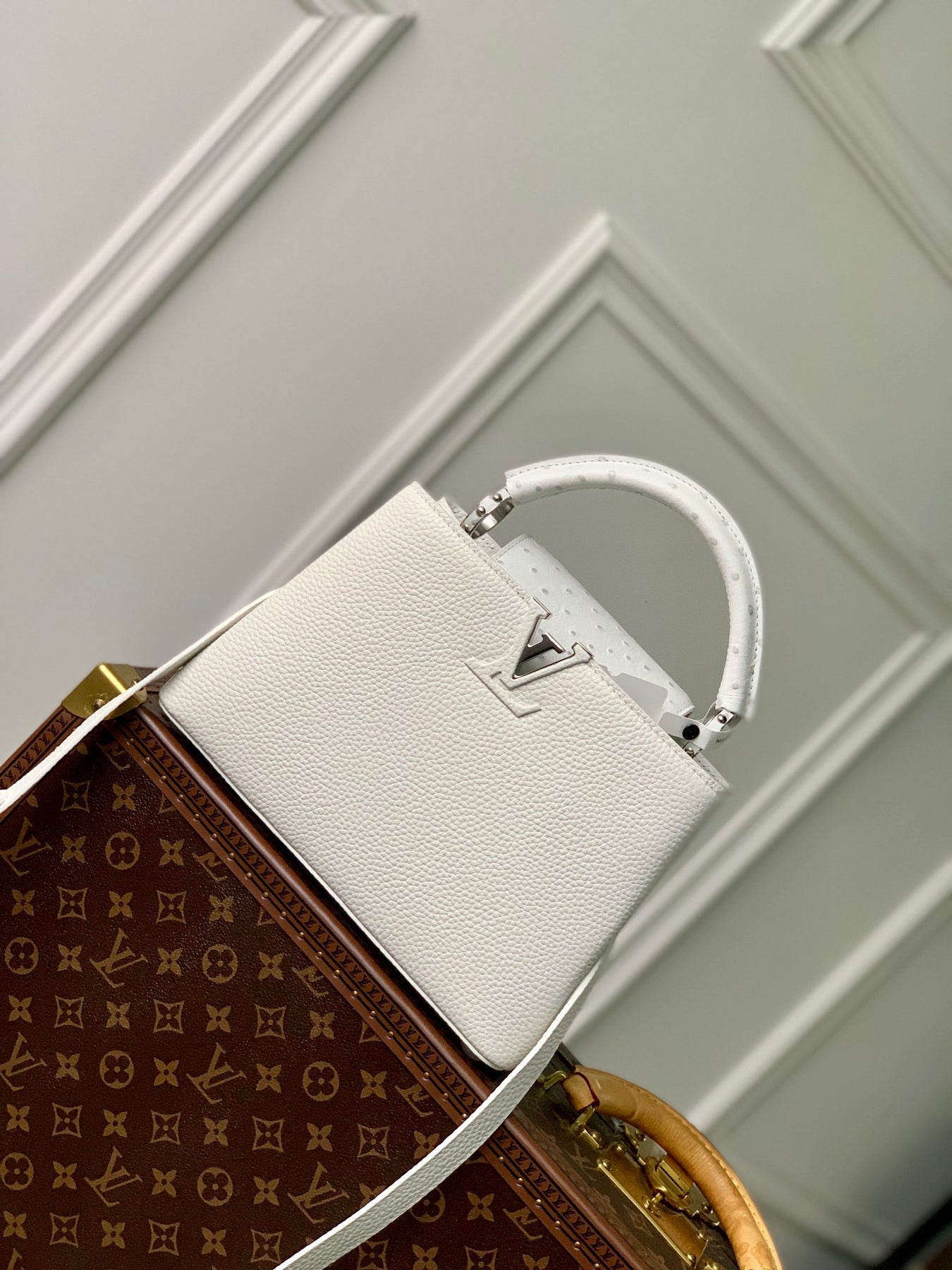 Introducing the Louis Vuitton Capucines Small Bag, expertly crafted from premium Taurillon leather and accented with luxurious ostrich leather on the flap, handles, and iconic LV letters. This elegant bag features a sleek silhouette, measuring 27 x 18 x 9 cm, making it the perfect accessory for any occasion. The versatile, removable leather shoulder strap adds a contemporary flair, allowing for effortless style. Elevate your collection with this timeless piece that showcases Louis Vuitton's dedication to quality and sophistication.