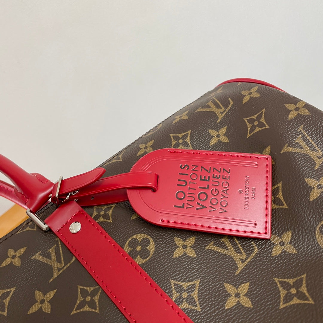 Introducing the Louis Vuitton Keepall Bandoulière 45, a luxurious travel companion crafted from genuine Monogram Macassar coated canvas, accentuated with premium leather trim. This stylish travel bag marks a new chapter in the LV Colormania series, featuring vibrant leather side straps, a top handle, a detachable name tag, and an adjustable shoulder strap for effortless elegance on the go.