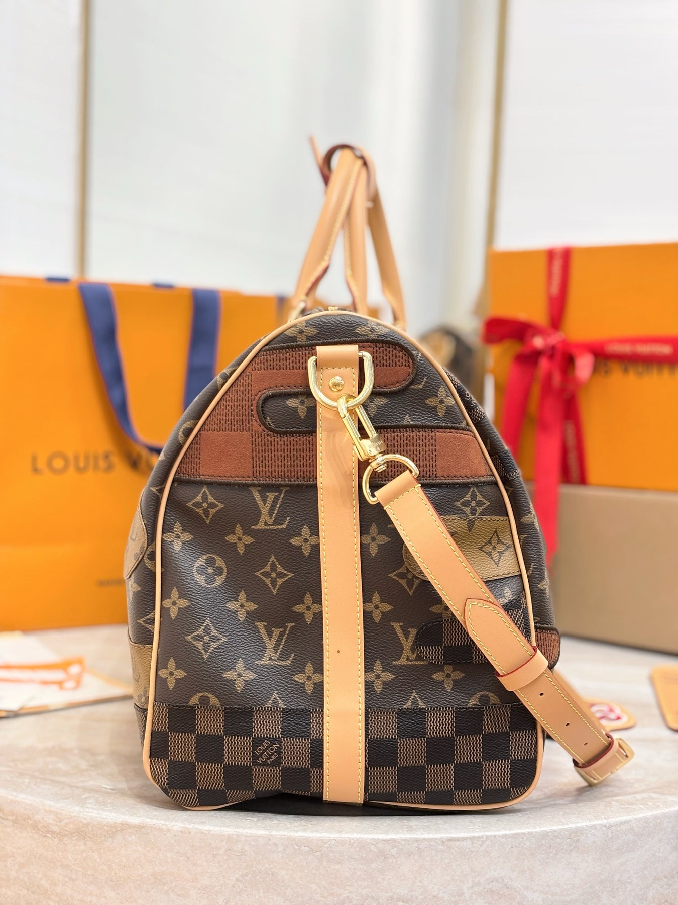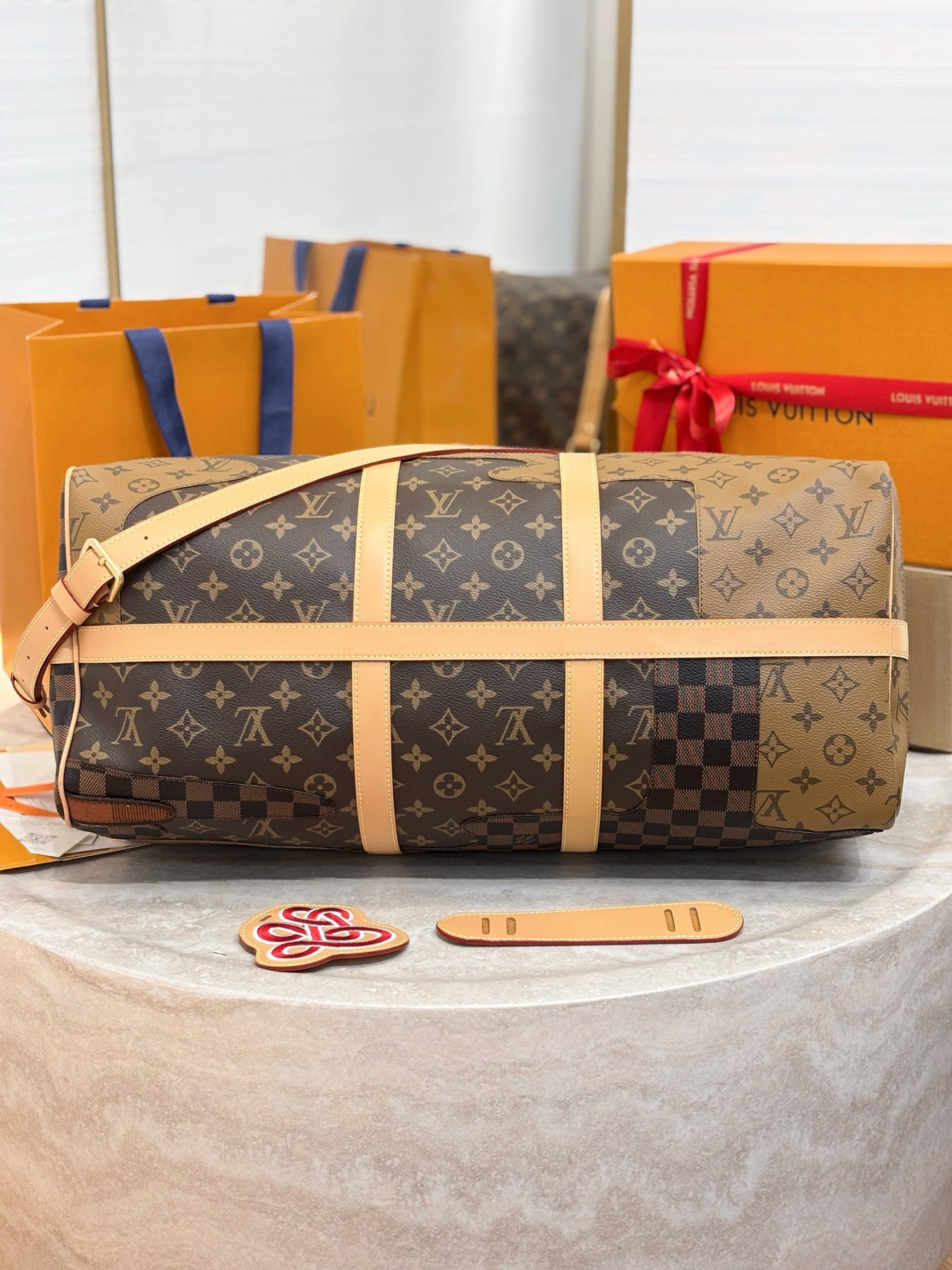 Elevate your travel style with the Louis Vuitton Keepall Bandoulière 50 travel bag. Crafted from premium A-grade fabric imported from France, this exquisite bag features a unique patchwork design combining Monogram canvas with Monogram Reverse and Damier canvas patches. The spacious dimensions of 50x29x23cm provide ample room for your weekend essentials, while the distressed cow leather trim adds a touch of elegance and durability. The standout L*Dynasty decoration enhances this stylish piece, making it the perfect companion for any getaway. Upgrade your travel experience with this modern classic that embodies sophistication and practicality.