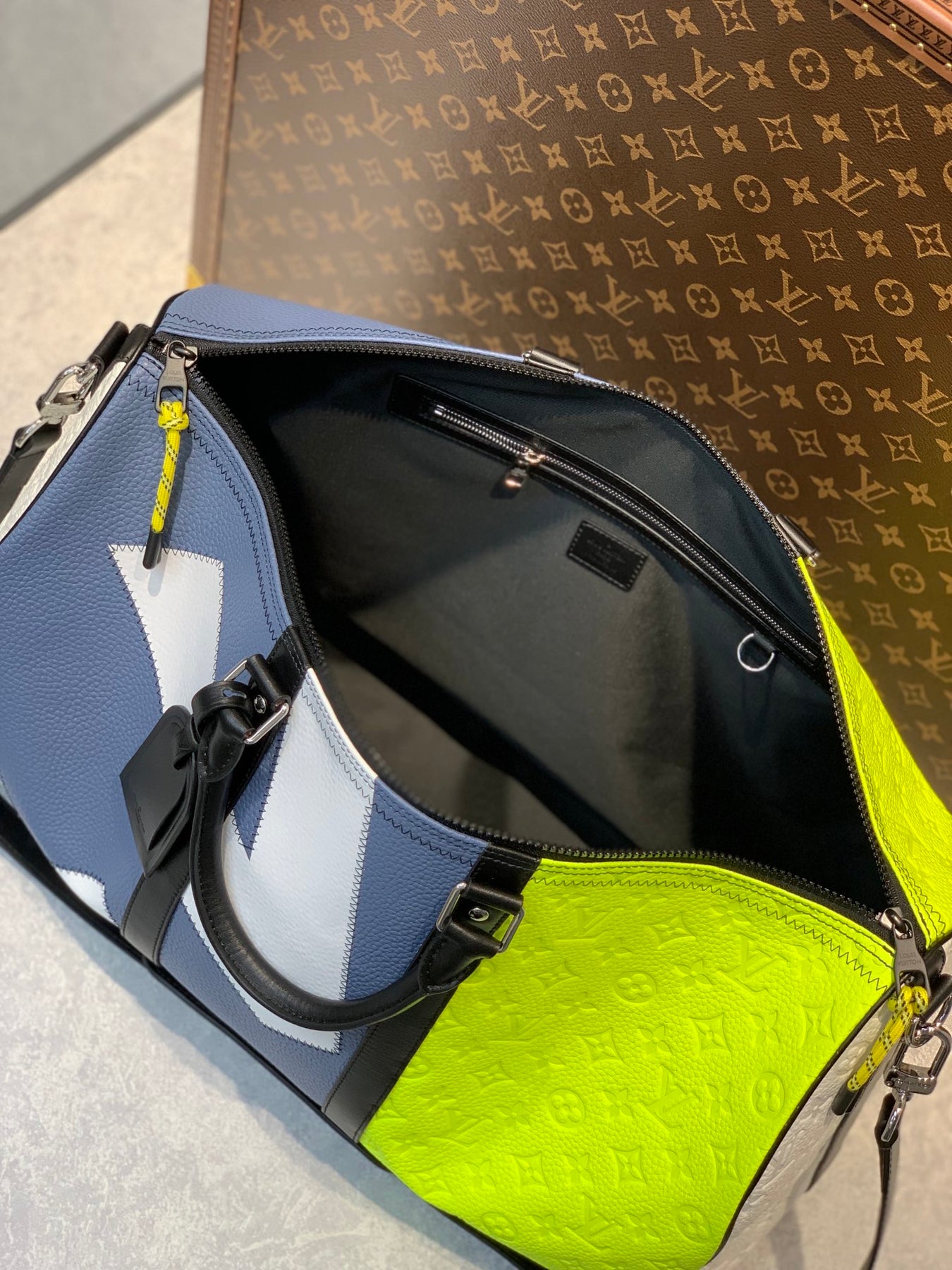 Elevate your travel experience with the Louis Vuitton Keepall Bandoulière 50. Crafted from premium grained cow leather and featuring Monogram-embossed accents, this travel bag embodies a sophisticated nautical style with striking color blocks. The distinctive zigzag stitching on the iconic LV letters pays tribute to traditional sailmaking techniques. With dimensions of 50.0 x 29.0 x 23.0 cm (length x height x width), it offers ample space for your essentials while maintaining a sleek silhouette. Perfect for both short trips and long journeys, this bag is the ultimate blend of luxury and functionality.
