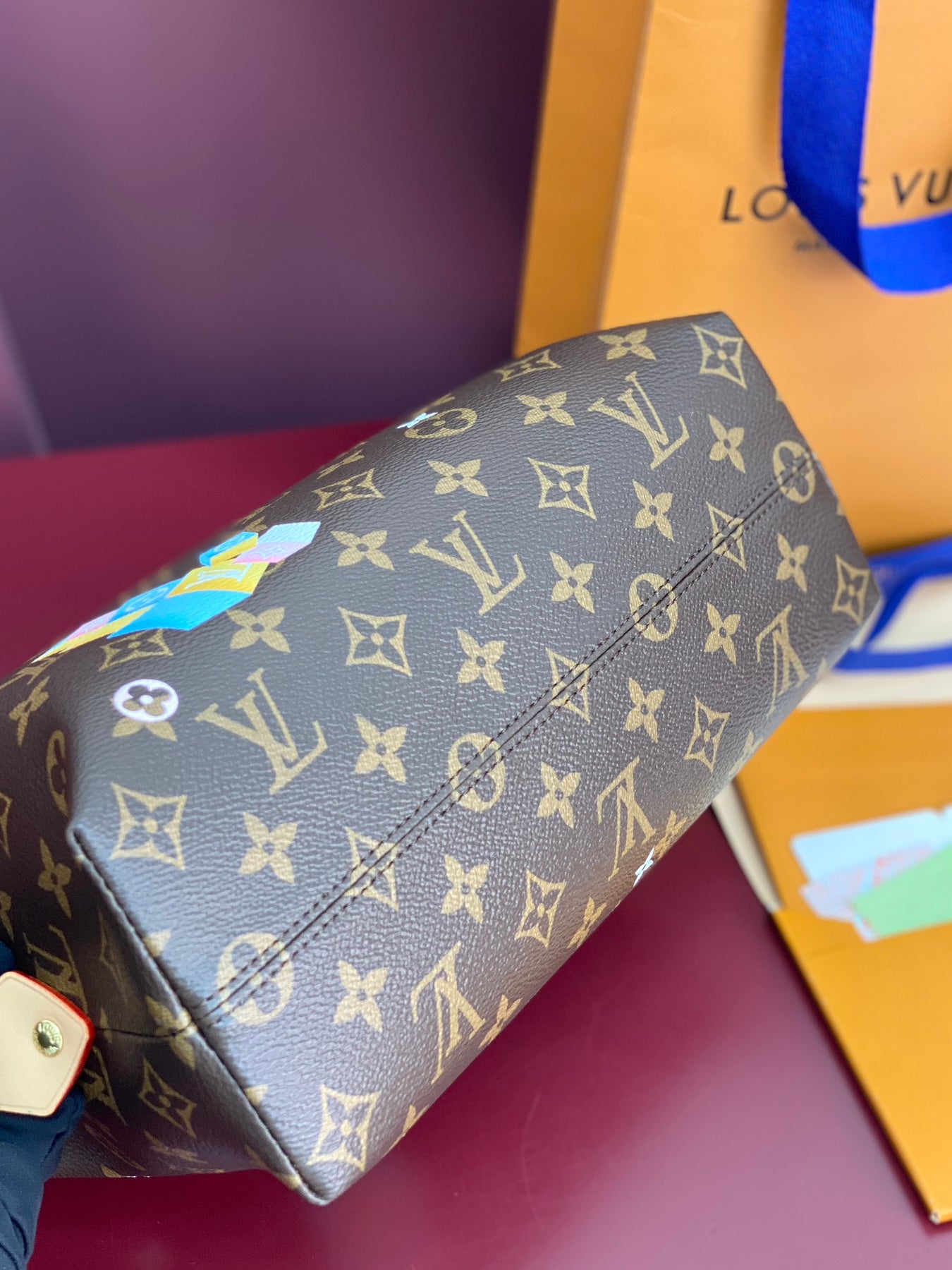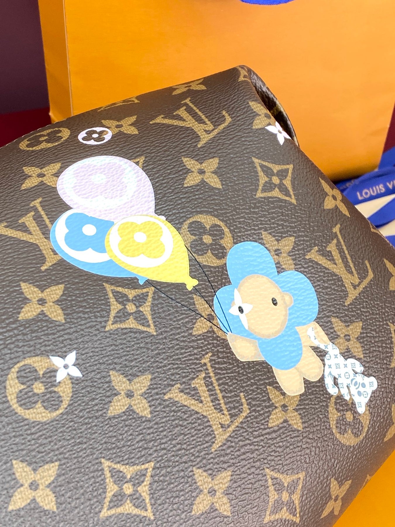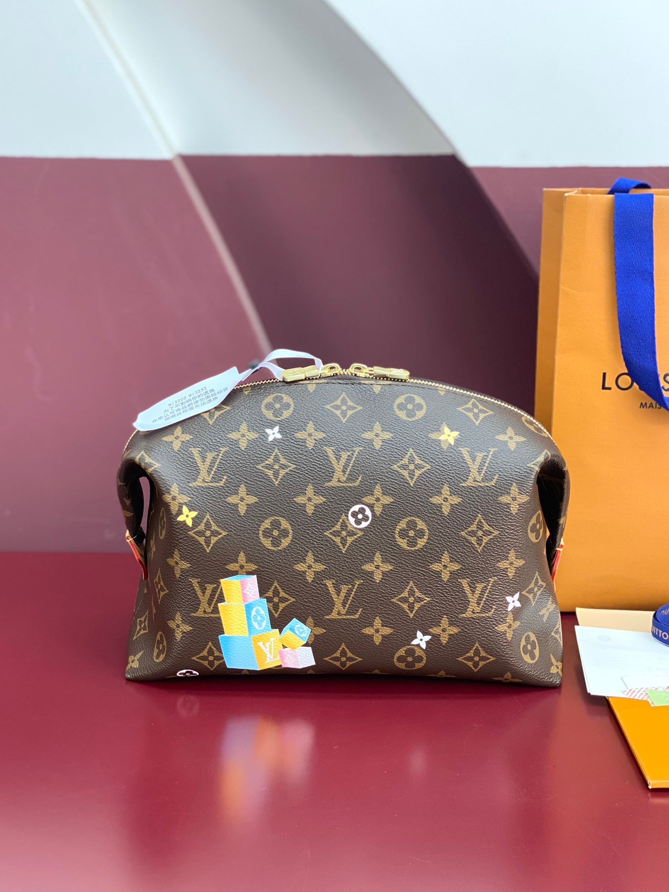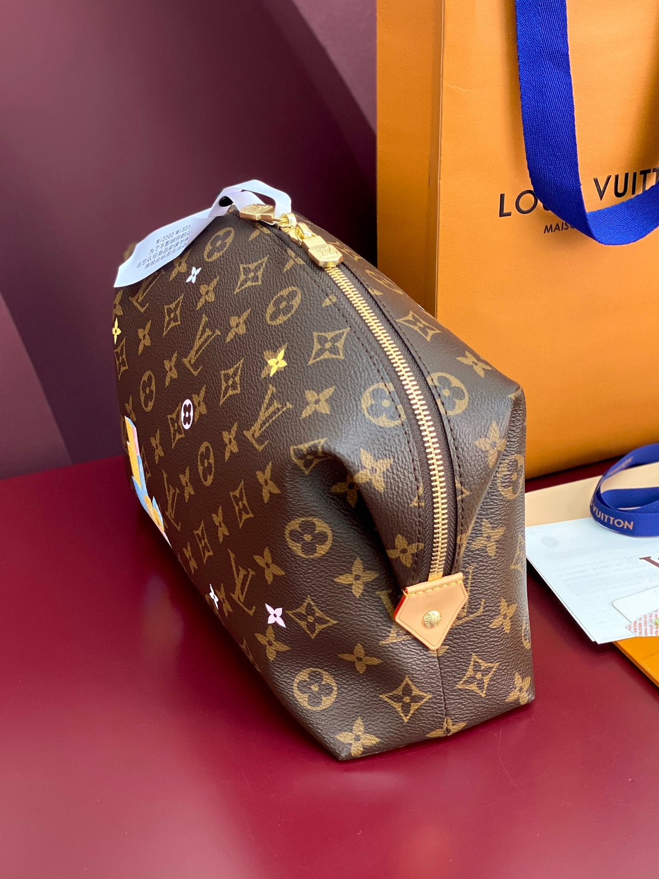 Vibrant brushstrokes highlight Louis Vuitton's beloved mascot, Vivienne, alongside playful mini Monogram flowers, adding a whimsical touch to its classic aesthetic. The interior includes a secure zippered patch pocket, providing practical organization for your cosmetics and essentials.