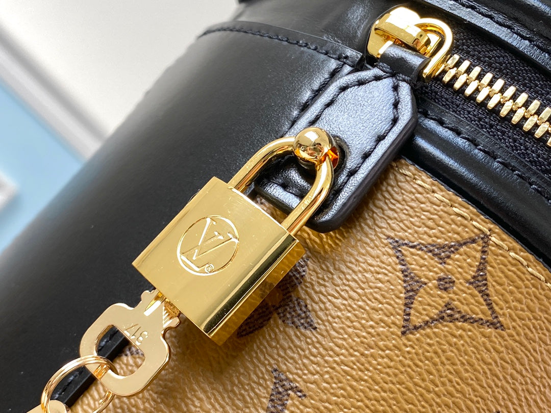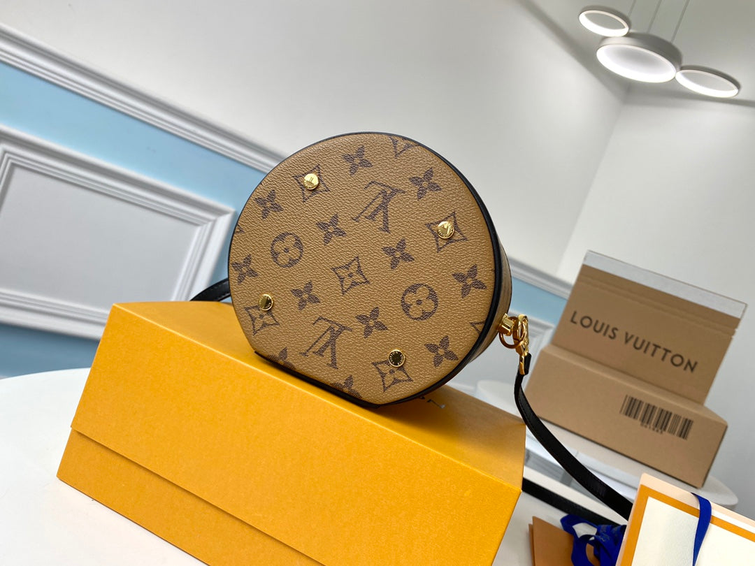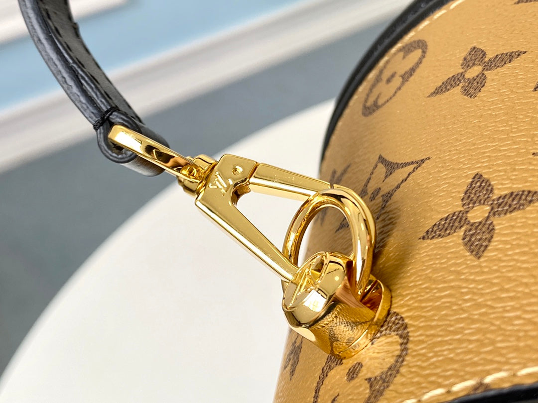 Experience timeless elegance with the Louis Vuitton M43986 handbag, meticulously crafted to echo the classic charm of the historic Cannes cosmetic case. Designed by women's artistic director Nicolas Ghesquière, this semi-rigid handbag features a blend of Monogram and Monogram Reverse coated canvas for a sophisticated look. Despite its compact size, measuring 15.0 x 17.0 x 15.0 cm, it offers versatility with a top handle and a removable leather shoulder strap, allowing for multiple carrying options. Elevate your style with this exquisite piece that embodies both tradition and modern artistry.