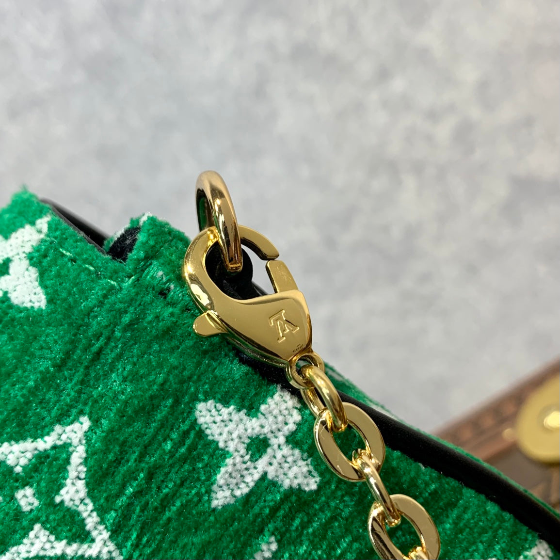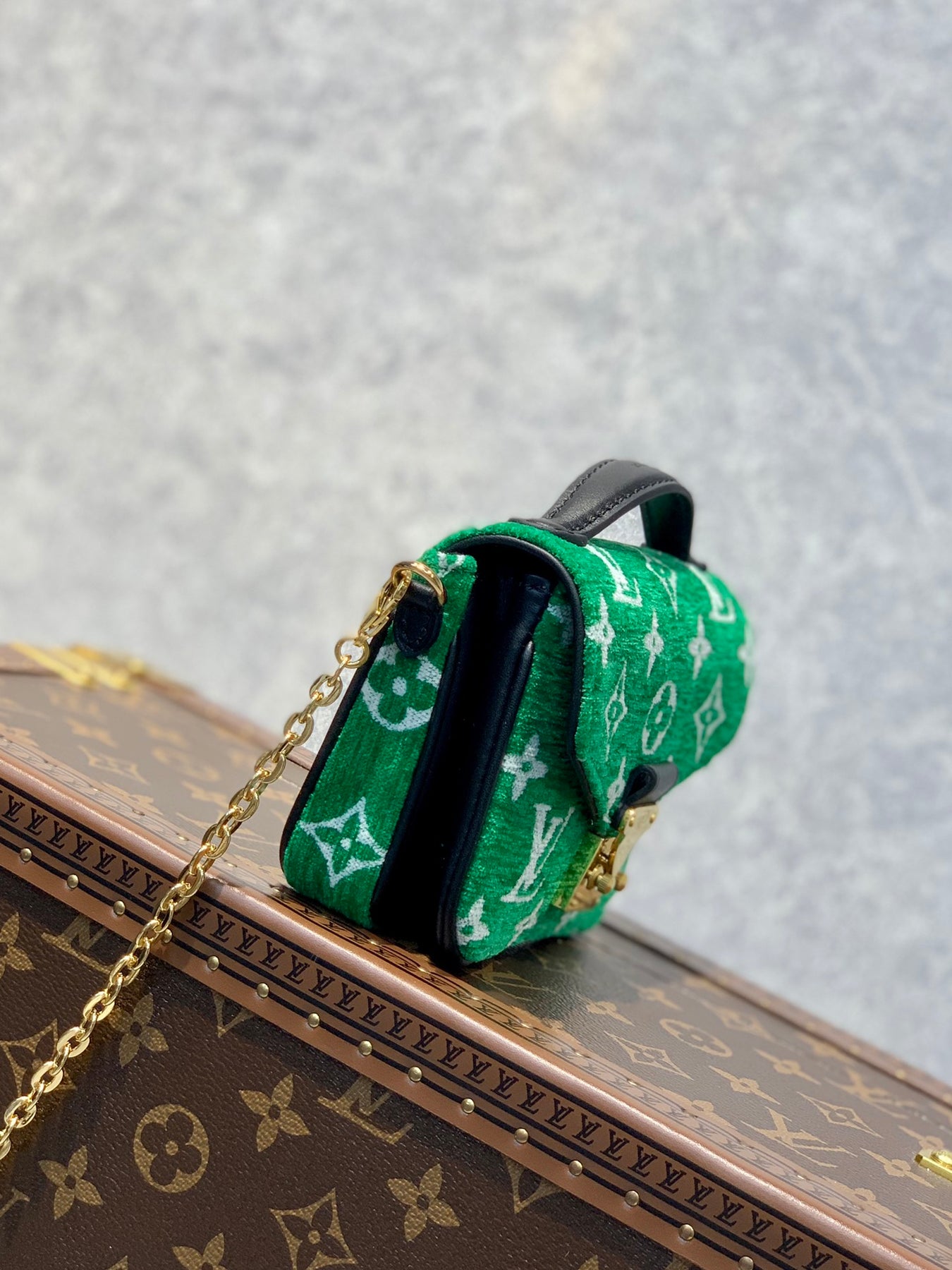 Introducing the Louis Vuitton Micro Métis Chain Bag in vibrant green, a standout piece from the LV Match series inspired by the thrill of premier tennis events. Crafted from luxurious Monogram jacquard velvet made from recycled yarn, this bag boasts a sleek, pocket-friendly design that perfectly complements any outfit. The signature S-lock clasp, echoing Louis Vuitton's heritage of hard luggage, adds a touch of sophistication to the iconic Métis silhouette. Featuring a detachable chain, this versatile bag can be worn in multiple stylish ways.
