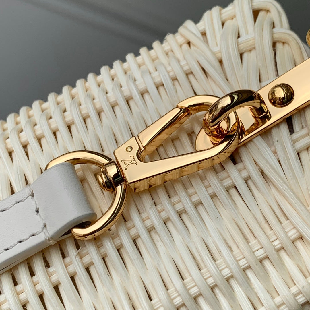 Introducing the Louis Vuitton Mini Capucines Bag, a stunning homage to the brand's iconic Picnic trunk from 1892. This exquisite handbag is crafted with meticulous attention to detail, featuring a beautiful rattan body that takes days of skilled weaving to complete. Adorned with luxurious leather trim and the signature LV monogram, this bag offers a perfect blend of elegance and summer vibes. Versatile in design, it can be worn cross-body, on the shoulder, or carried by hand.