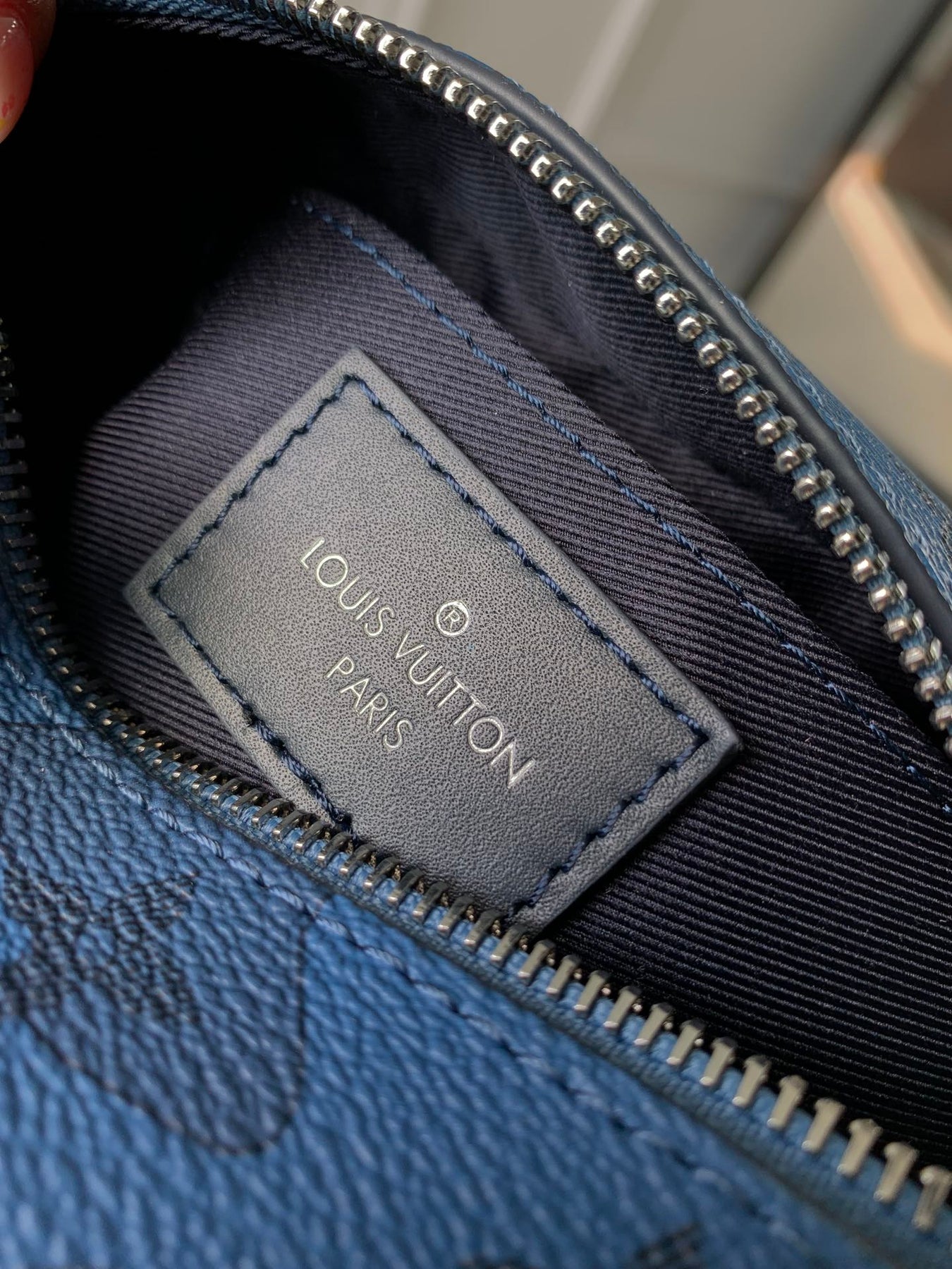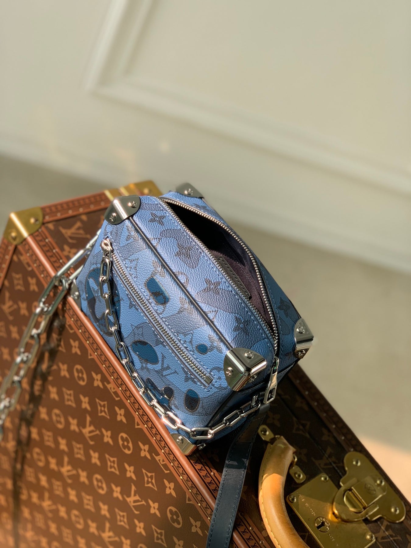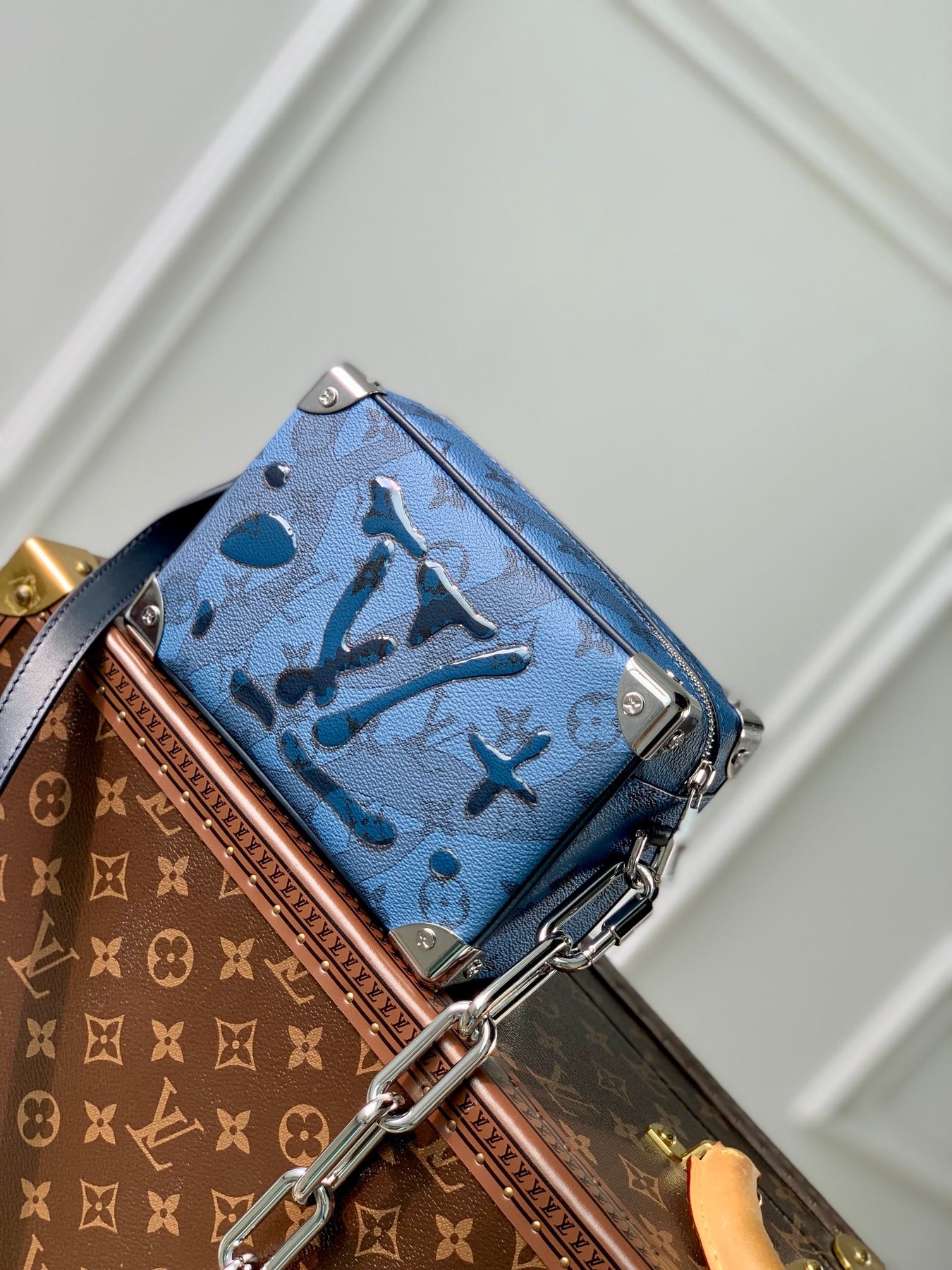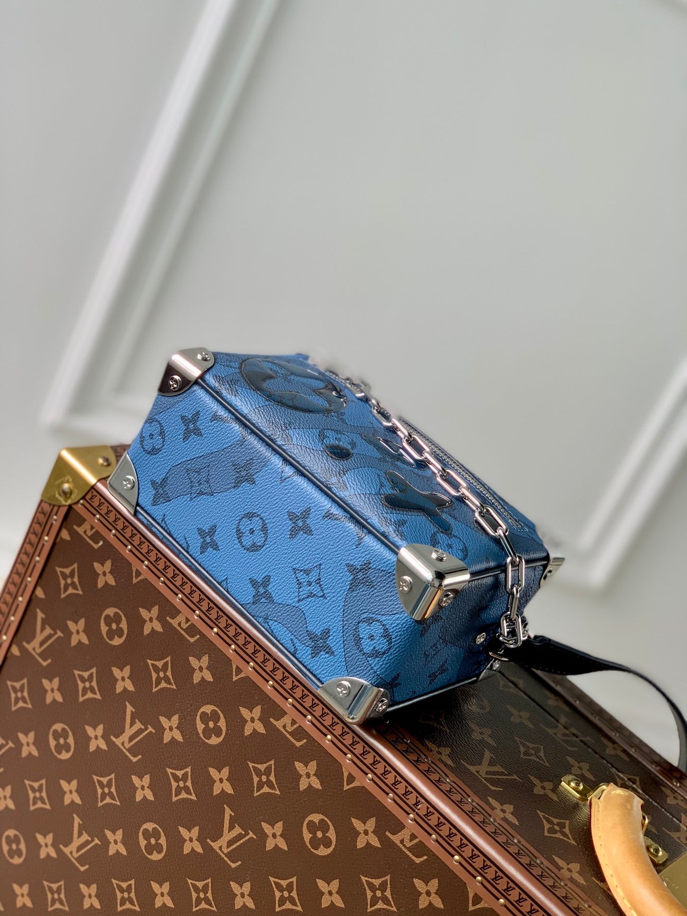Introducing the Louis Vuitton Mini Soft Trunk Bag in striking blue from the exclusive M22588 Box Bag Series. Crafted using innovative inkjet printing technology, this handbag features a mesmerizing design that mimics water droplets gliding over the iconic LV letters and Monogram flowers, enhancing the three-dimensional effect of the Monogram Aquagarden canvas.