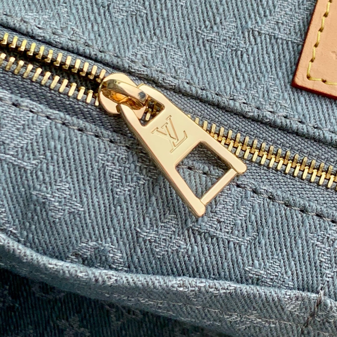 Introducing the Louis Vuitton OnTheGo MM Handbag, a triumphant return of the iconic Monogram Denim pattern first introduced in 2005. Crafted from organic cotton fabric woven with black and white threads, this bag features a unique dyeing technique by Louis Vuitton that enhances its vintage aesthetic. Designed to accommodate your laptop and daily essentials, the handbag is adorned with light gold metal accents, signature details, and natural leather trimming, complete with a detachable luggage tag.