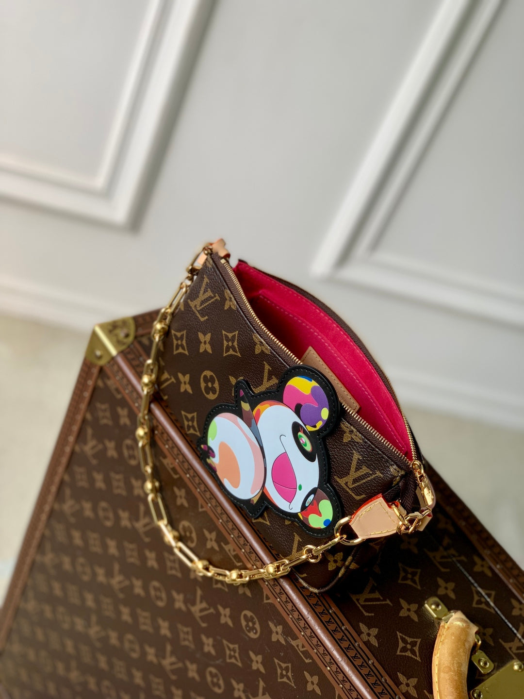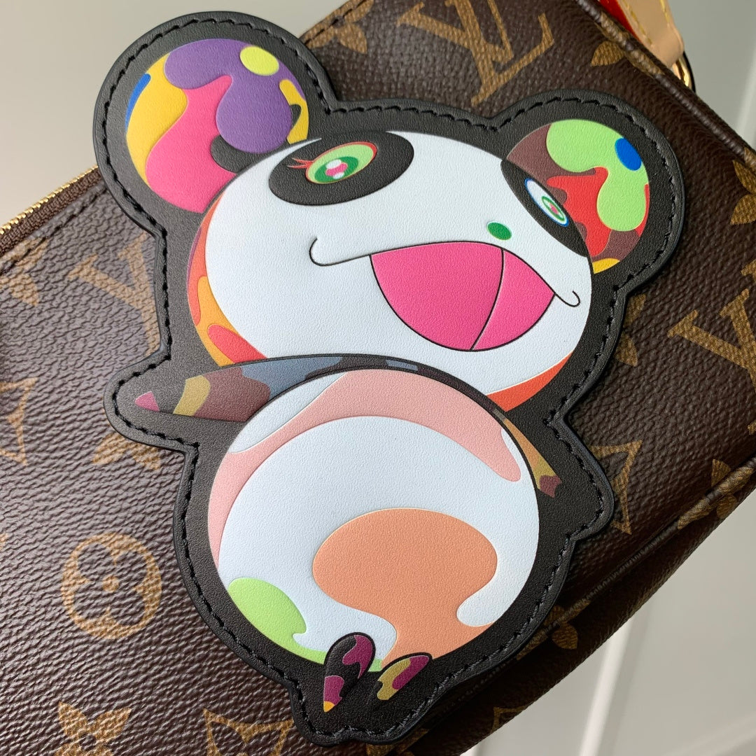 Discover the vibrant Louis Vuitton x Murakami Pochette Accessoires, a stunning reissue that celebrates artistry and style. Crafted from durable Monogram coated canvas, this bag features a playful panda design that adds a whimsical touch to the classic silhouette. The secure zipper closure ensures your essentials are safe, while the detachable cowhide leather shoulder strap and dazzling chain provide versatile carrying options. Perfect for everyday use, this bag measures 13 x 4 x 22 cm (height x width x length), making it both stylish and functional. Elevate your accessory game with this unique collaboration!