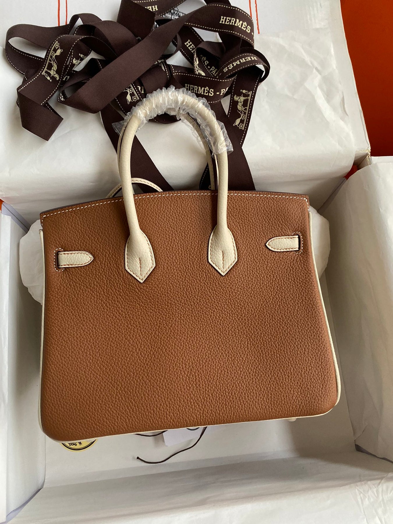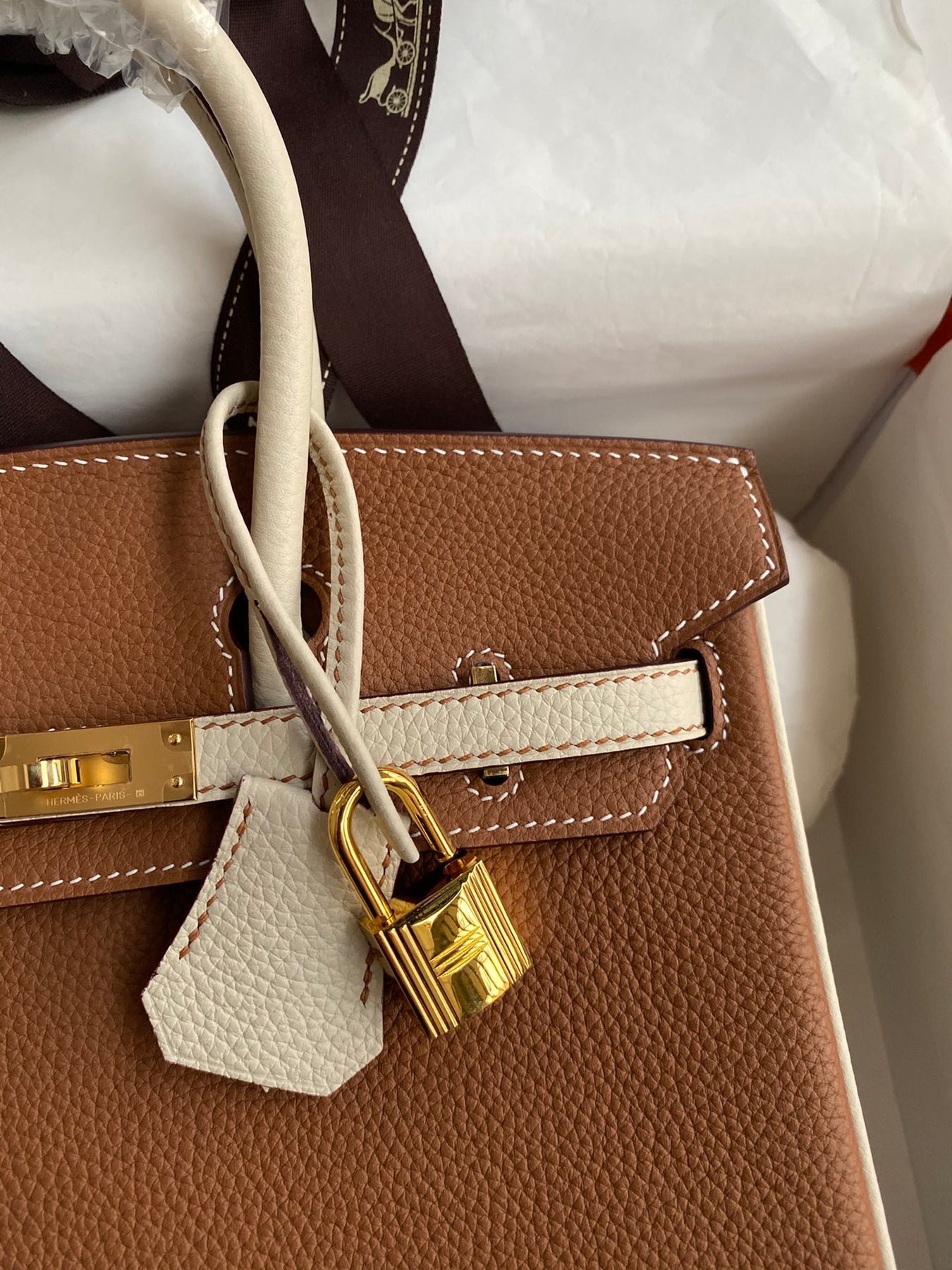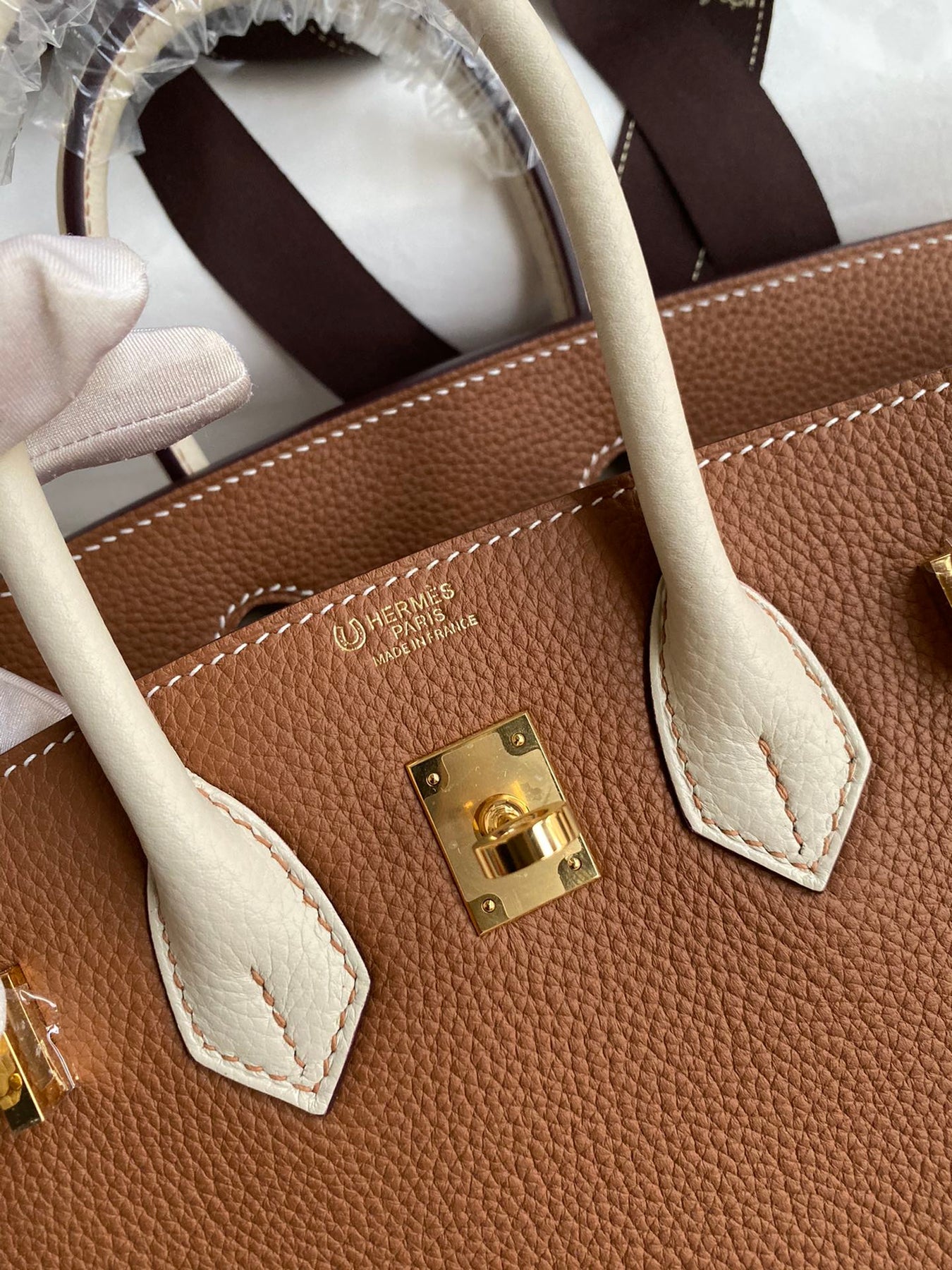 Elevate your accessory collection with our exquisite Birkin 25cm handbag, crafted from imported Togo leather. This stunning piece features a beautiful combination of golden brown and milkshake white tones, accented with meticulous semi-handmade beeswax stitching. The gold-tone buckle adds a touch of elegance, making this handbag a perfect addition to both casual and formal outfits. Experience the blend of luxury and artisanal craftsmanship with this timeless accessory.