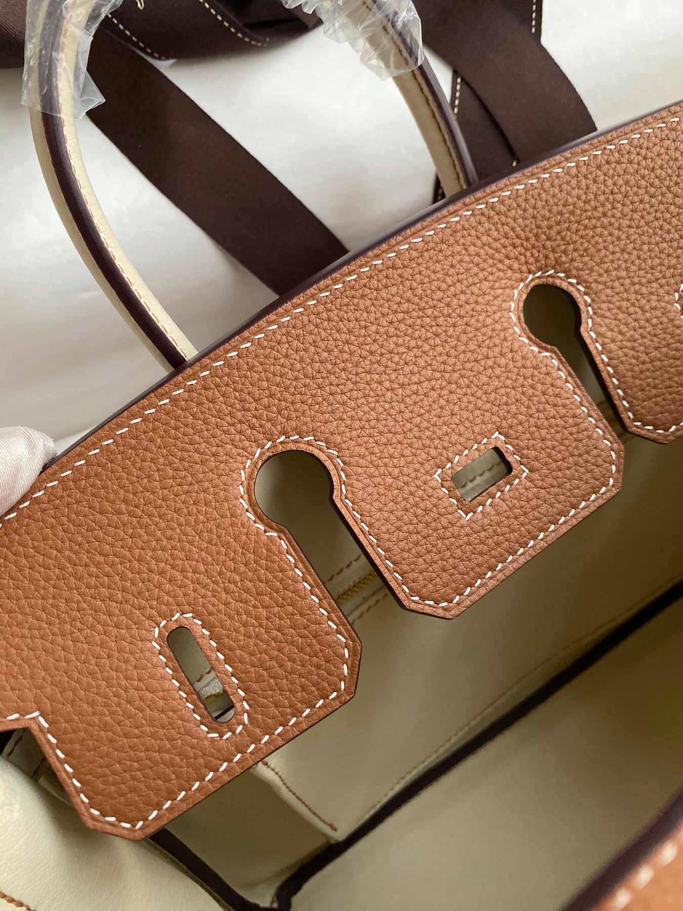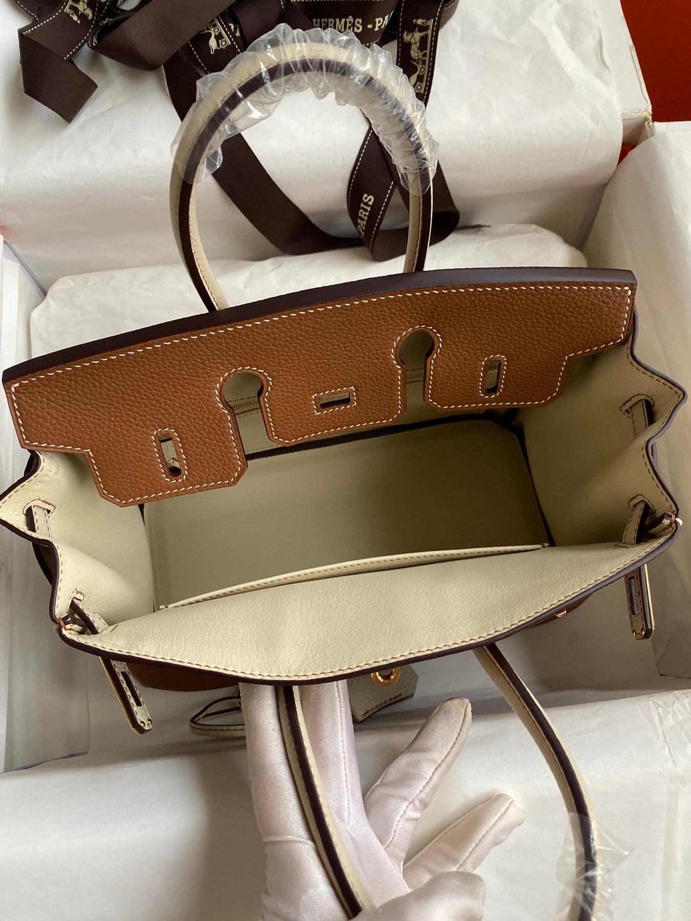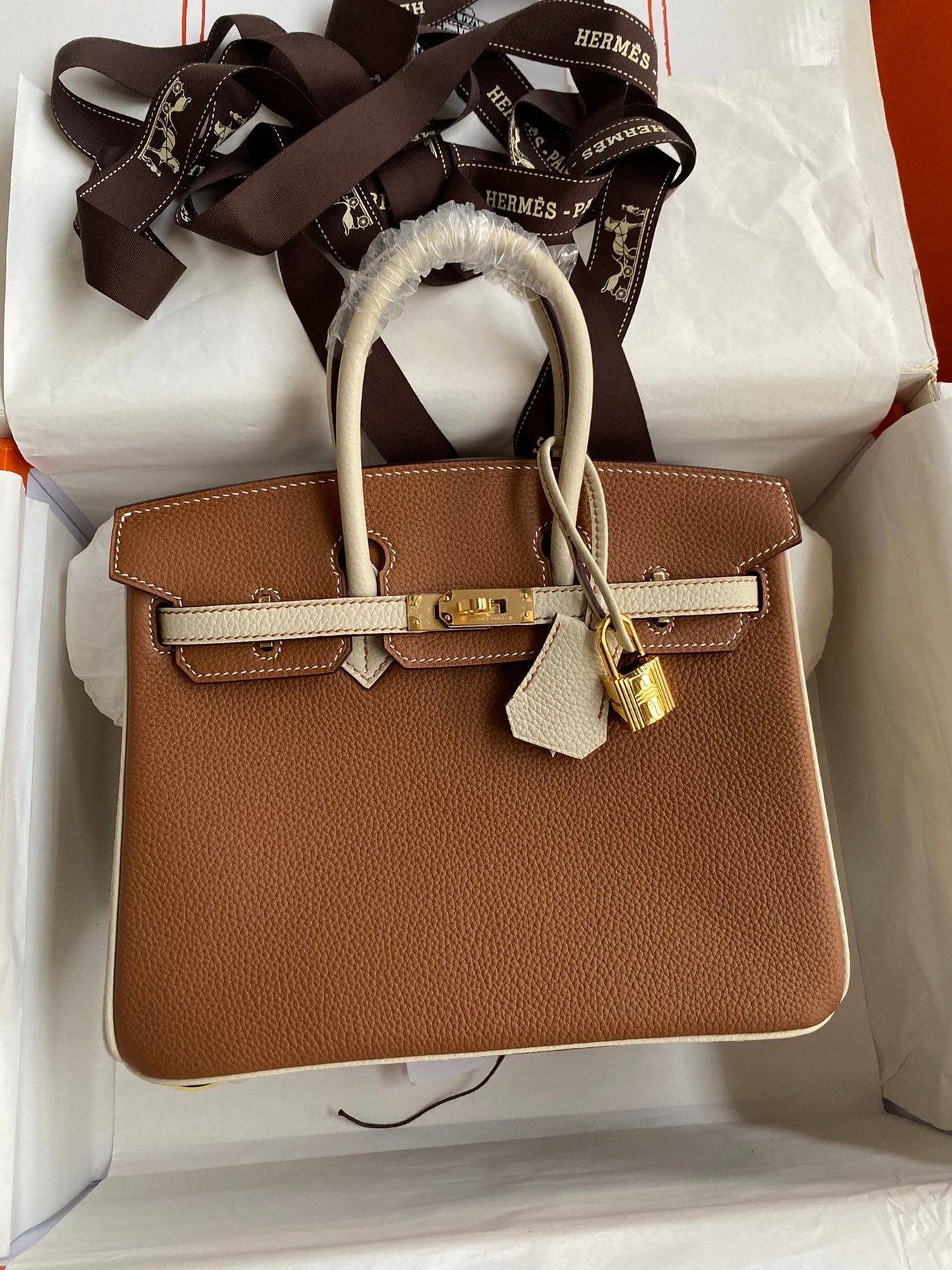 Elevate your accessory collection with our exquisite Birkin 25cm handbag, crafted from imported Togo leather. This stunning piece features a beautiful combination of golden brown and milkshake white tones, accented with meticulous semi-handmade beeswax stitching. The gold-tone buckle adds a touch of elegance, making this handbag a perfect addition to both casual and formal outfits. Experience the blend of luxury and artisanal craftsmanship with this timeless accessory.