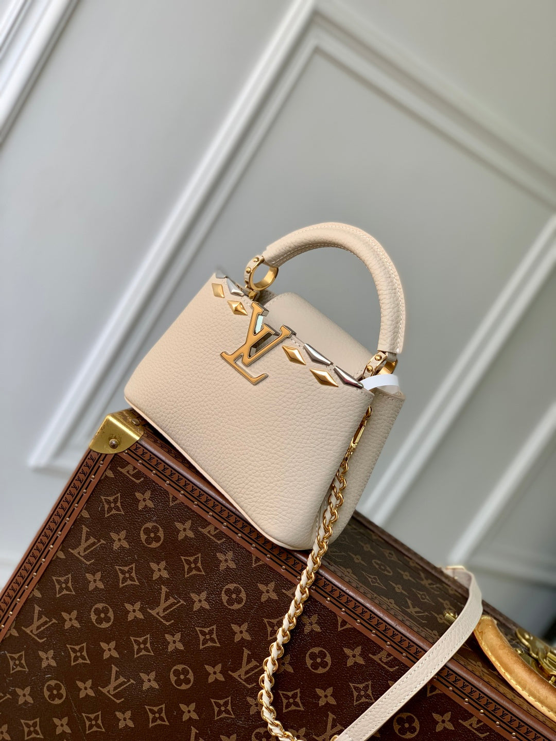 Elevate your style with the Capucines Mini Handbag, expertly crafted from premium Taurillon leather. This elegant handbag features stunning diamond-shaped metal accents along the upper edge, showcasing the latest seasonal design. The versatile flip cover allows for two storage options—external or internal—while spacious compartments inside ensure you can easily carry all your essentials while on the go.