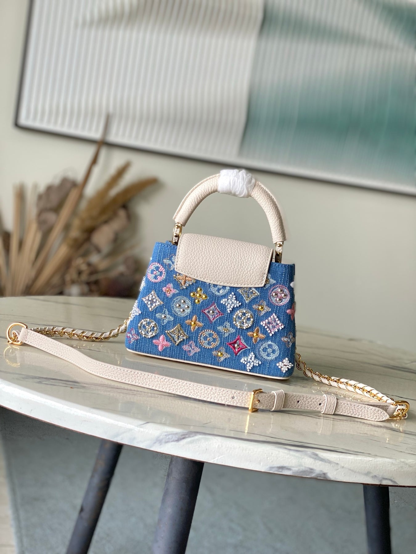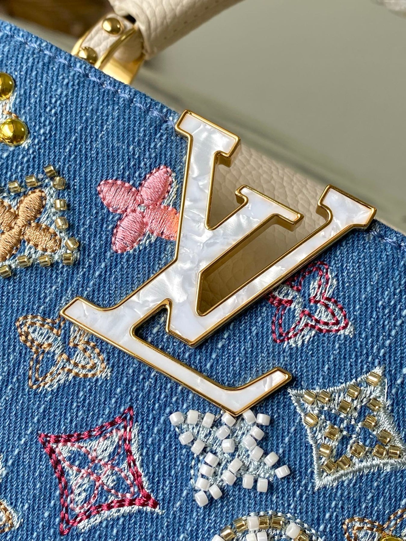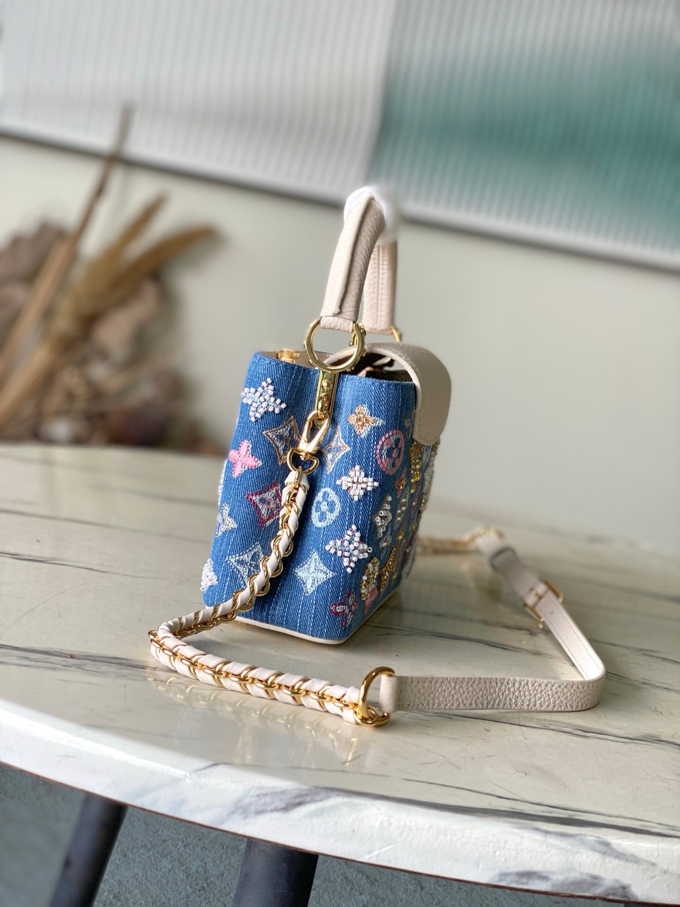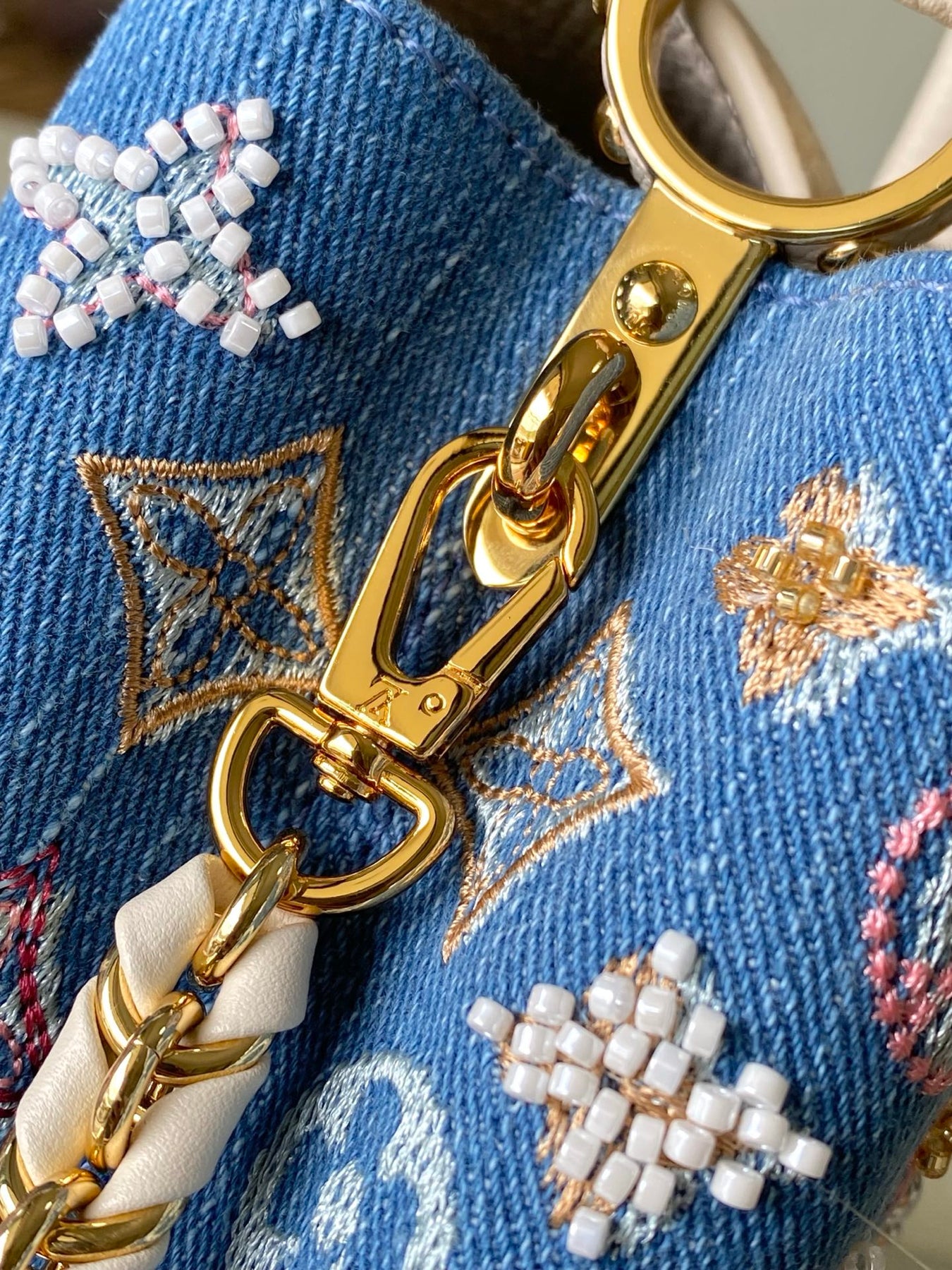 The LV Capucines Mini Handbag is a stunning blend of style and functionality. Crafted from premium Monogram denim, this special-grade handbag features intricate bead and thread embroidery, creating a unique texture. The iconic LV letters are complemented by woven chains with metallic accents, while contrasting leather trim adds a sophisticated touch.