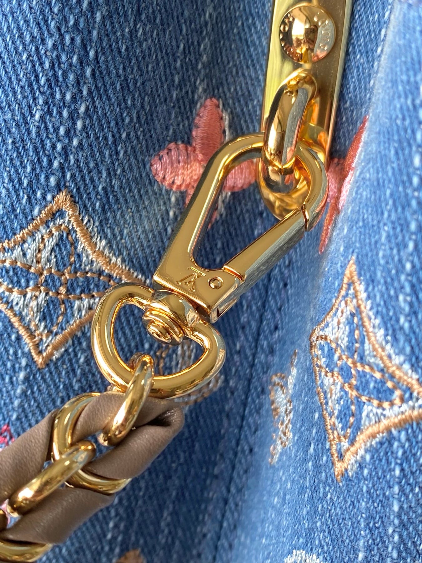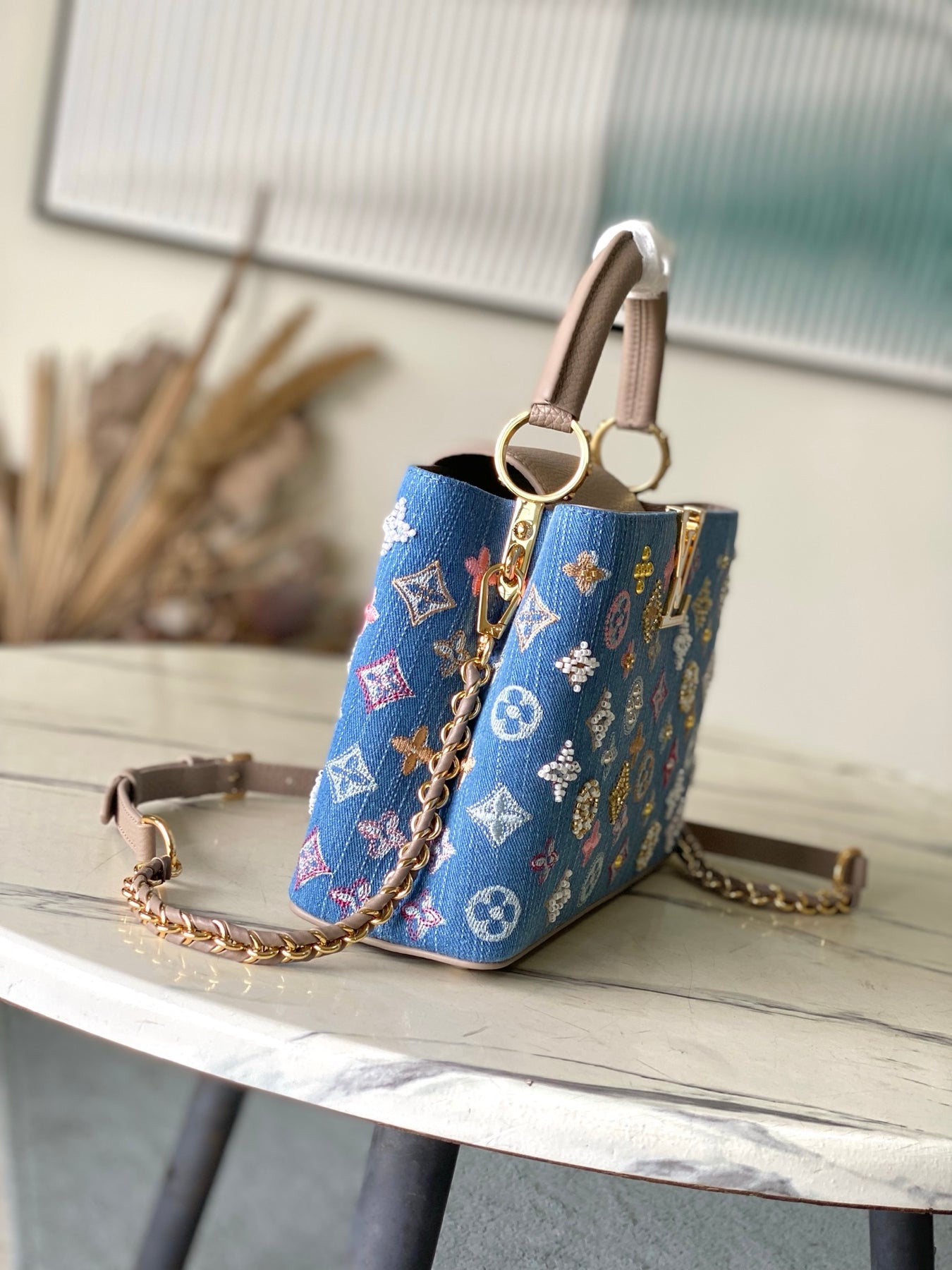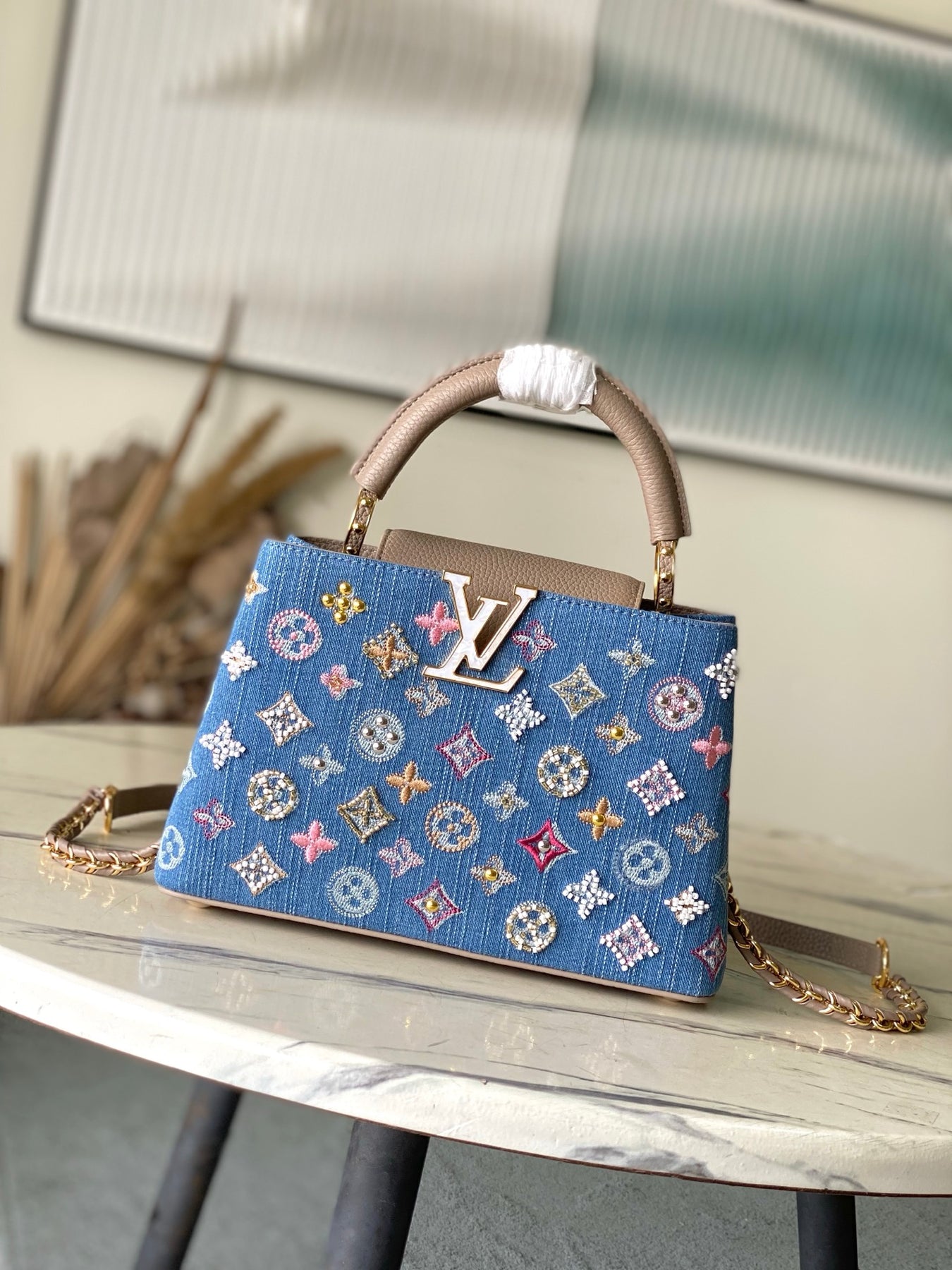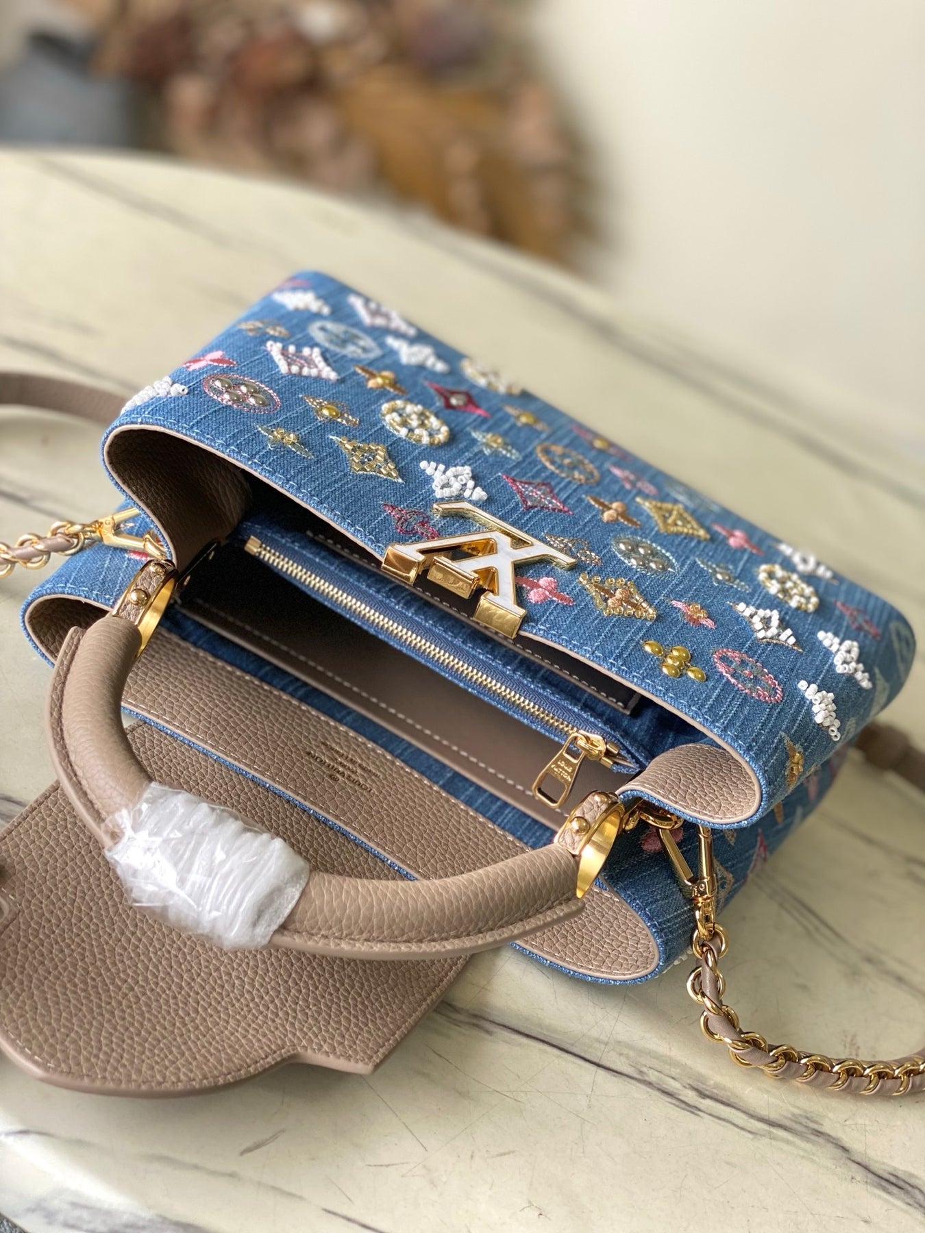 Elevate your style with the LV Capucines Small Handbag, a quintessential accessory meticulously crafted from premium Monogram denim. Adorned with intricate bead embroidery and decorative threads, this chic handbag features iconic LV letters and woven chains with a metallic finish. The striking contrasting leather trim adds a touch of sophistication. Designed for versatility, the flip cover can be styled externally or tucked neatly inside, and the well-organized inner layer ensures you stay effortlessly organized. With dimensions of 18 × 27 × 9 cm, this small yet functional handbag is perfect for day-to-night transitions. Experience luxury with every wear.