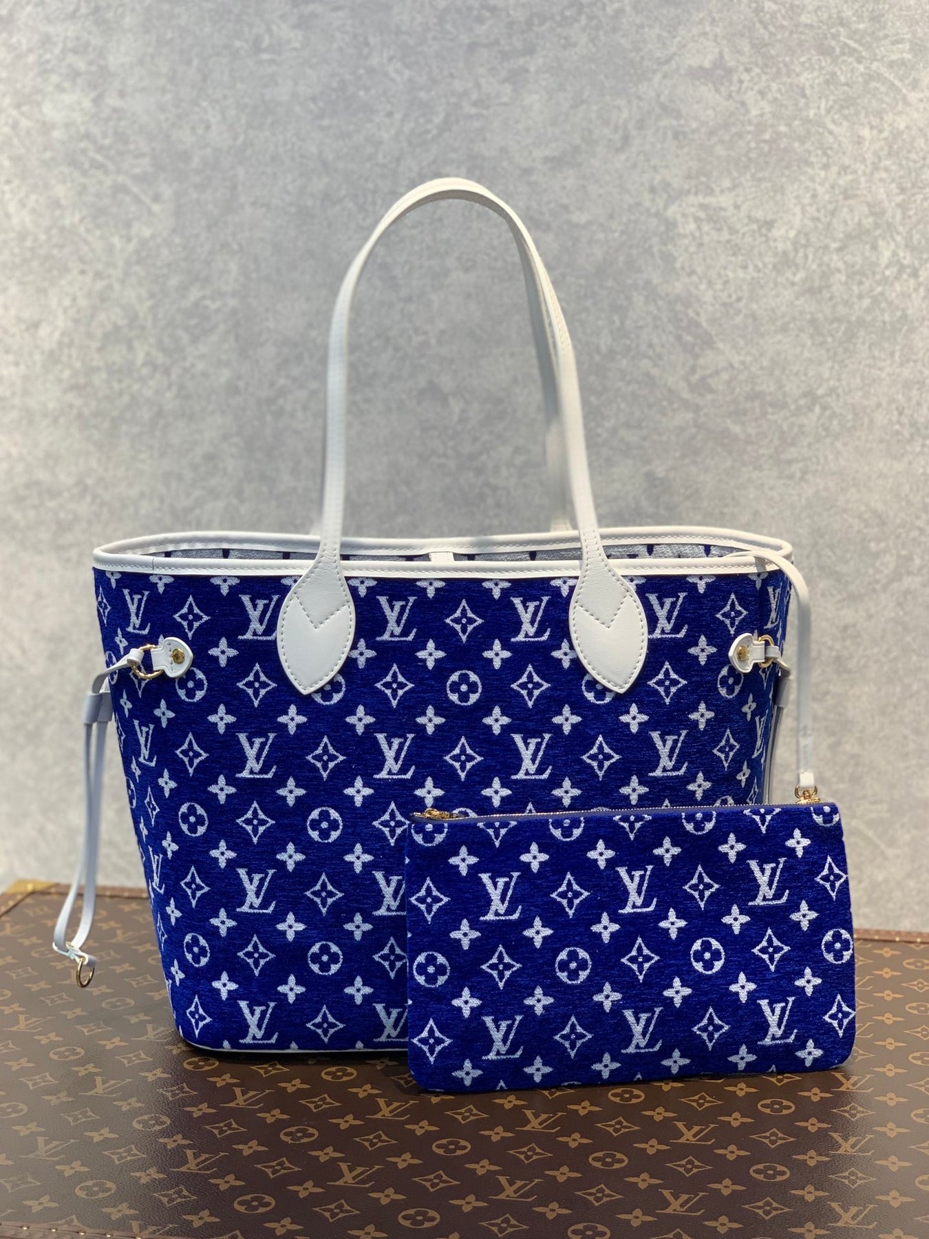 Introducing the LV Match Neverfull MM Sports Bag in a striking blue hue, inspired by the dynamic world of tennis. Part of the exclusive LV Match series, this luxurious bag is crafted from durable monogram jacquard velvet, designed to withstand the test of time. The elegant white leather trim and gold-tone metallic accents elevate its sophisticated appeal. Inside, the bag features a captivating reverse-shaded monogram lining that adds depth and uniqueness to the design.