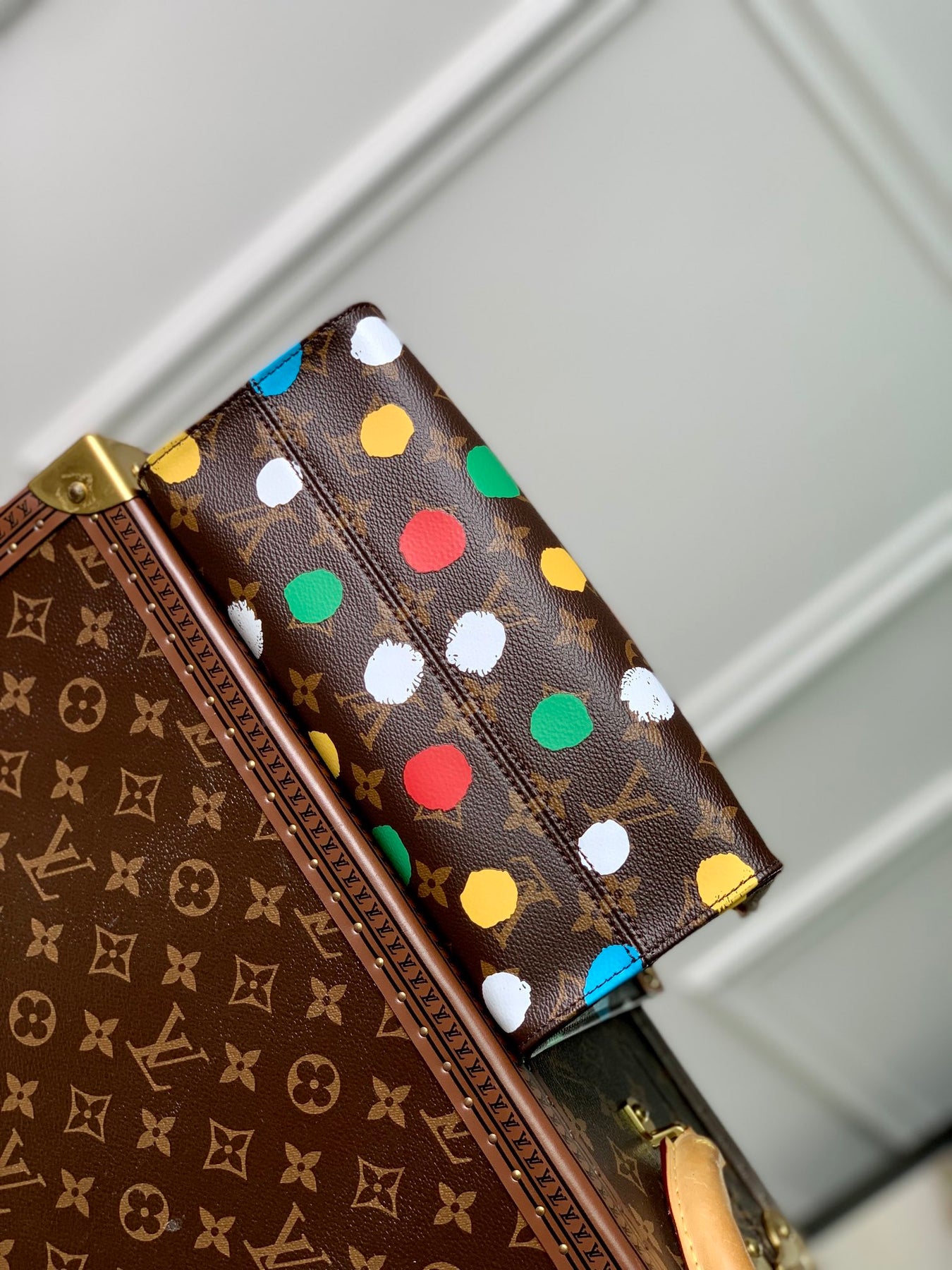 Introducing the LV x Yayoi Kusama OnTheGo Small Handbag, the latest masterpiece from Louis Vuitton's celebrated collaboration with renowned Japanese artist Yayoi Kusama. This stylish handbag showcases Kusama's iconic polka dot design, meticulously crafted using a multi-step printing process that evokes the essence of her artistic vision on our classic Monogram canvas.