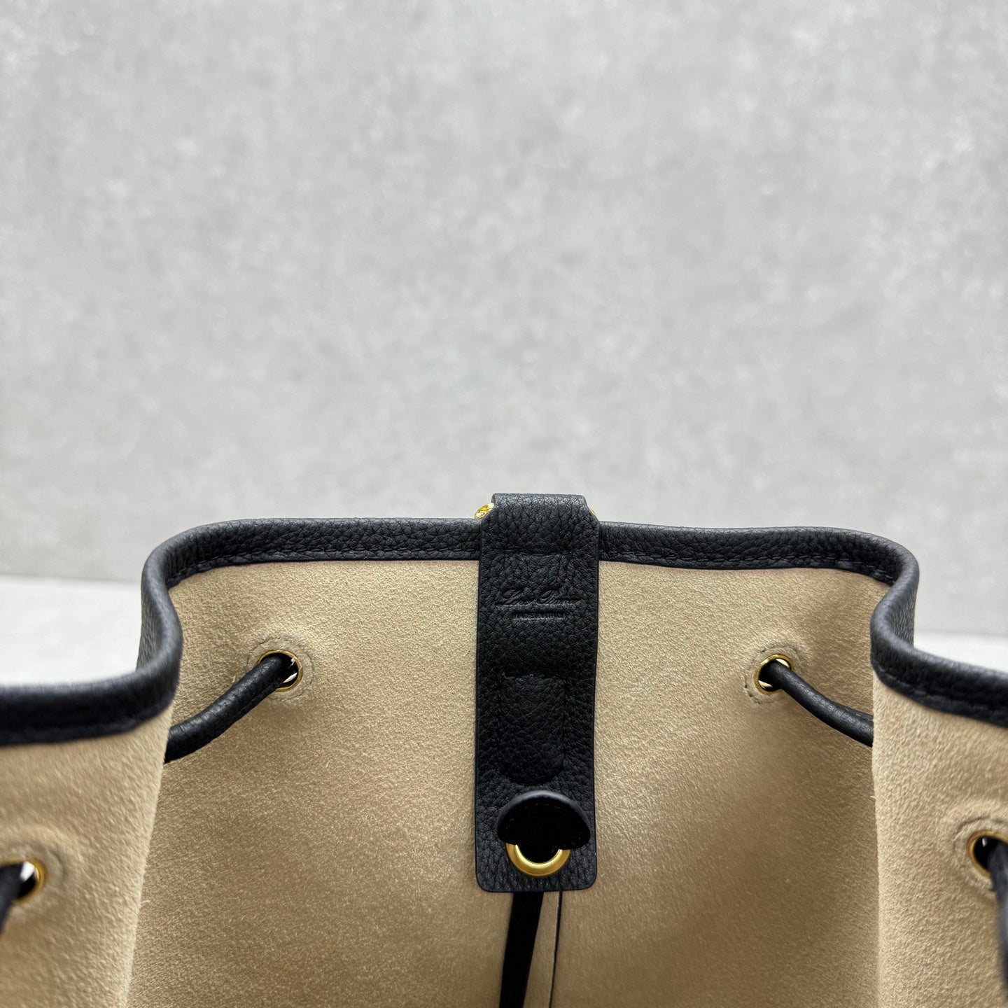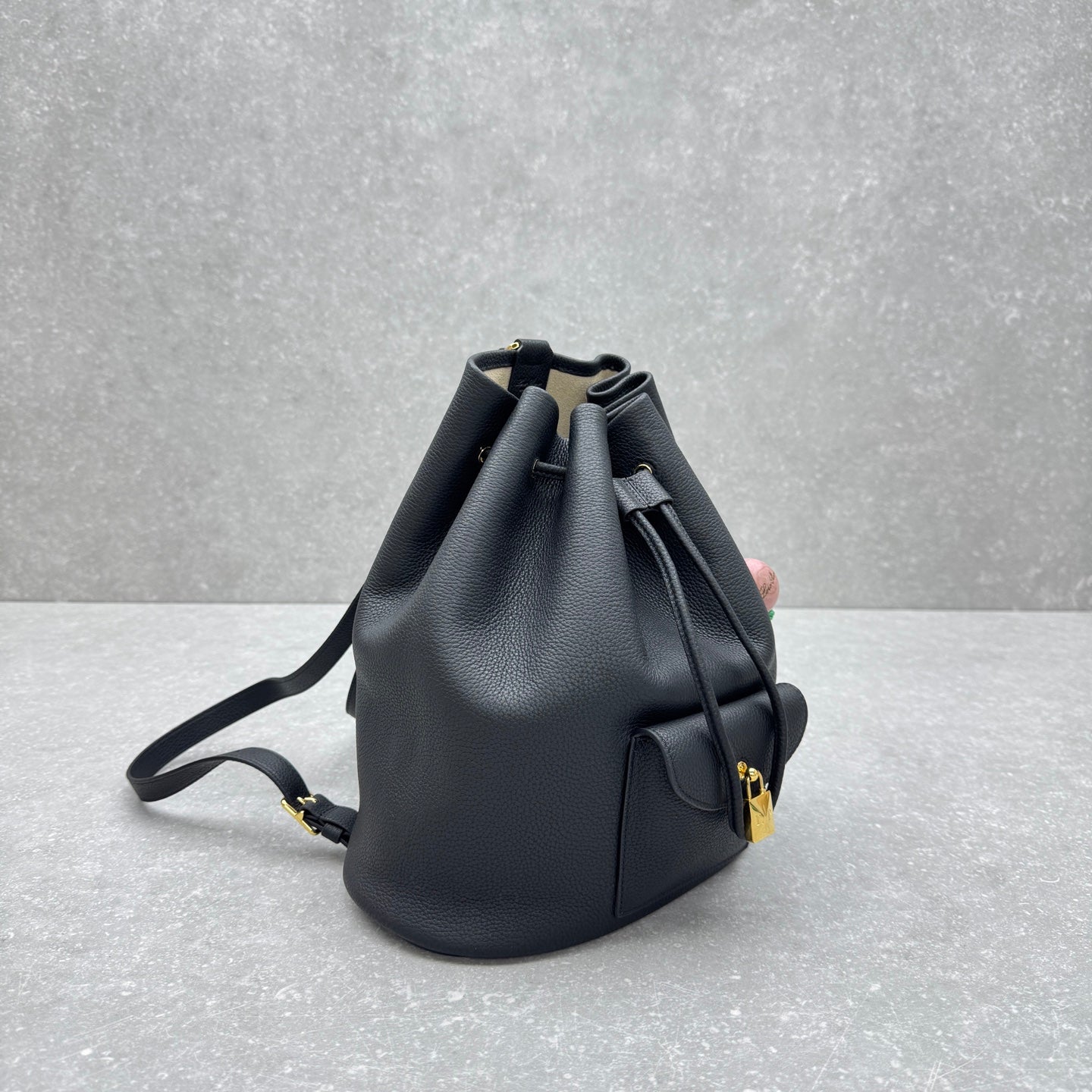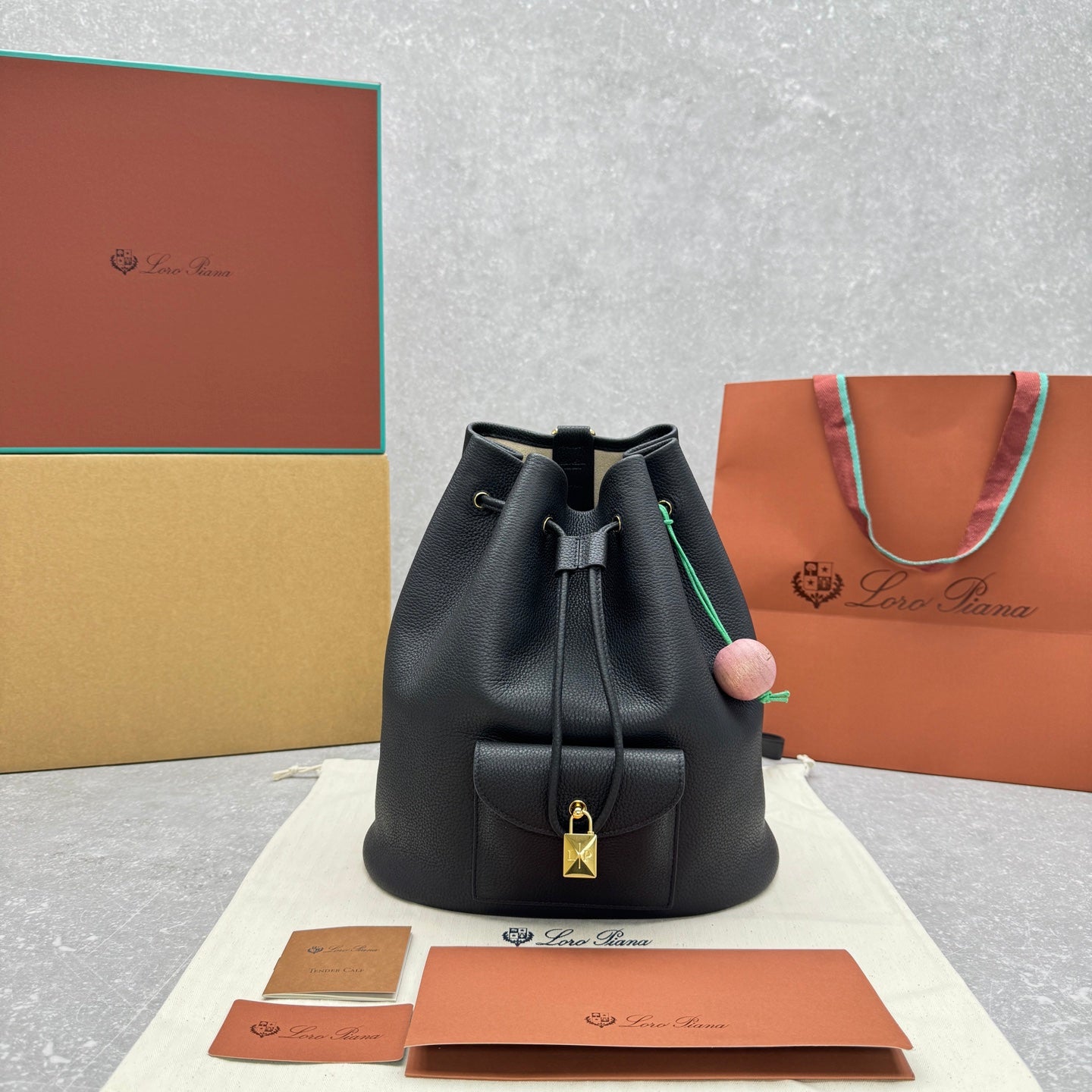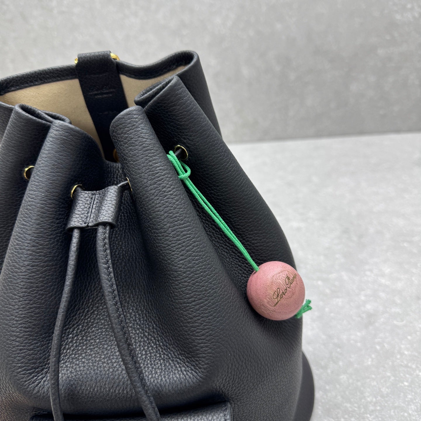 Introducing the Loropian New Bucket Backpack in an elegant Lychee/Black colorway. This sophisticated accessory from our Extra series combines a crisp, stylish appearance with a remarkably soft texture. Designed for both practicality and fashion, this drawstring backpack features iconic detailing that enhances its aesthetic appeal.