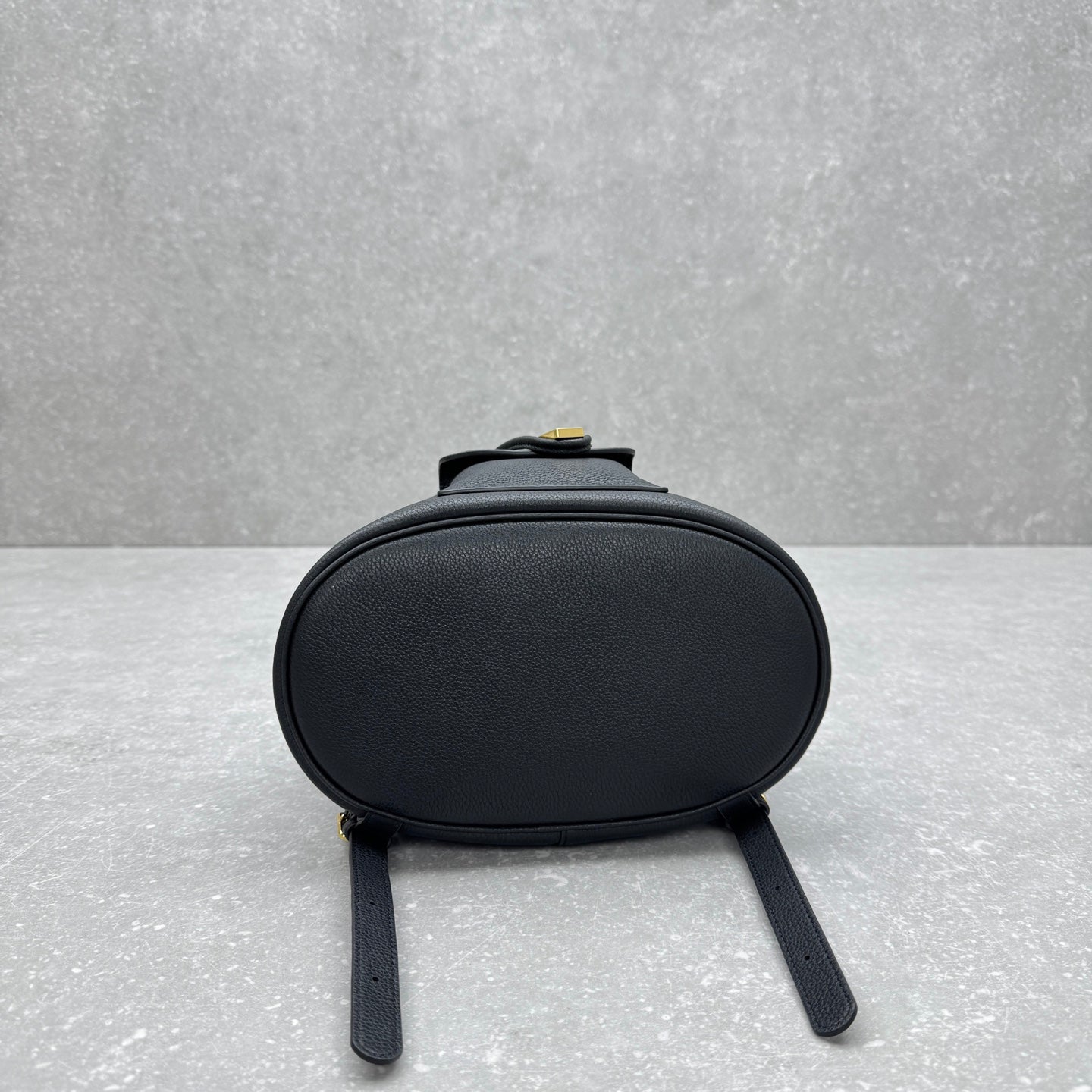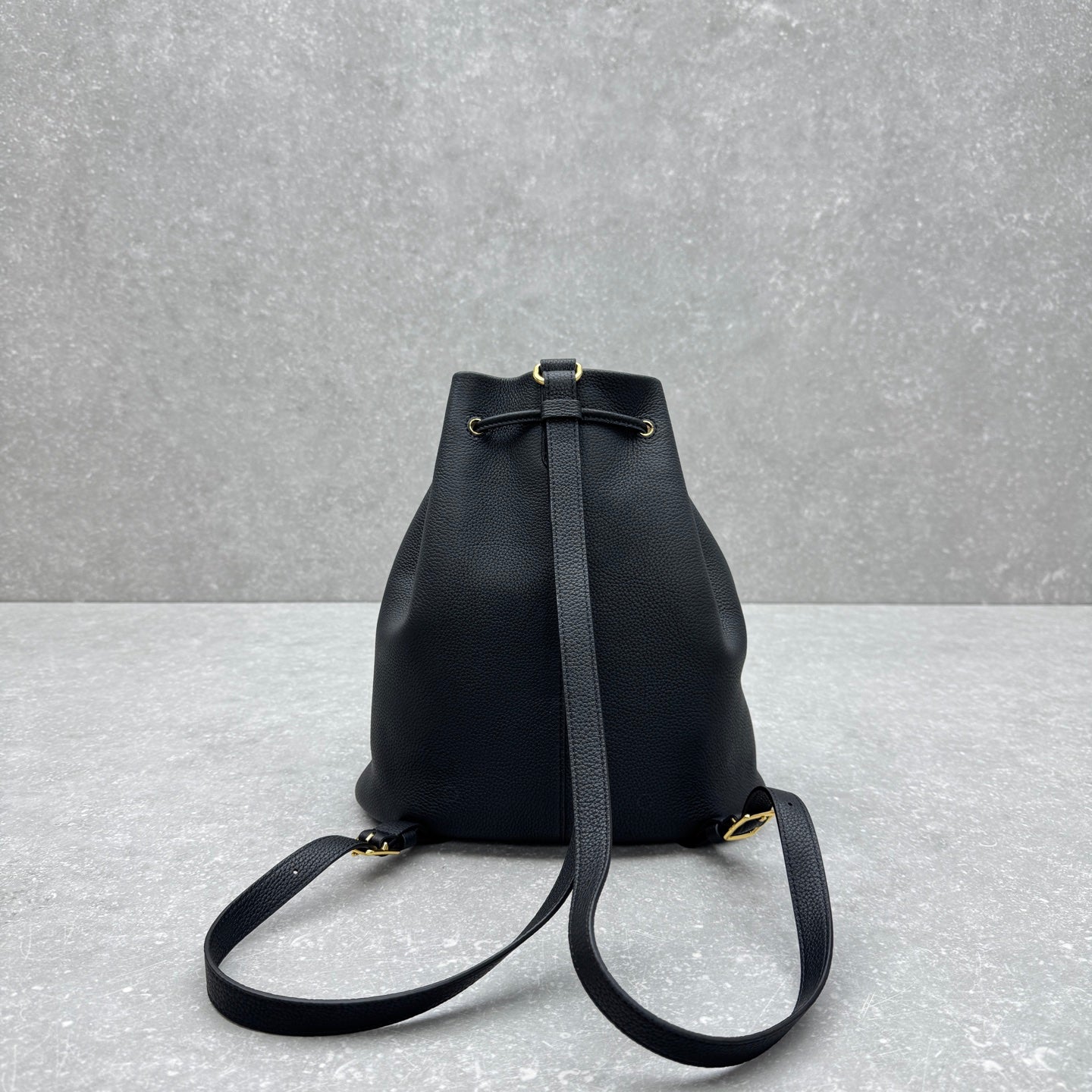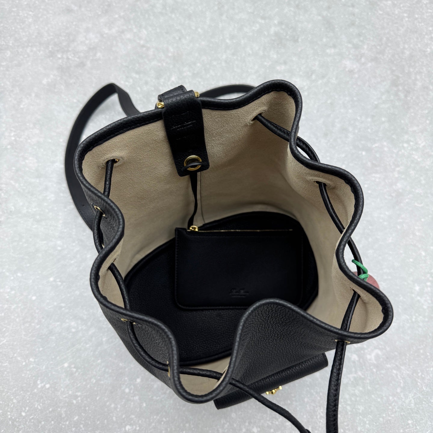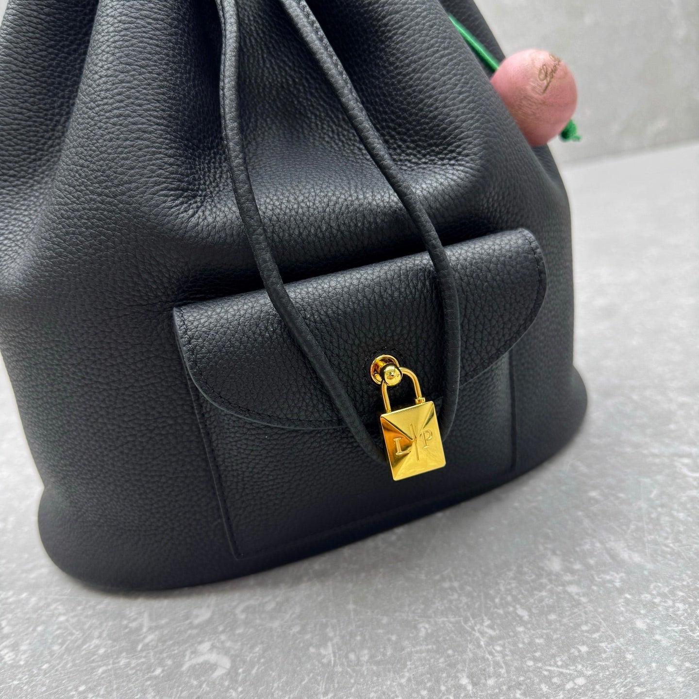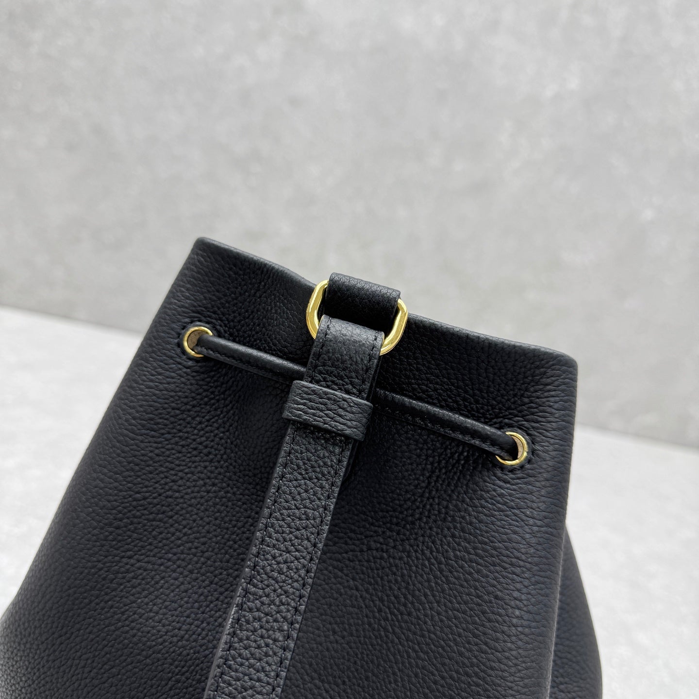 Introducing the Loropian New Bucket Backpack in an elegant Lychee/Black colorway. This sophisticated accessory from our Extra series combines a crisp, stylish appearance with a remarkably soft texture. Designed for both practicality and fashion, this drawstring backpack features iconic detailing that enhances its aesthetic appeal.