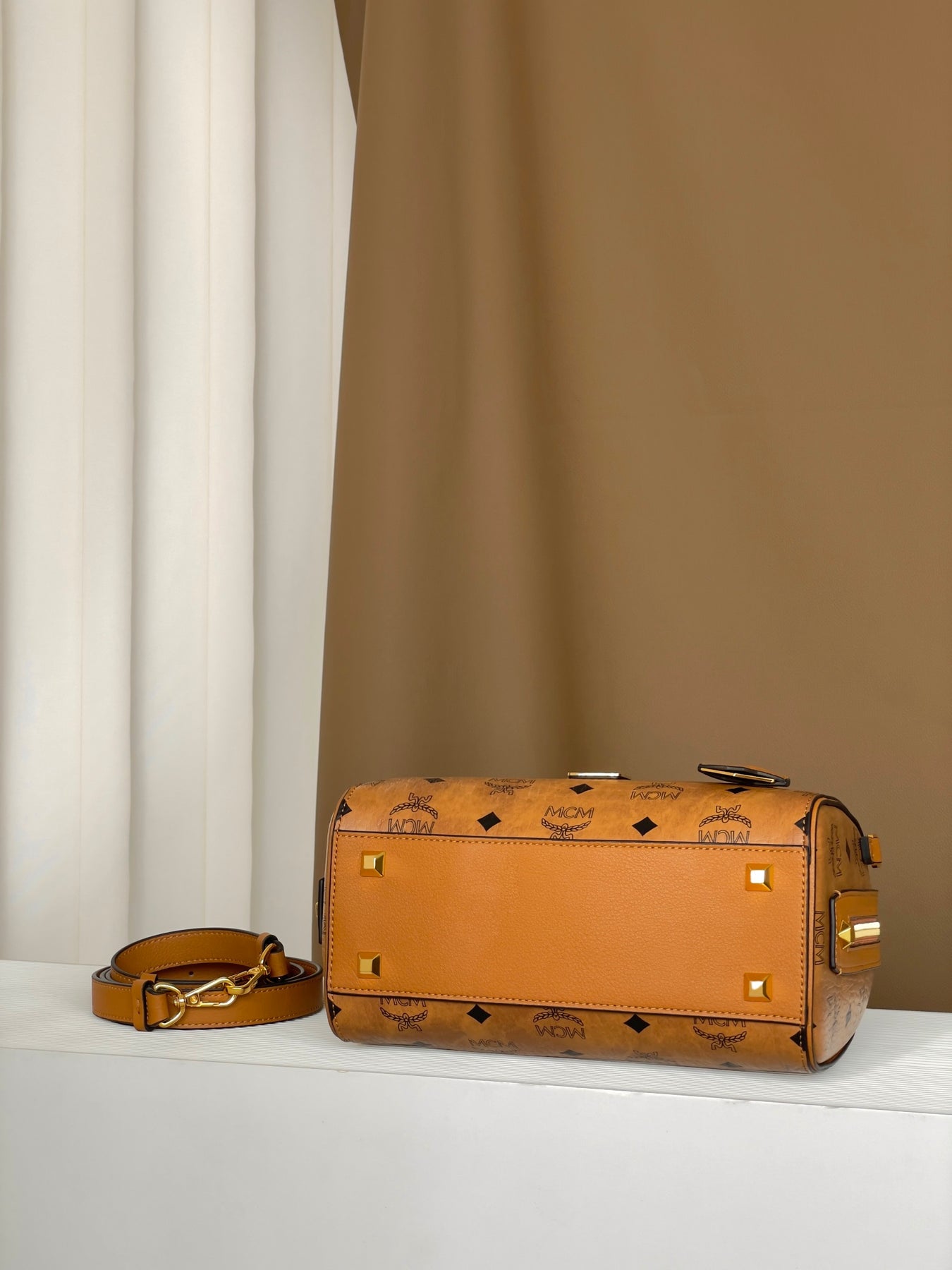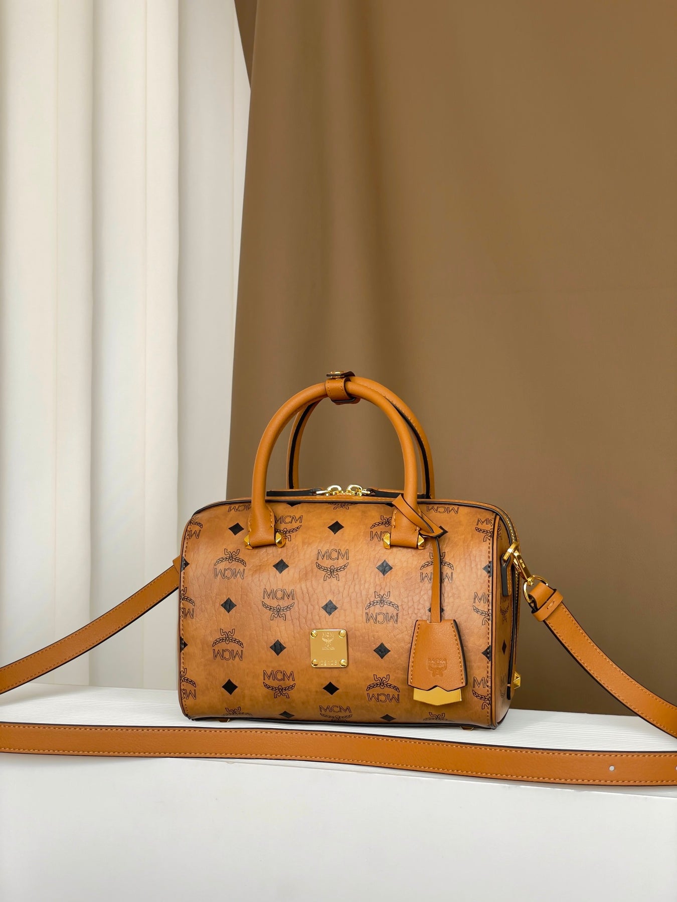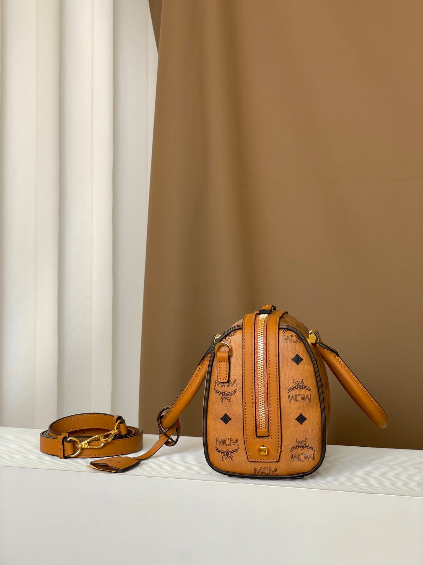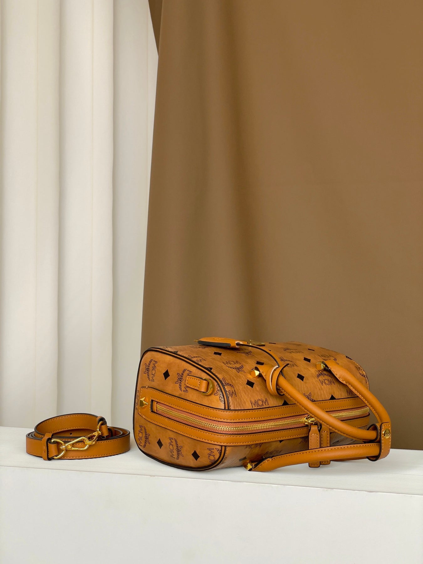 MCM Aren Visetos Small Boston Bag in Classic Cognac