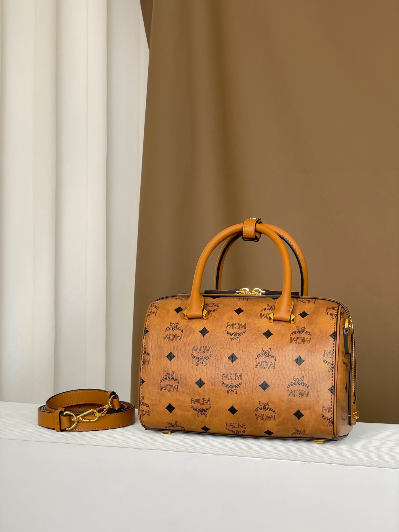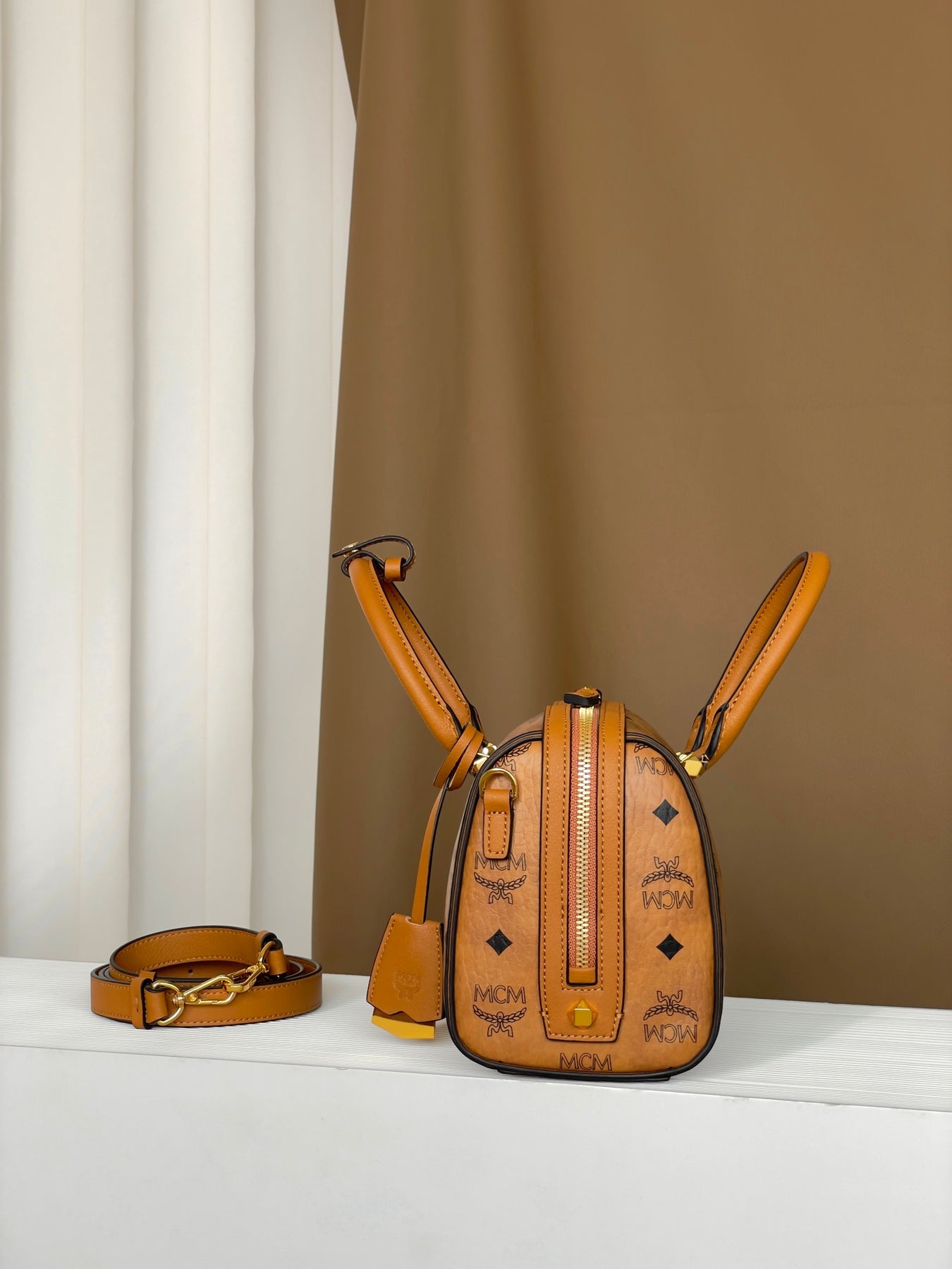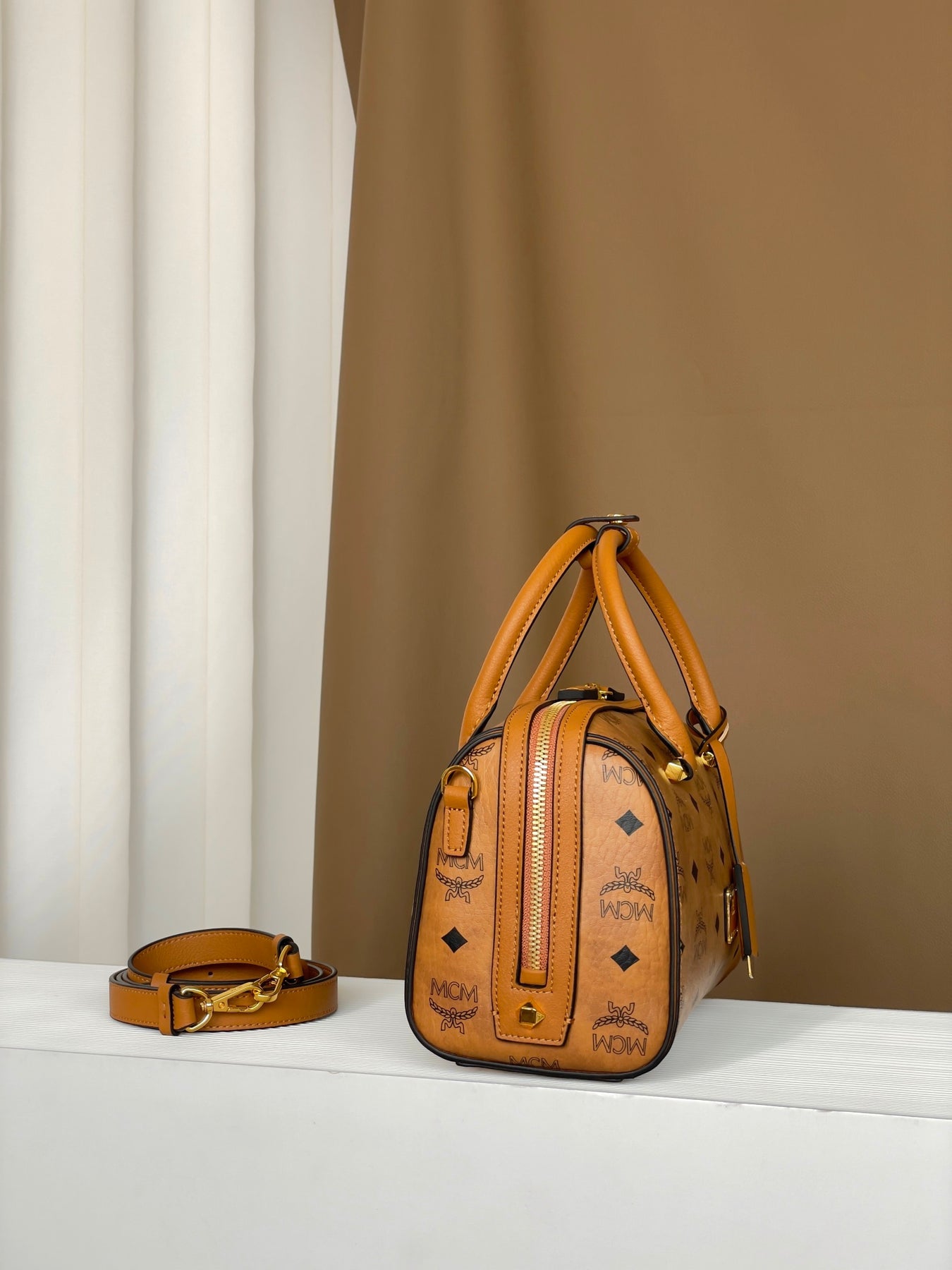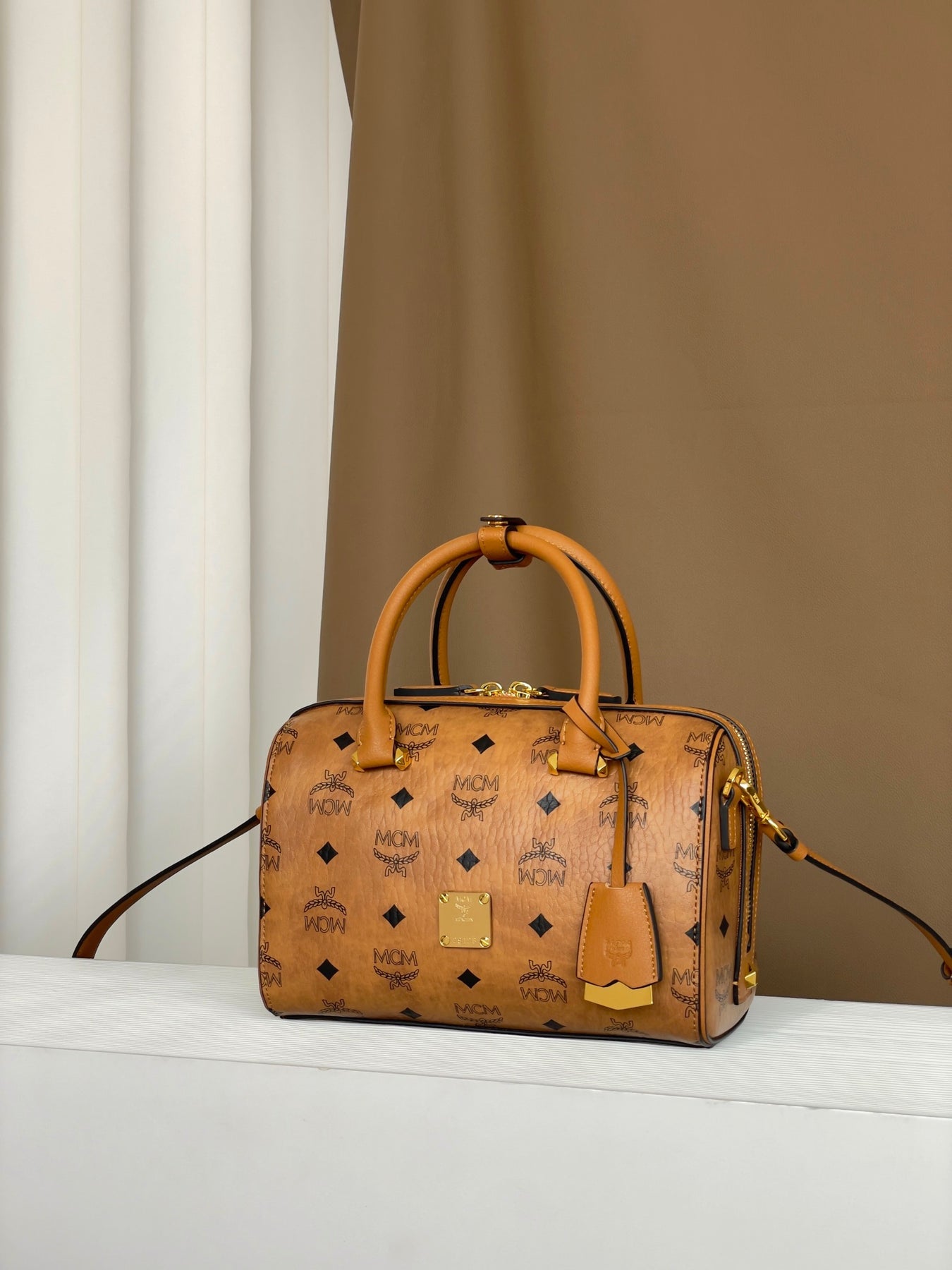 Introducing the MCM Aren Visetos Small Boston Bag, a refined take on a timeless design that embraces MCM's rich heritage in travel. This bag features a streamlined silhouette reminiscent of a weekender, enhanced by a spacious opening facilitated by an extended zipper. Crafted with precision, the top handles are expertly wrapped, stitched, and hand-painted for a luxurious finish.