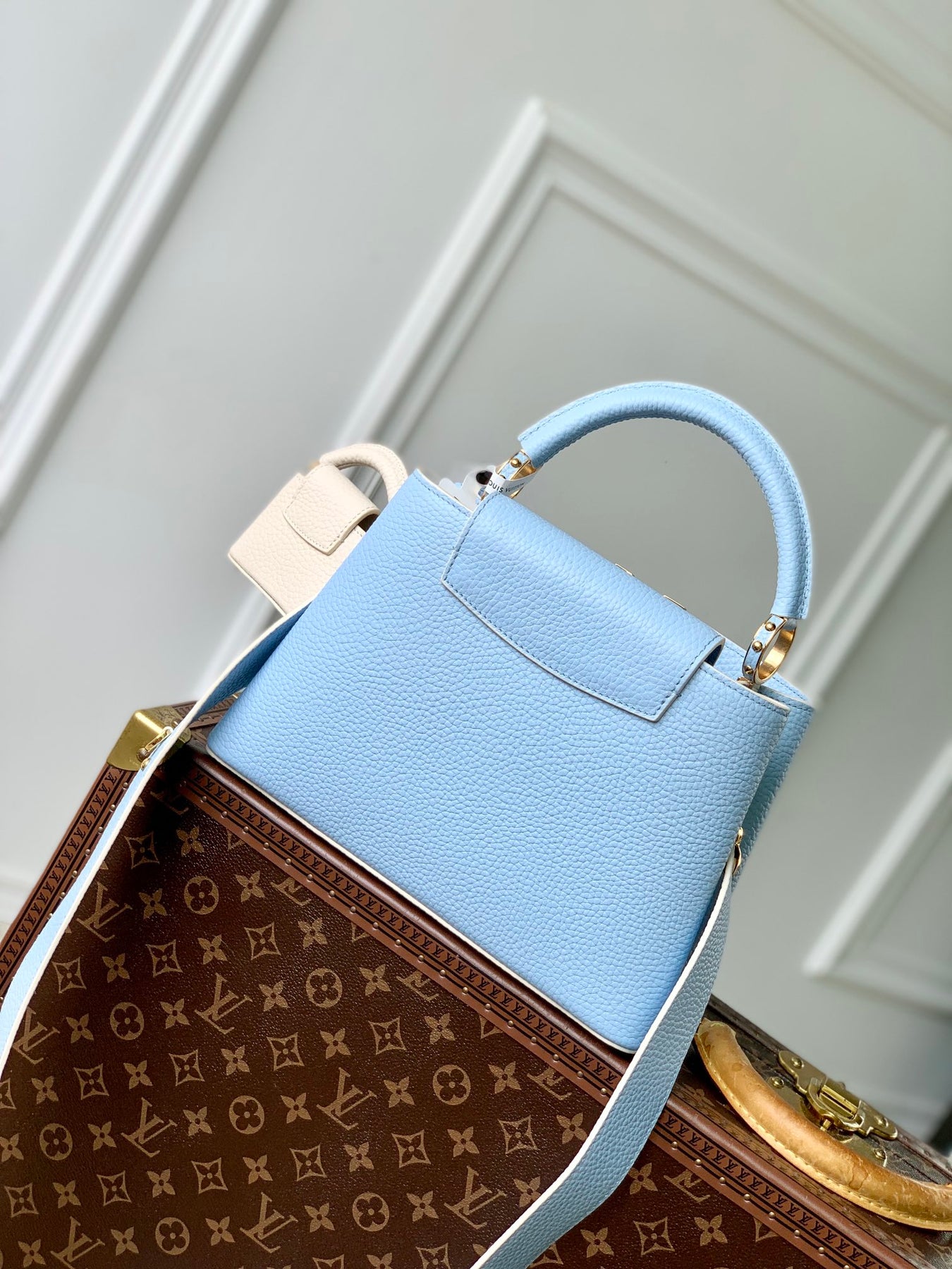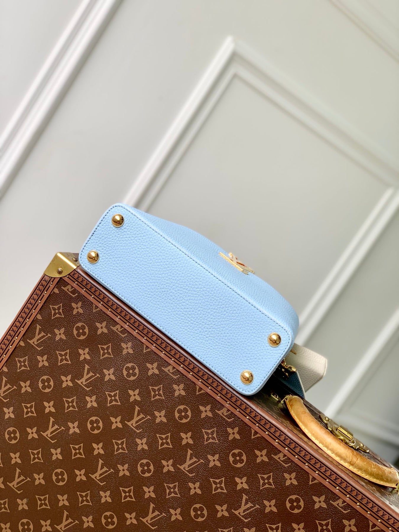 Introducing the Mini Capucines BB Bag, a stunning pocket-sized version of the iconic Capucines design. Crafted from premium Taurillon leather, this elegant blue bag features exquisite jewel-like hardware that elevates its timeless charm. The shoulder strap is adorned with a floral Monogram hook, adding a touch of glamour to your style. Despite its compact size, this stylish accessory can effortlessly hold your essentials, including a smartphone and long wallet. Perfectly sized at 26.5 x 17.5 x 9 cm (length x height x width), the Mini Capucines BB Bag is the ultimate blend of luxury and practicality.