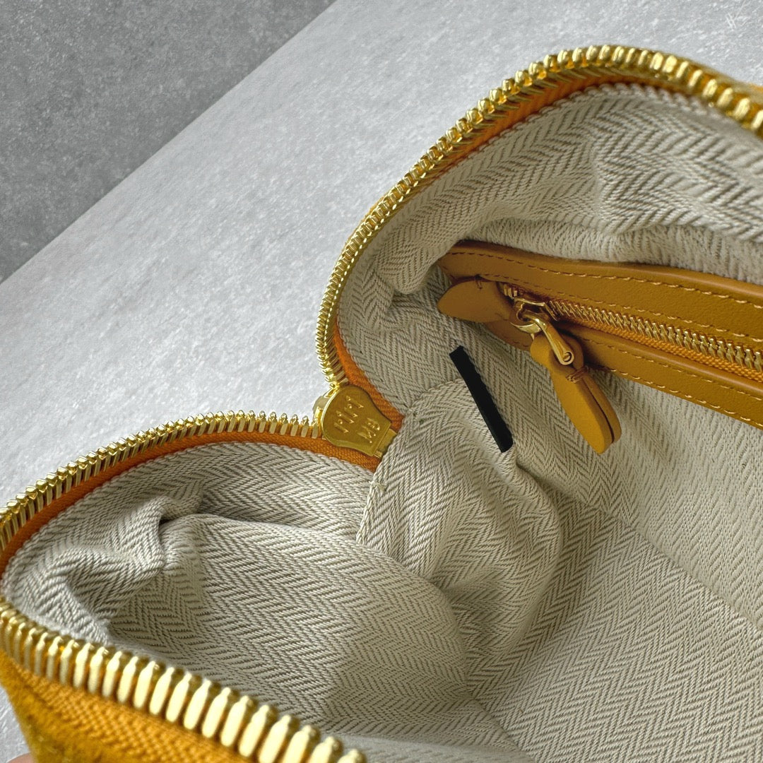 Introducing the MIUMI^24FW Autumn and Winter Suede Series Bowling Bag in a stunning small pumpkin color crafted from premium nubuck leather. This stylish piece reimagines the classic bowling bag shape, blending a timeless design with modern practicality.