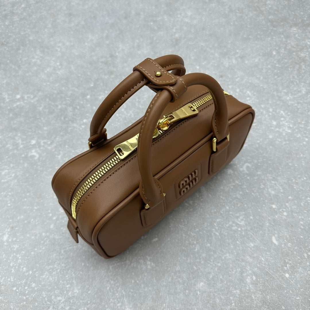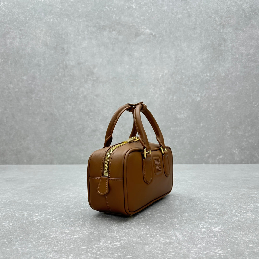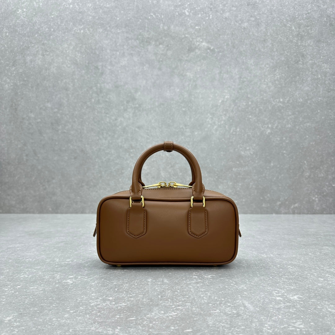 Elevate your everyday style with the MIUMI Soft Padded Bowling Bag in Small Brown. This modern interpretation of the classic bowling bag combines simplicity with functionality, offering a versatile accessory perfect for daily commutes.