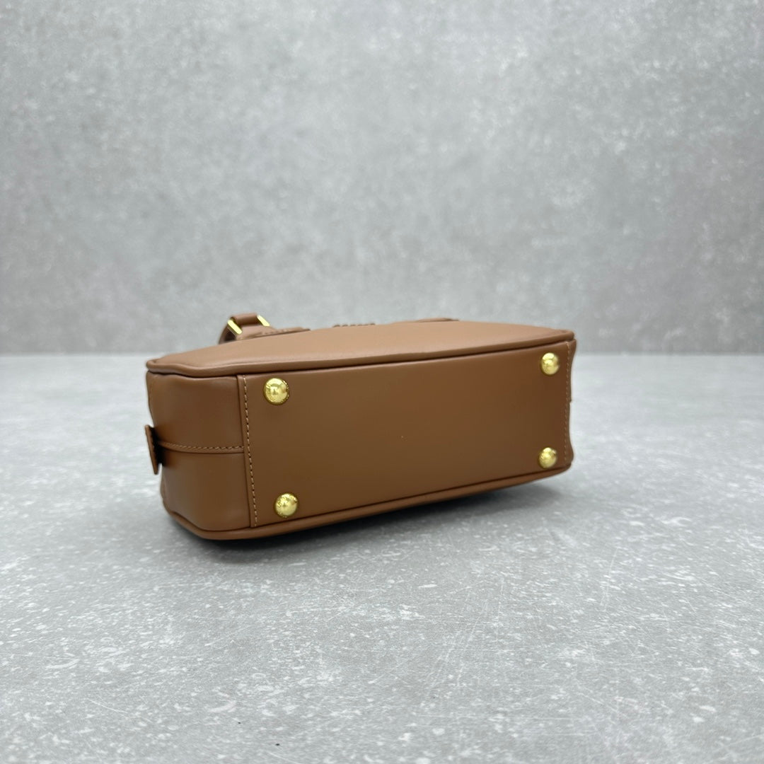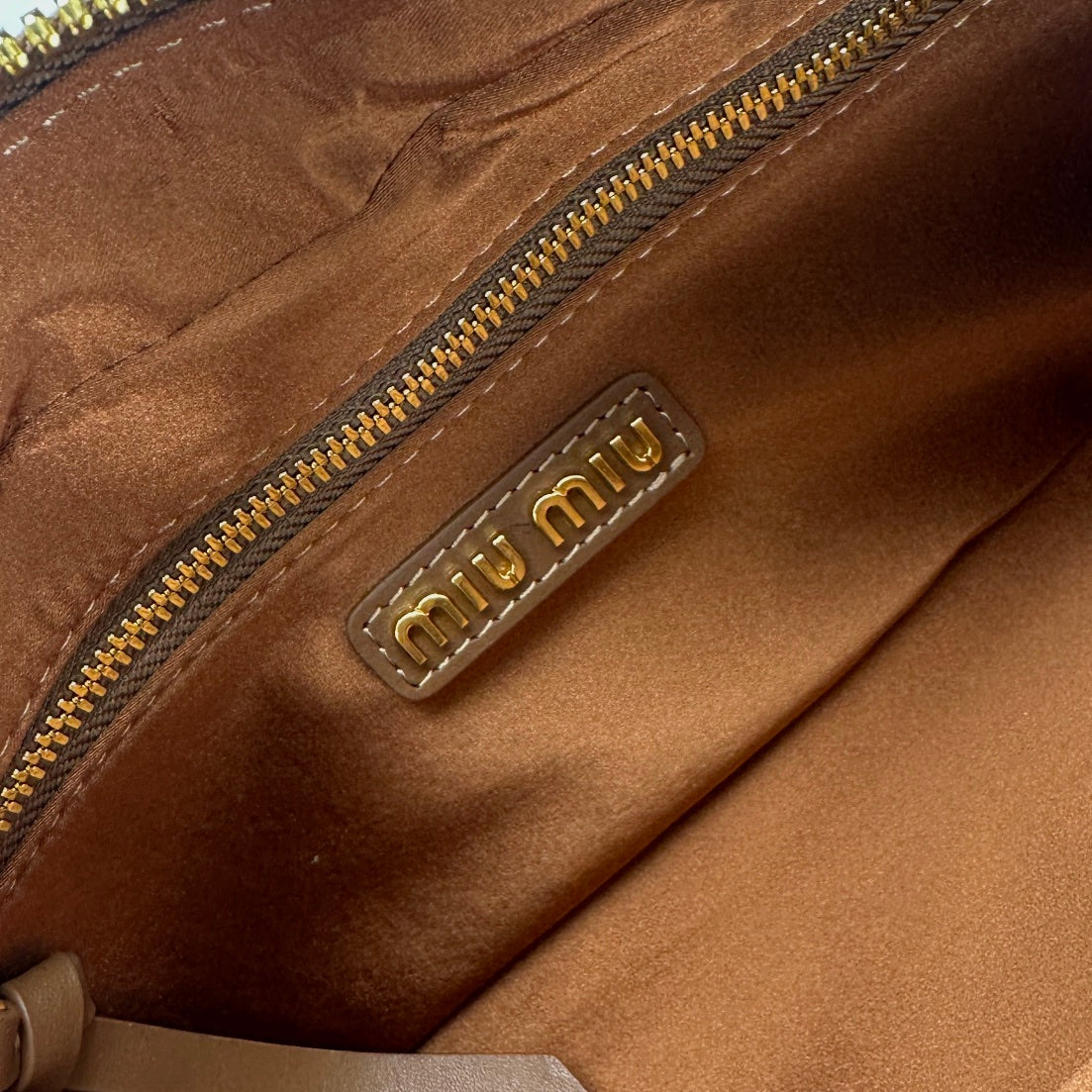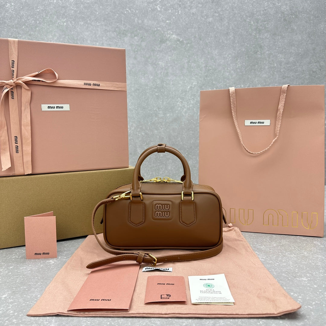 Elevate your everyday style with the MIUMI Soft Padded Bowling Bag in Small Brown. This modern interpretation of the classic bowling bag combines simplicity with functionality, offering a versatile accessory perfect for daily commutes.
