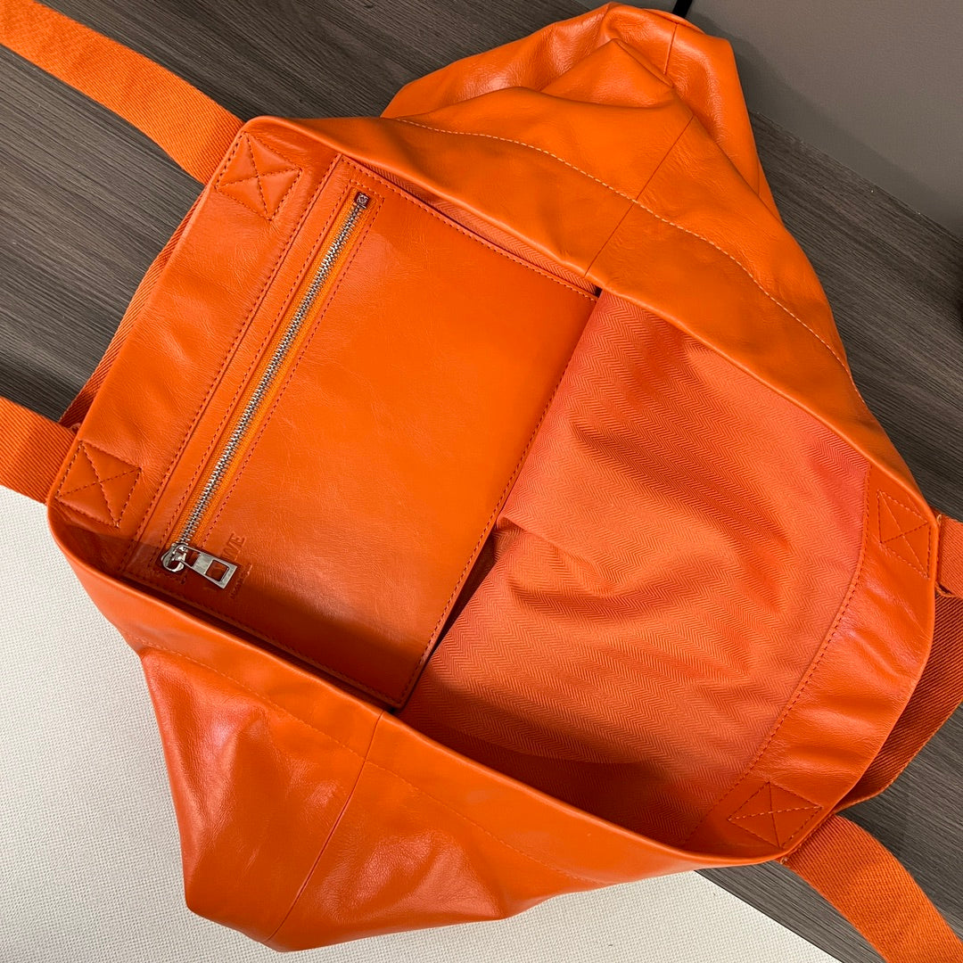Introducing our Authentic Grade Cow Leather Fold Shopper Handbag, featuring a sleek paper grain finish and stylish brand logo embellishments. This lightweight handbag boasts a versatile design, perfect for everyday use or travel. The unique folding bottom allows for easy storage, while the spacious interior can accommodate a 13-inch laptop.