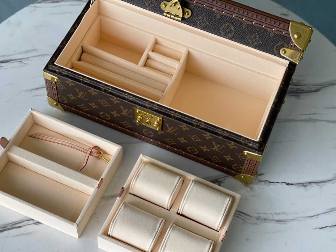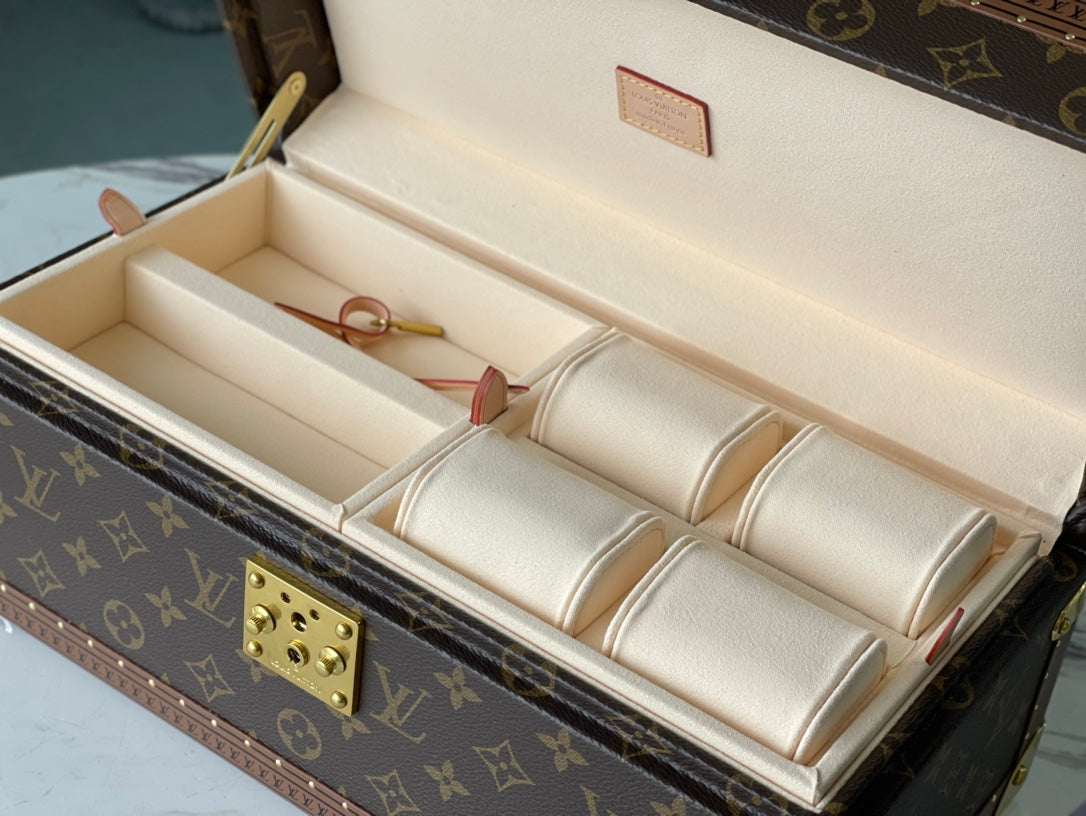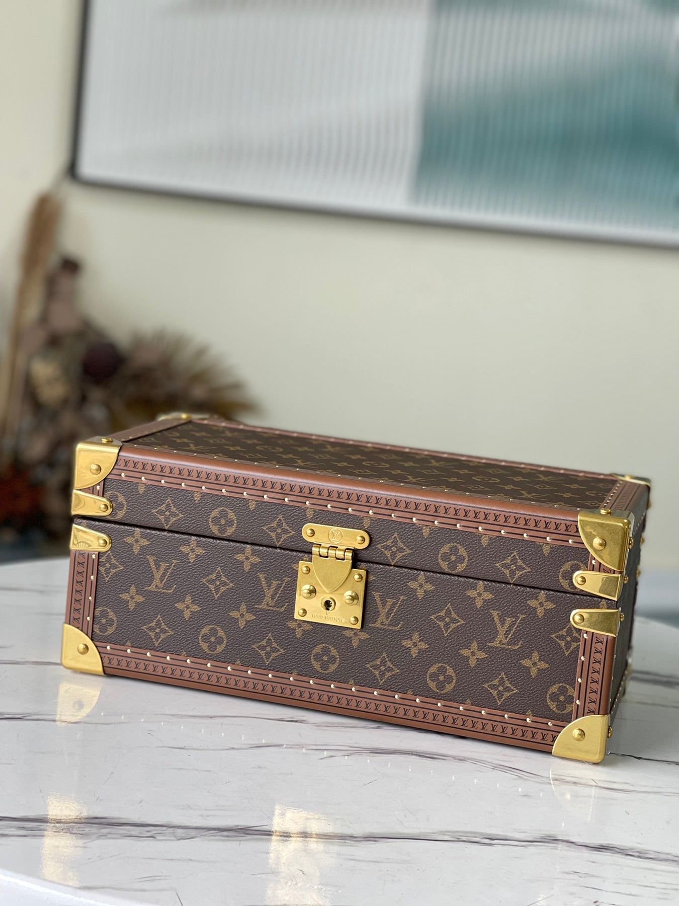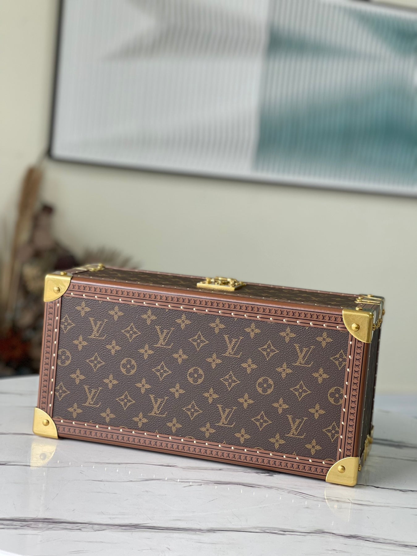 Introducing the M20209 MCoffret Accessoires Multifunctional Storage Box, crafted from luxurious Monogram canvas to echo the timeless essence of the classic Coffret 8 Montres hard case. Designed for the modern traveler, this elegant storage solution effortlessly accommodates your watches, cufflinks, sunglasses, and other essential accessories. With dimensions of 39 x 18 x 17 cm, it combines style and functionality, making it the perfect companion for those who appreciate sophistication on the go.